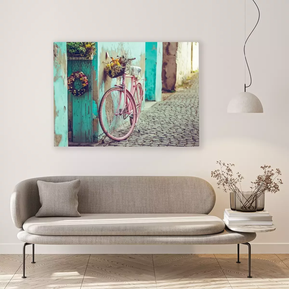 Canvas Roze vintage fiets met mand vol bloemen naast een oud cyaan gebouw in Spanje