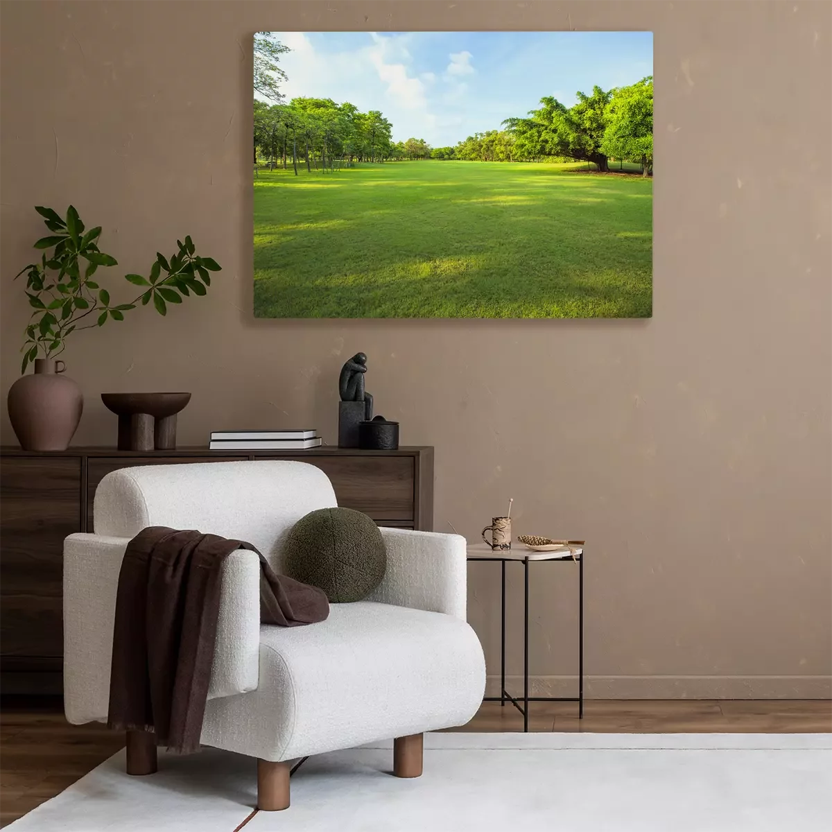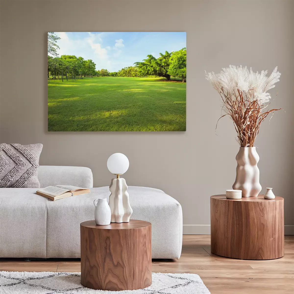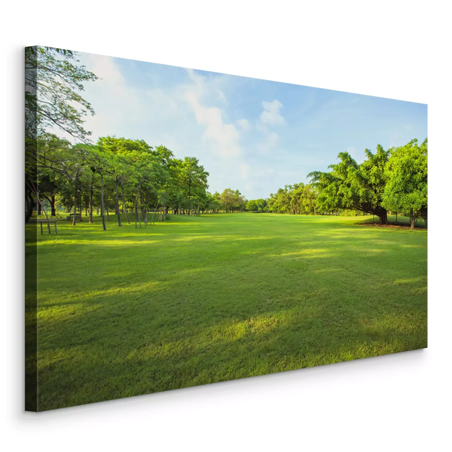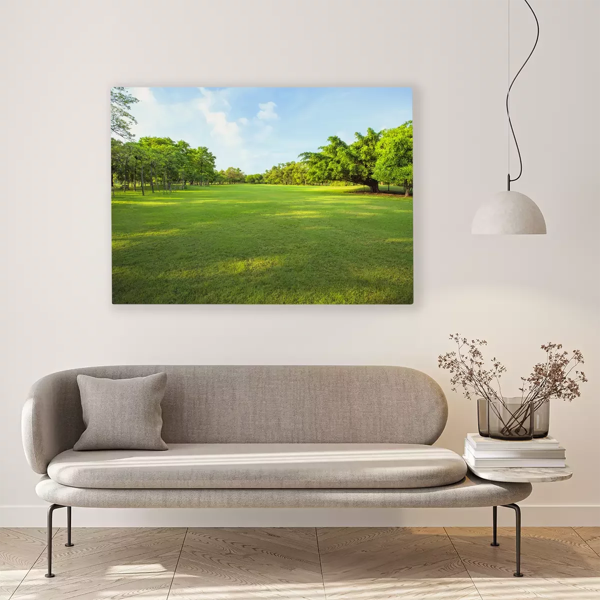 Canvas s ochtends licht in het openbaar park en groen gras tuin veld, boom