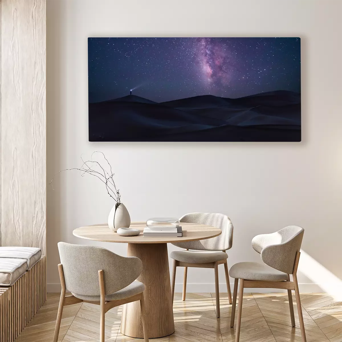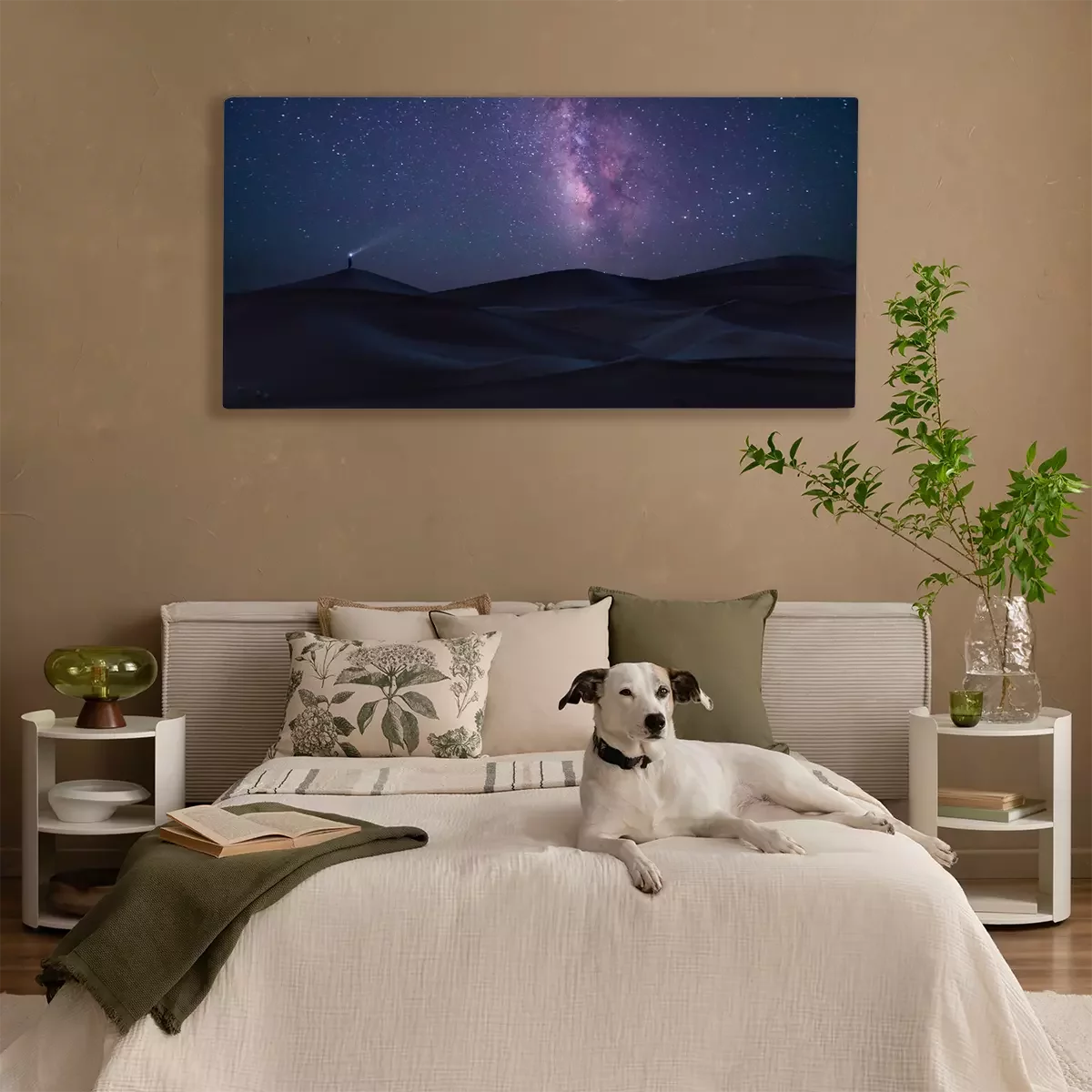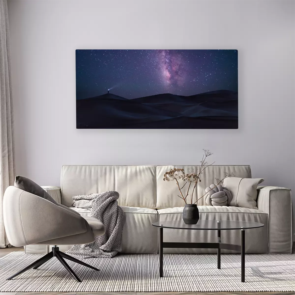 De print wordt aangebracht op hoogwaardig canvas dat op een schildersweefgetouw (spieraam) wordt gespannen. Omdat de print de zijranden bedekt, hoeft het ontwerp niet met een extra kader te worden omlijst. Wij raden ook composities aan die uit meerdere foto's bestaan en zo een coherente compositie vormen.