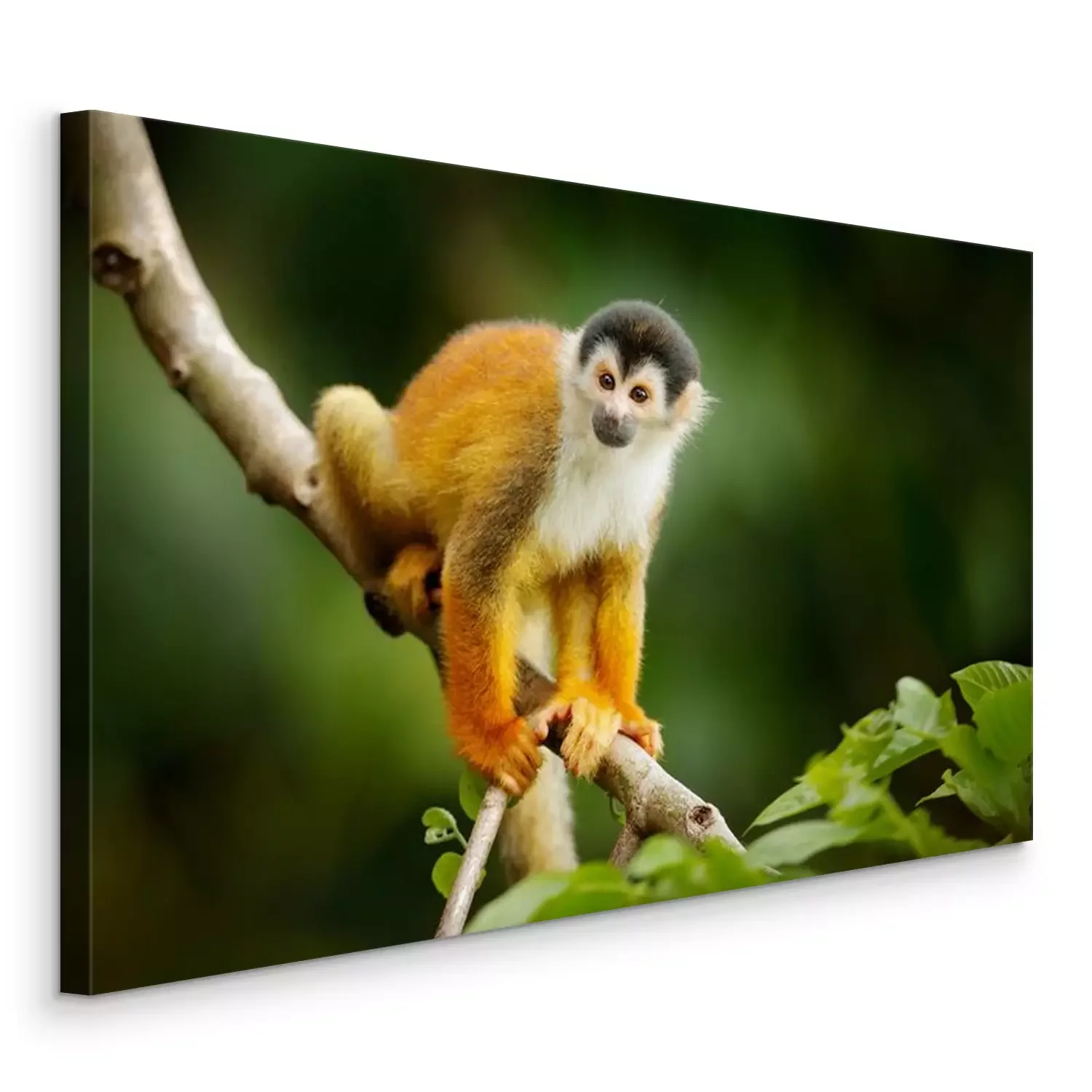 Canvas Saimiri aapje zit op de stam van een boom met groene bladeren