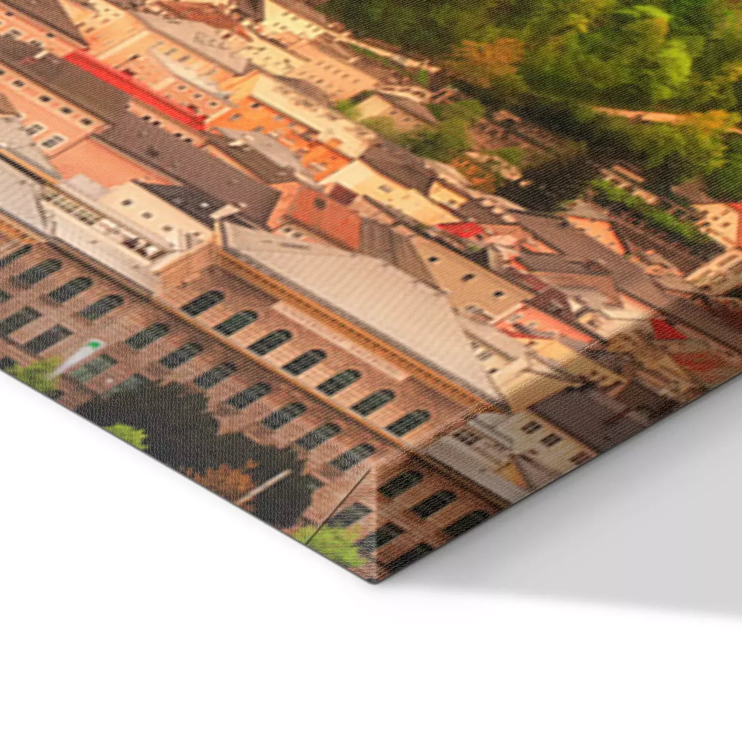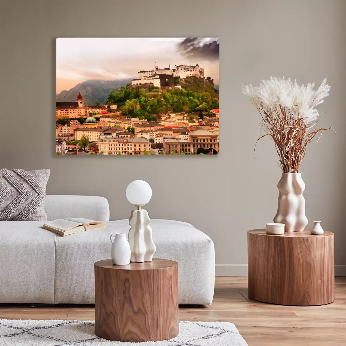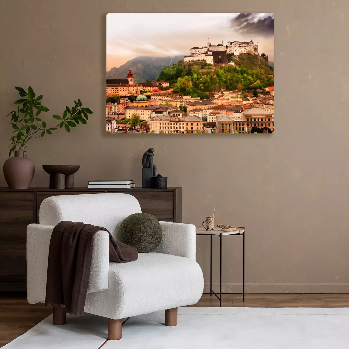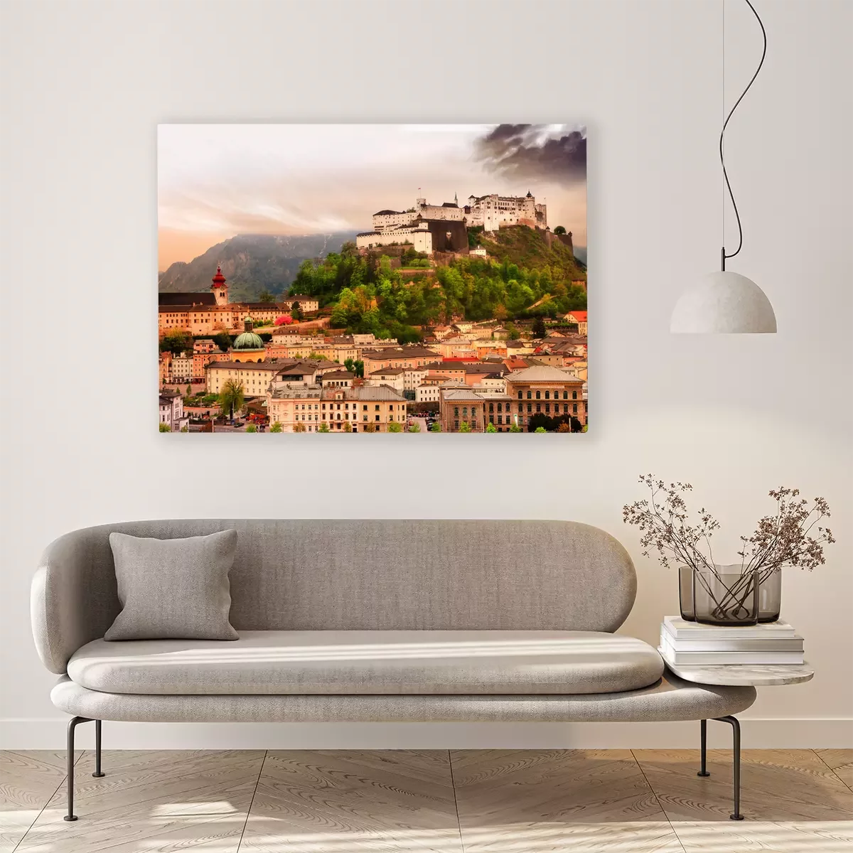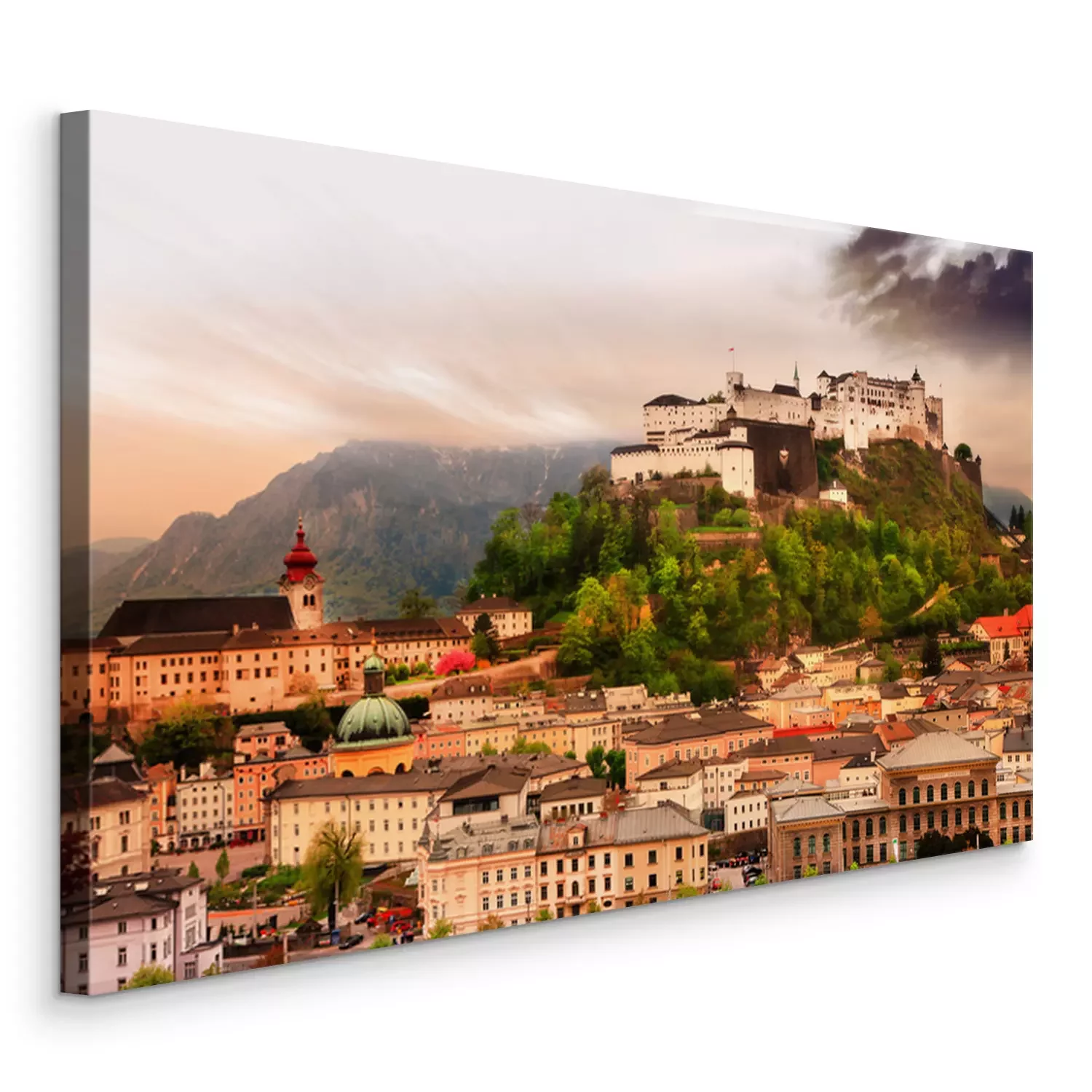 Canvas: Salzburg op zonsondergang met uitzicht op het kasteel, Oostenrijk