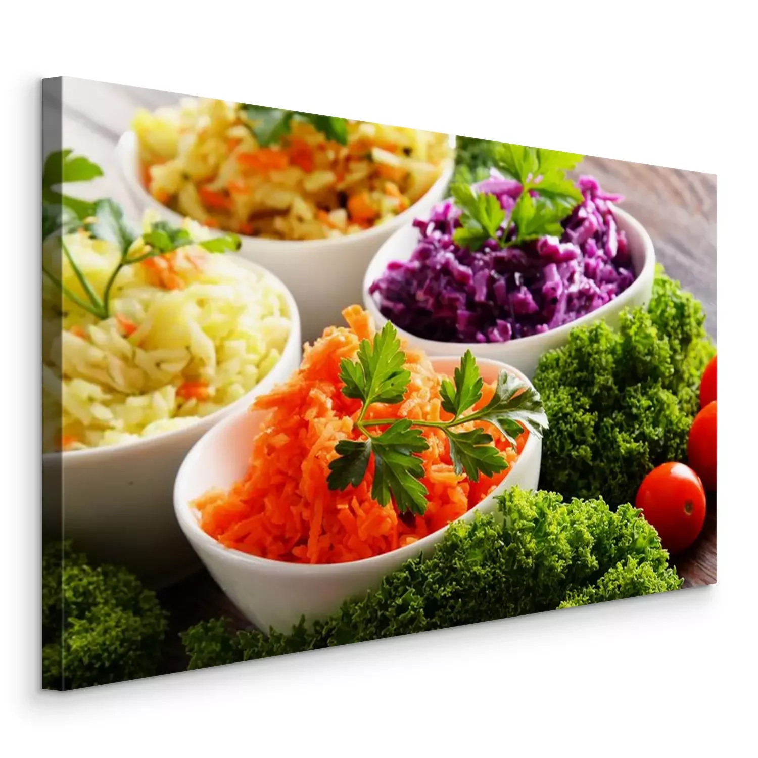 Canvas: Samenstelling met vier plantaardige salade kommen op houten tafel