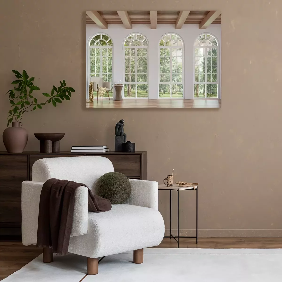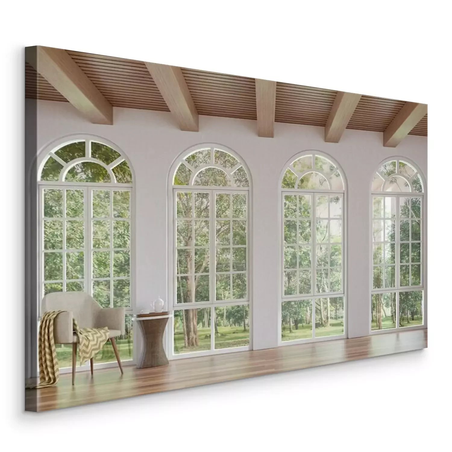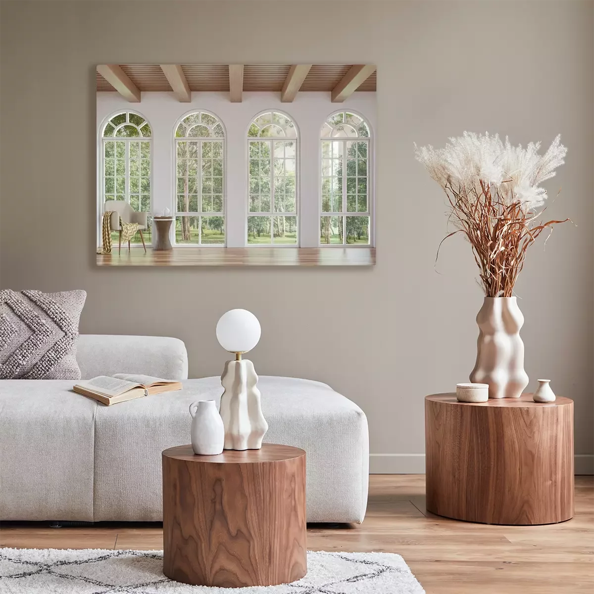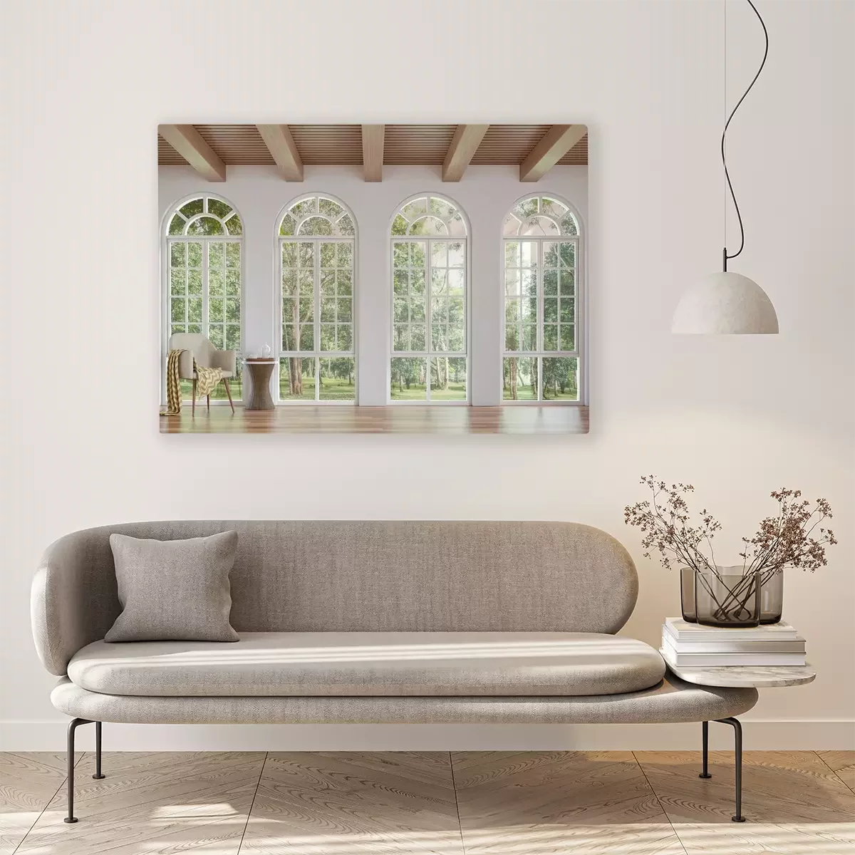 Canvas Scandinavische woonkamer 3D-rendering afbeelding. De kamers hebben houten vloeren en plafonds met witte muren. Er zijn boog vorm venster met uitzicht op de natuur.