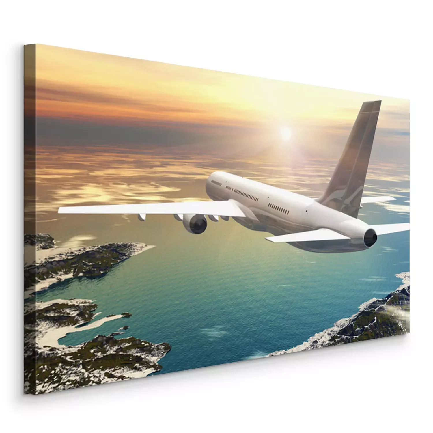Canvas Scenic passagiersvliegtuig vlucht in zonsondergang