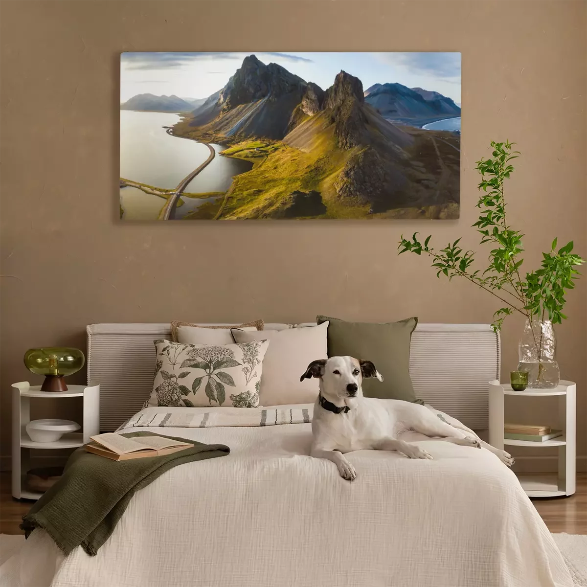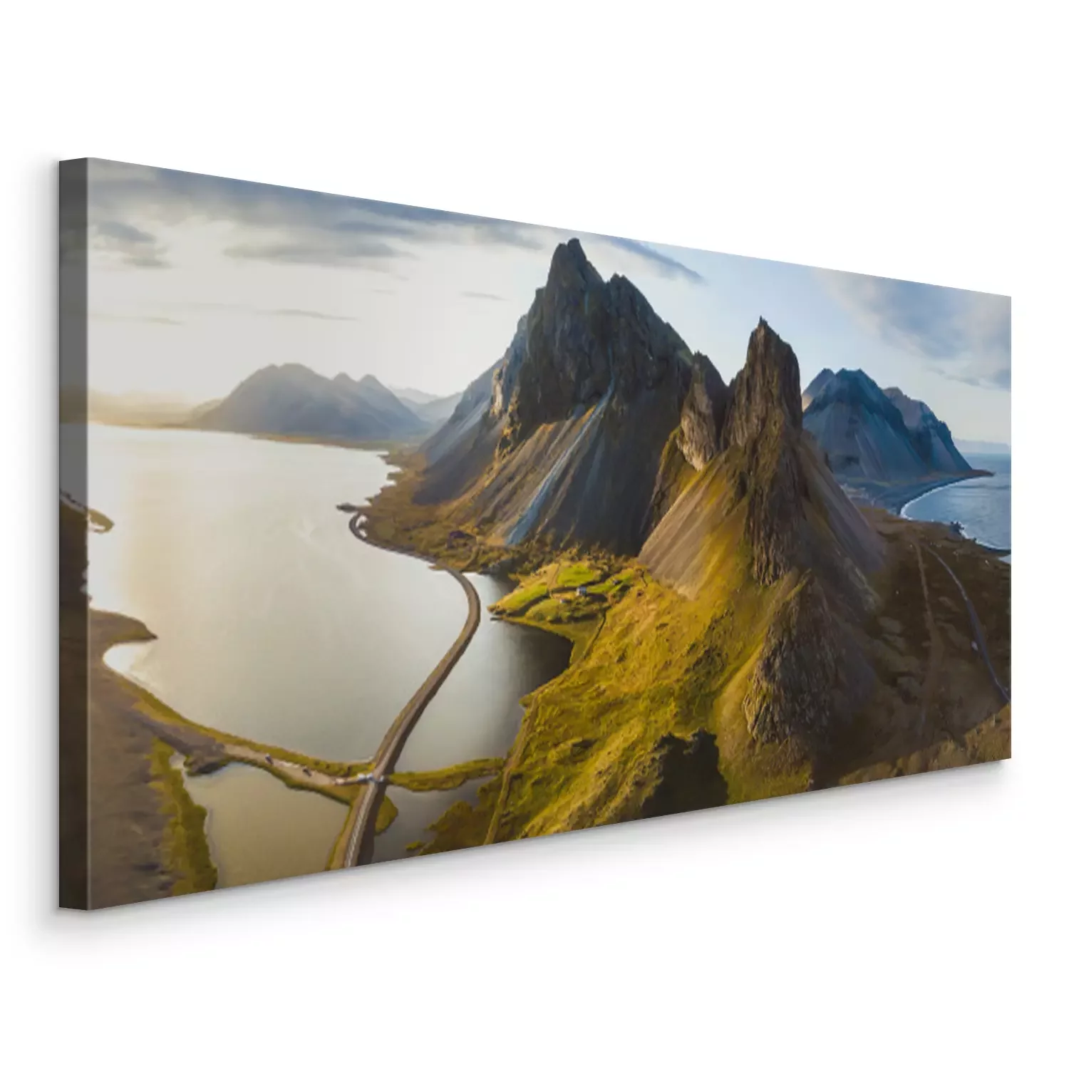 Canvas scenic road in Iceland, beautiful nature landscape aerial panorama, mountains and coast at sunset