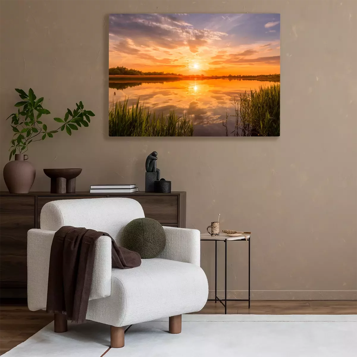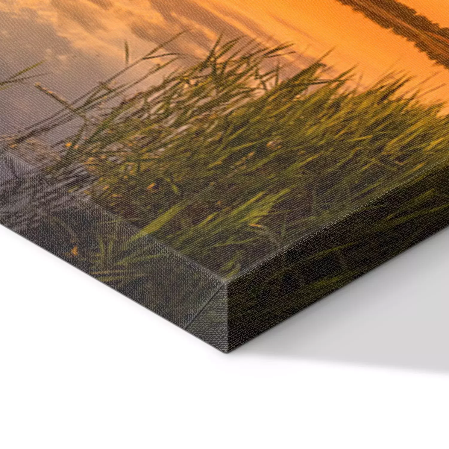 Canvas: Scenic view of beautiful sunrise or dawn above the pond or lake at spring or early summer morning with cloudy sky background, fog over water and reed grass with dew at foreground. Landscape. Water ref