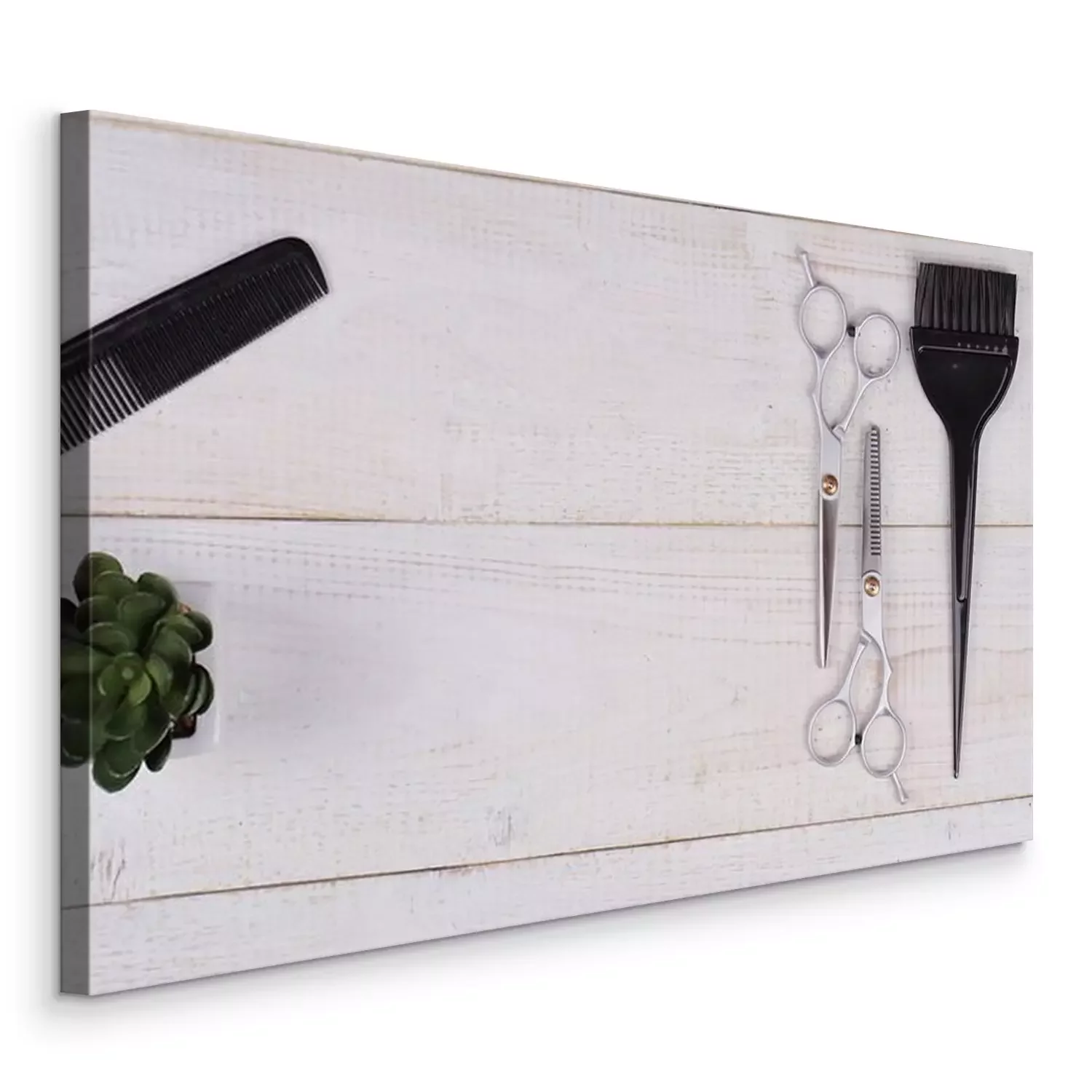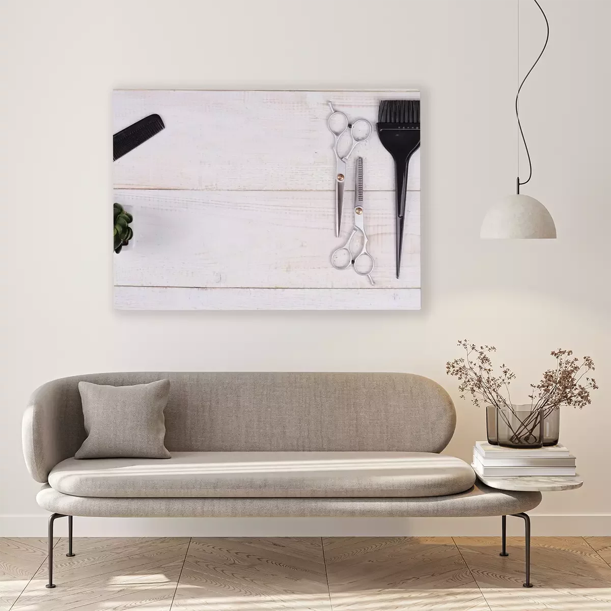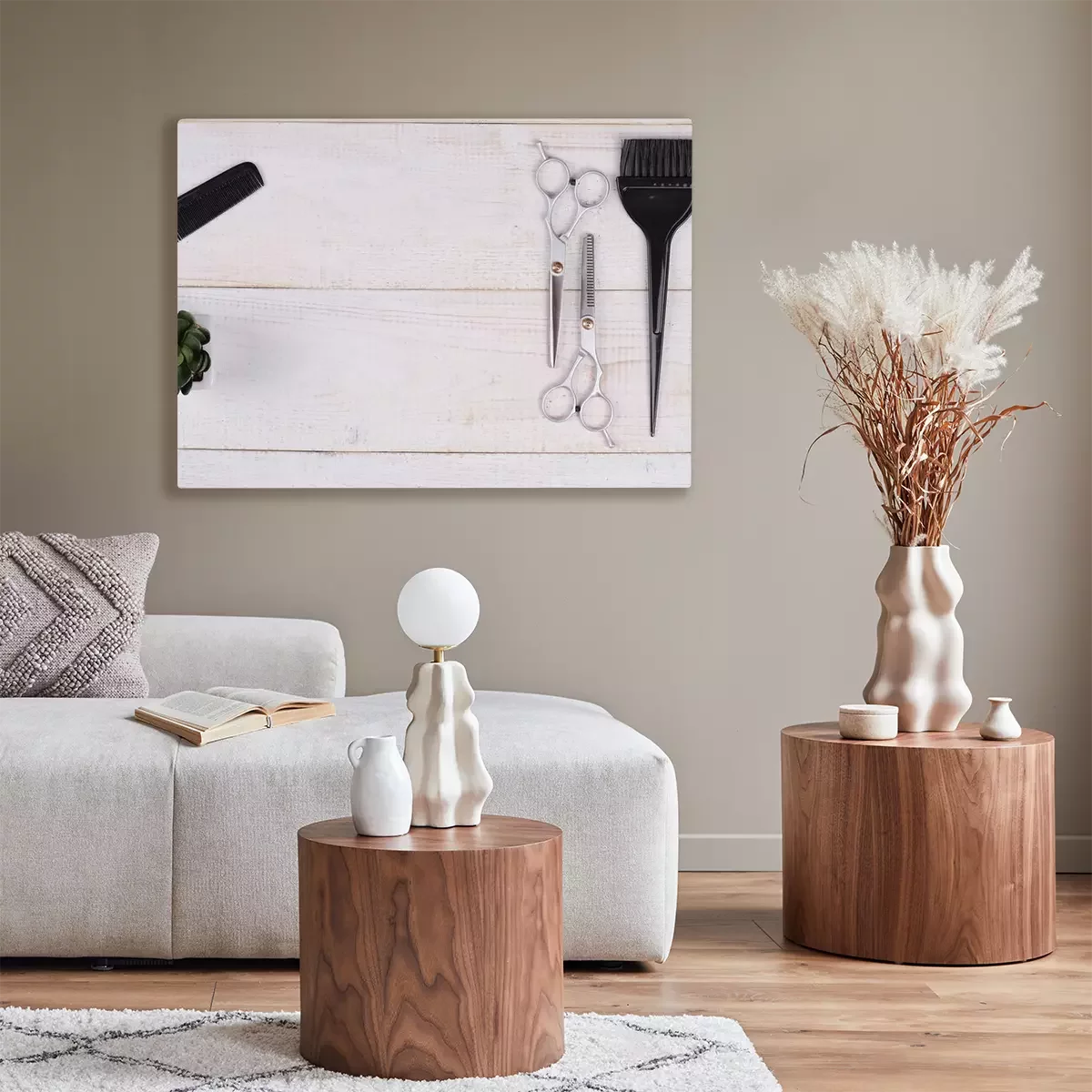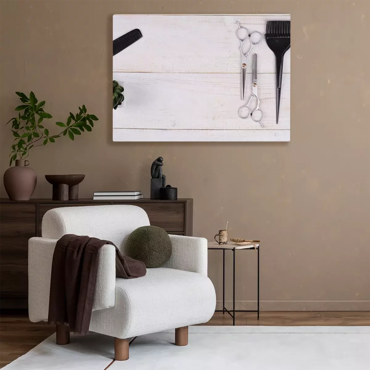 Canvas Schaar, COMn en borstel voor haarkleuring op witte rustieke houten achtergrond. Kapsalon concept. haircut accessoires