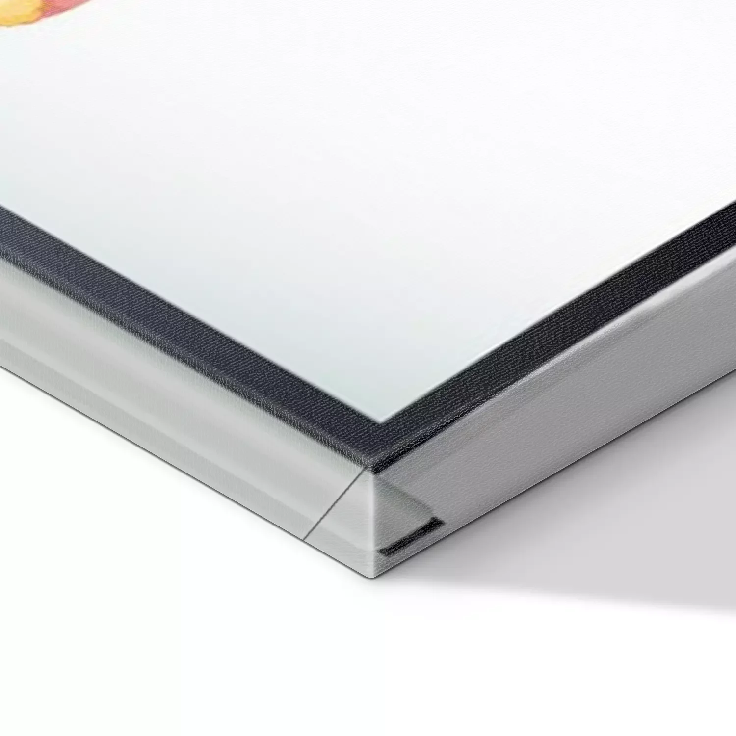 De print wordt aangebracht op hoogwaardig canvas dat op een schildersweefgetouw (spieraam) wordt gespannen. Omdat de print de zijranden bedekt, hoeft het ontwerp niet met een extra kader te worden omlijst. Wij raden ook composities aan die uit meerdere foto's bestaan en zo een coherente compositie vormen.