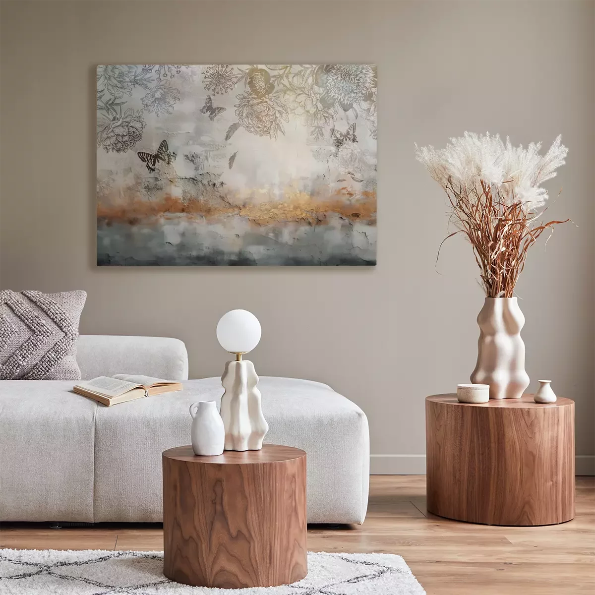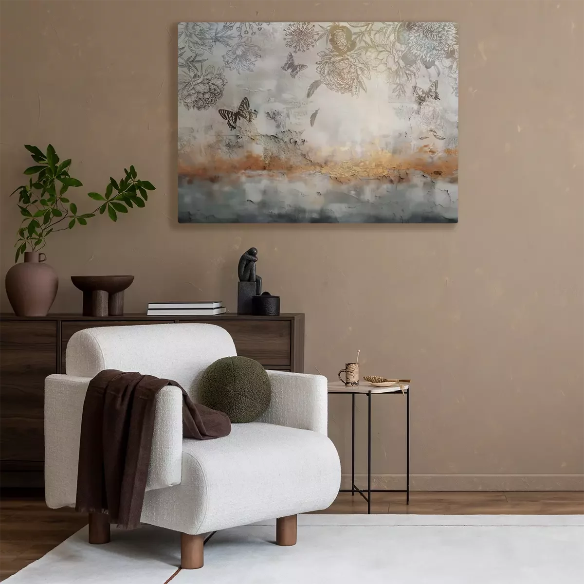 Schets van bloemen en vlinders op een betonnen muur