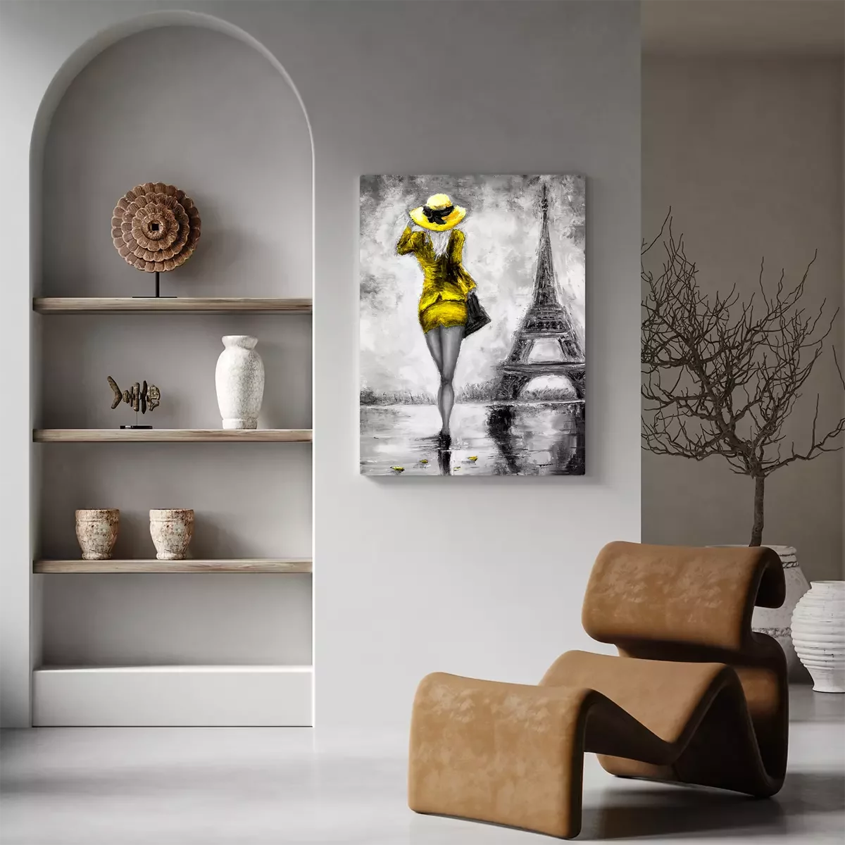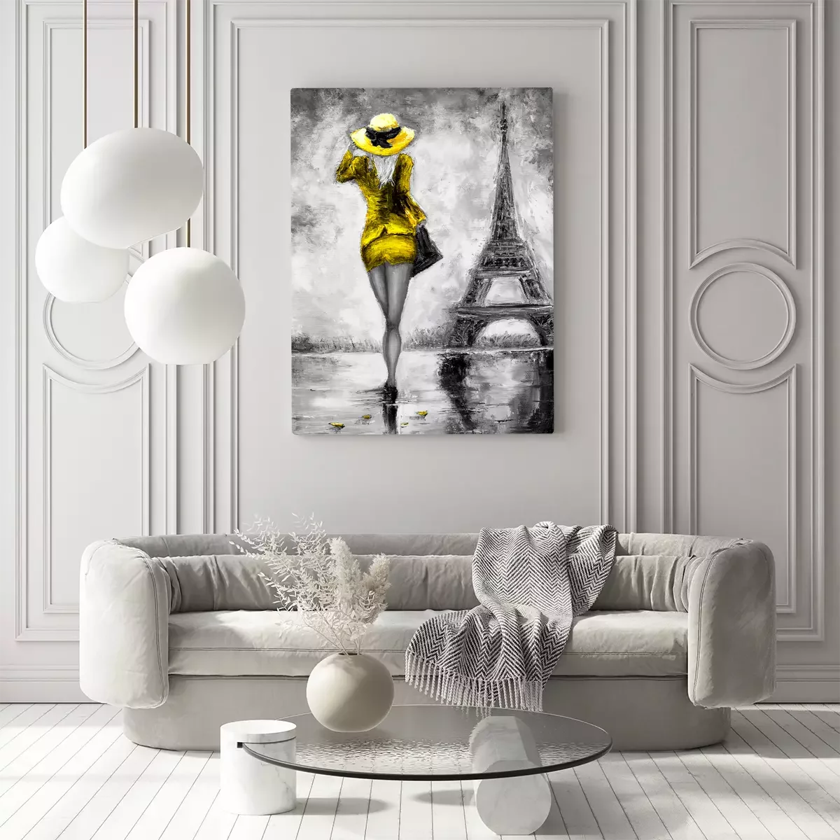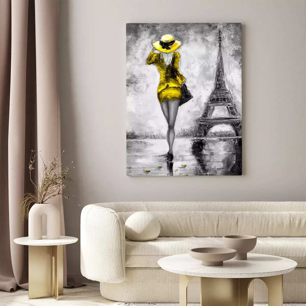 Schets van een vrouw in een jurk en hoed met de eiffeltoren op de achtergrond
