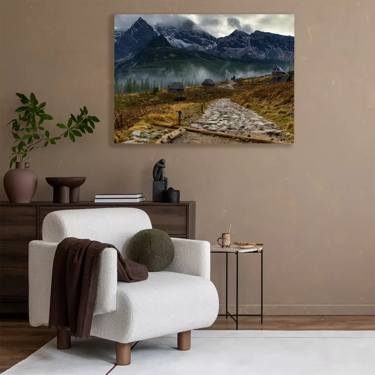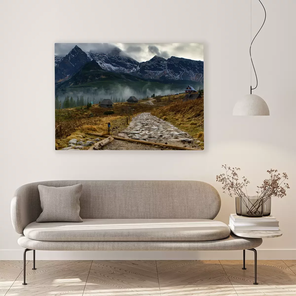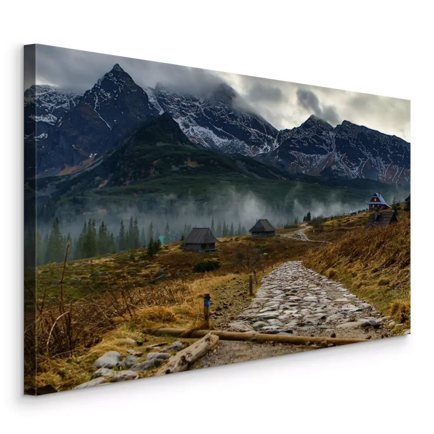 Canvas: Schilderachtig uitzicht op bergtoppen in de mist