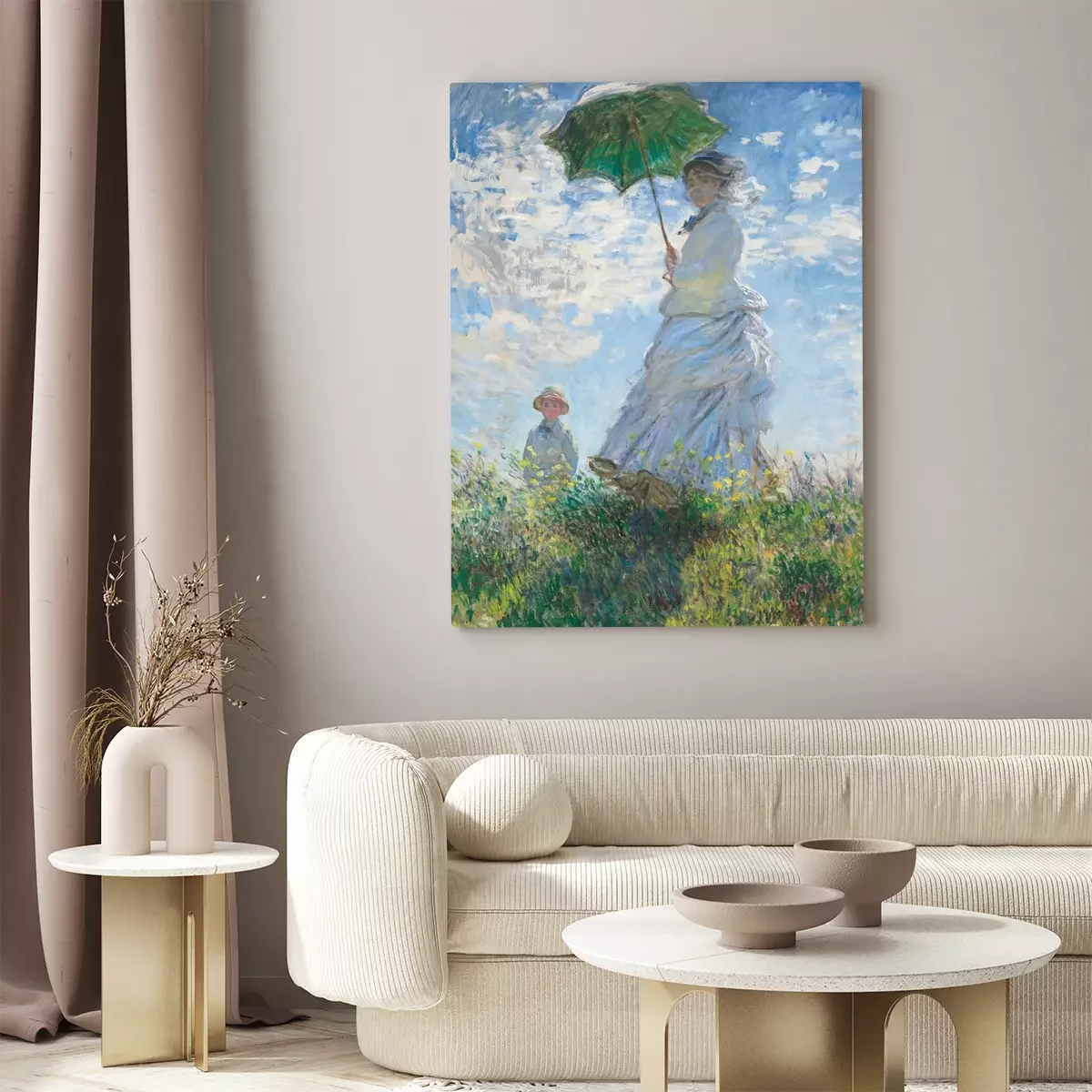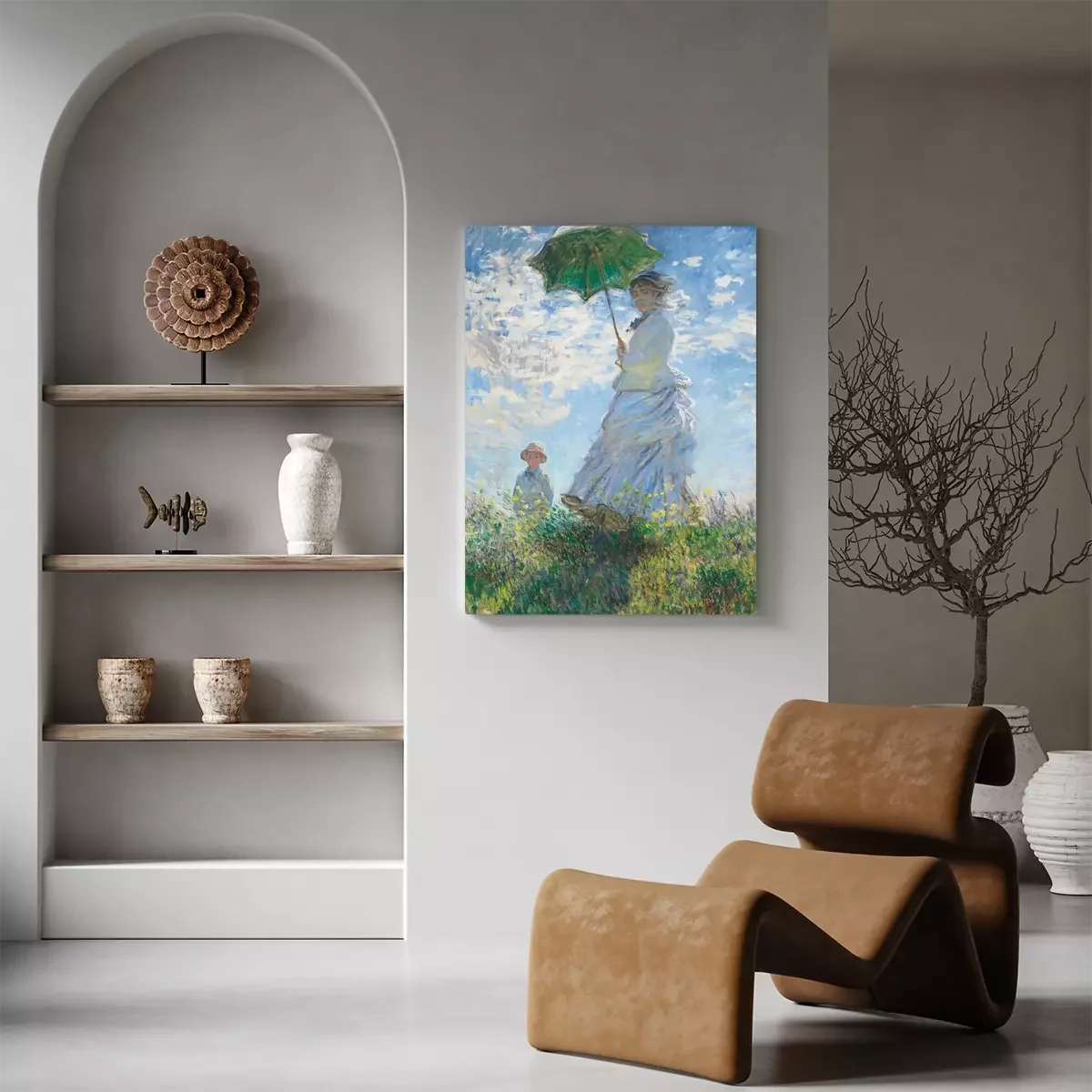 Schilderij van een vrouw met een paraplu en een jongen