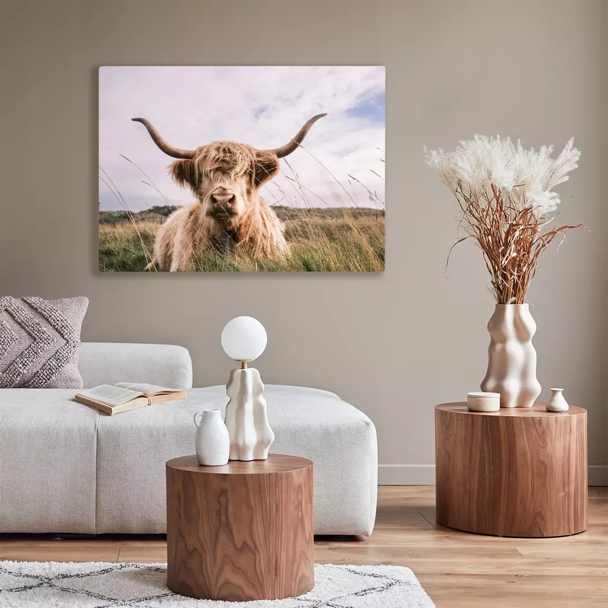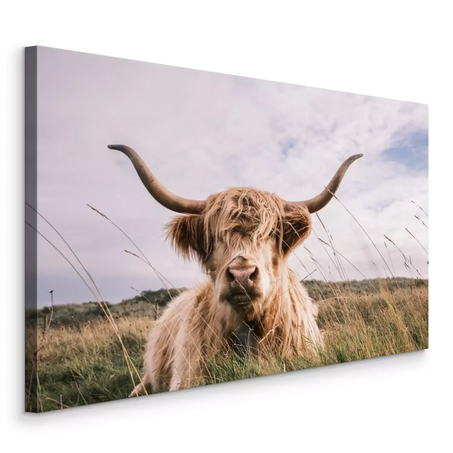 Canvas: Schotse hooglandkoe die in het gras ligt
