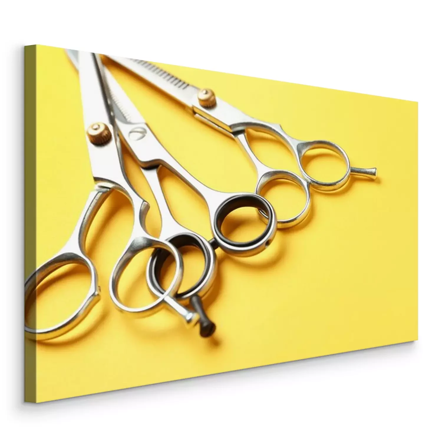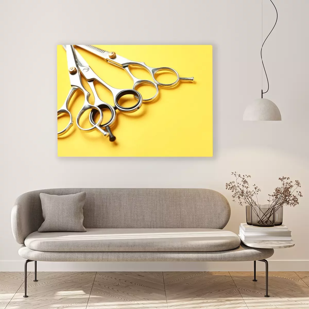 Canvas: Scissors and space for text on color background, closeup. Hairdresser tools