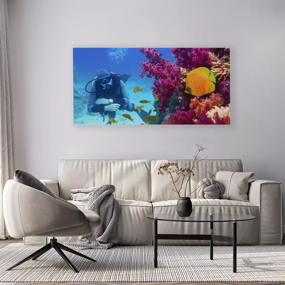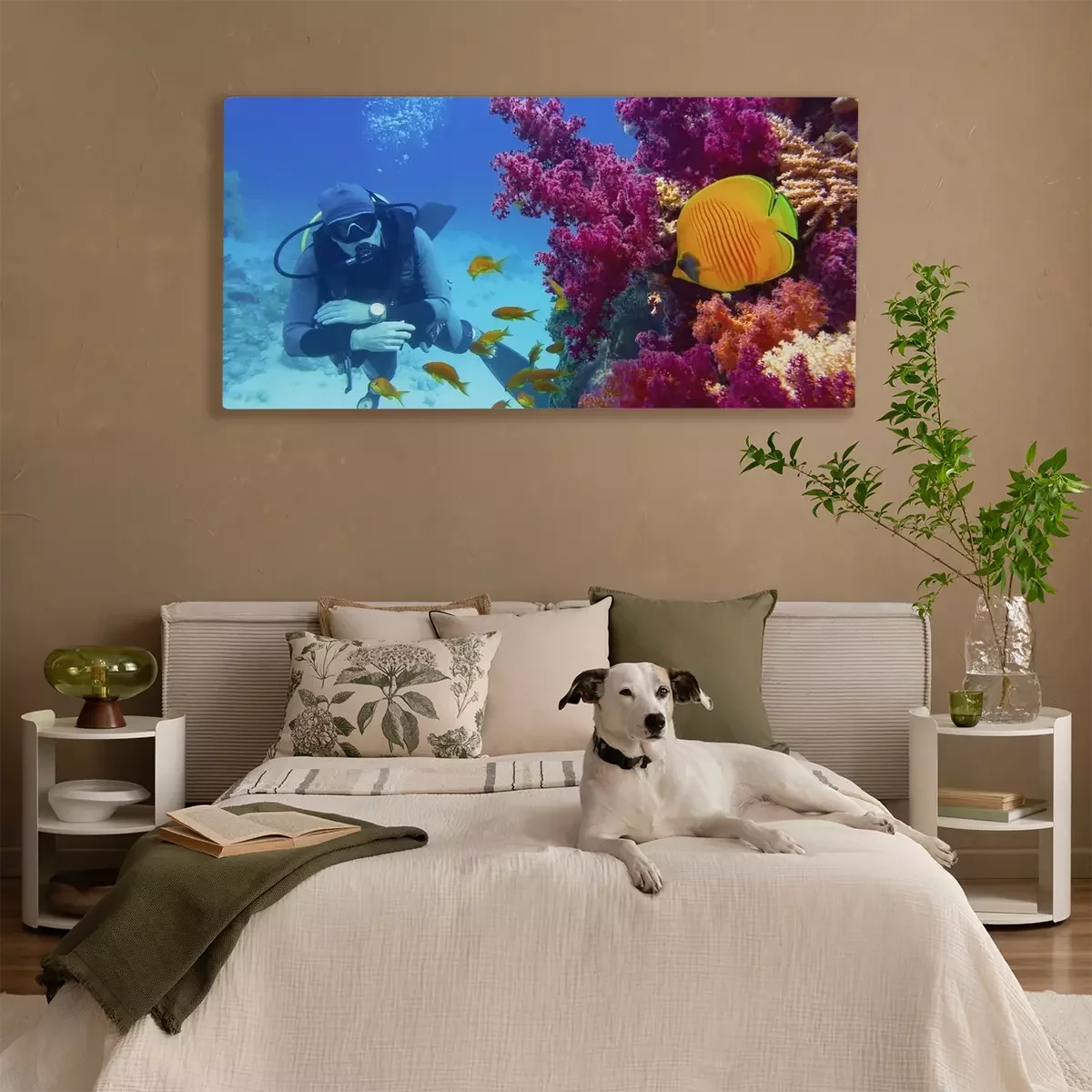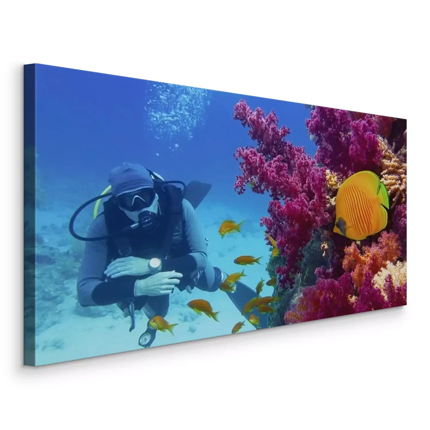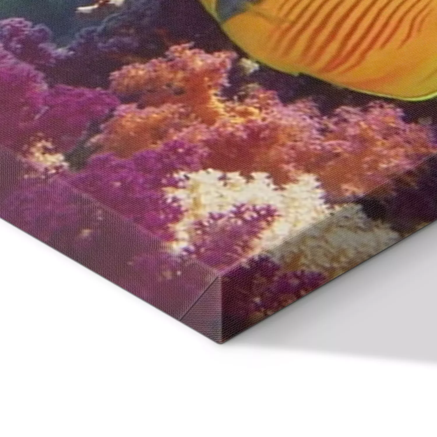 Canvas: Scuba diver watching beautiful coral reef with purple soft corals and beautiful yellow butterfly coral fish