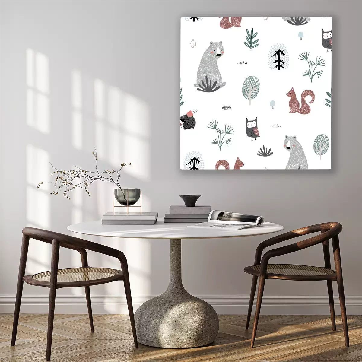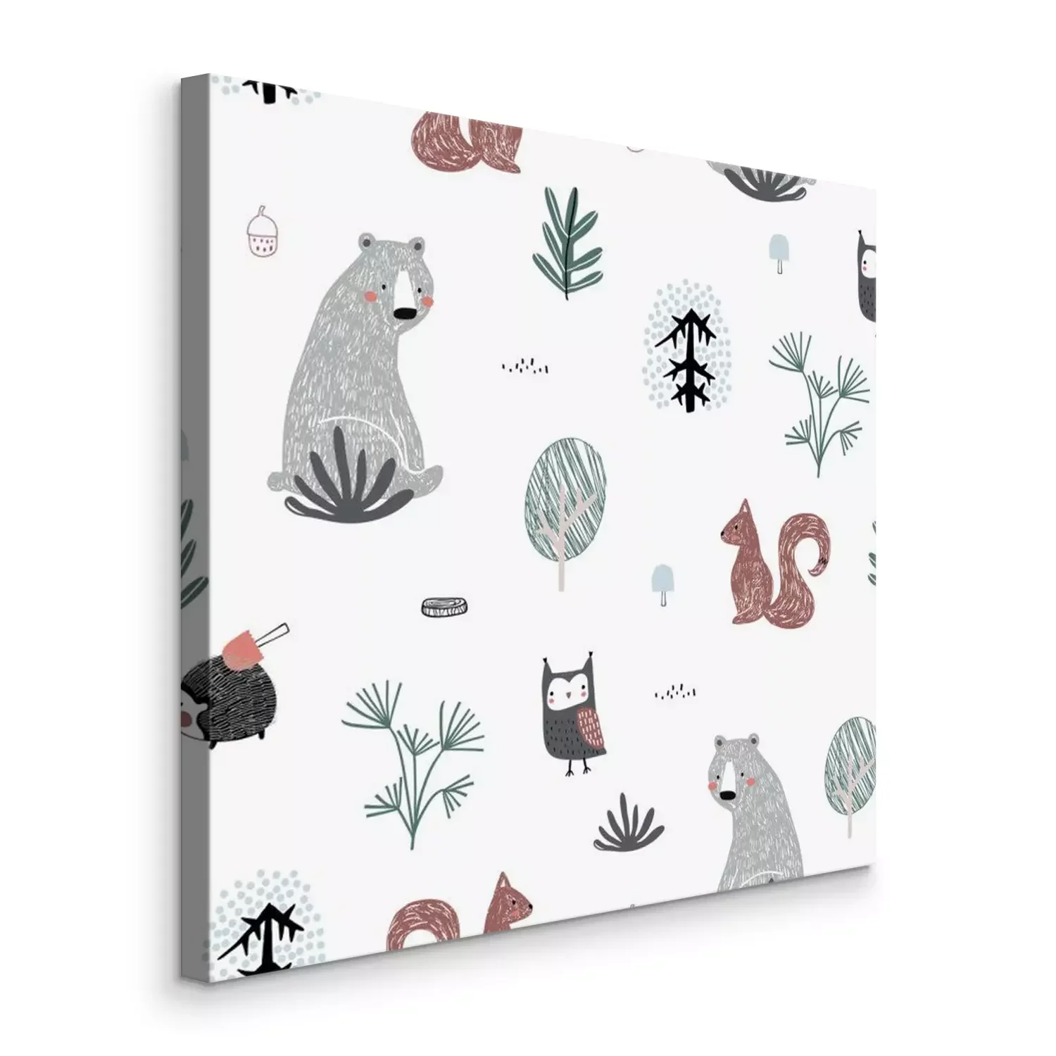 Canvas Seamless childish pattern with cute bear, squirrels, owl, hedgehog in the wood. Creative kids forest texture for fabric, wrapping, textile, wallpaper, apparel. Vector illustration