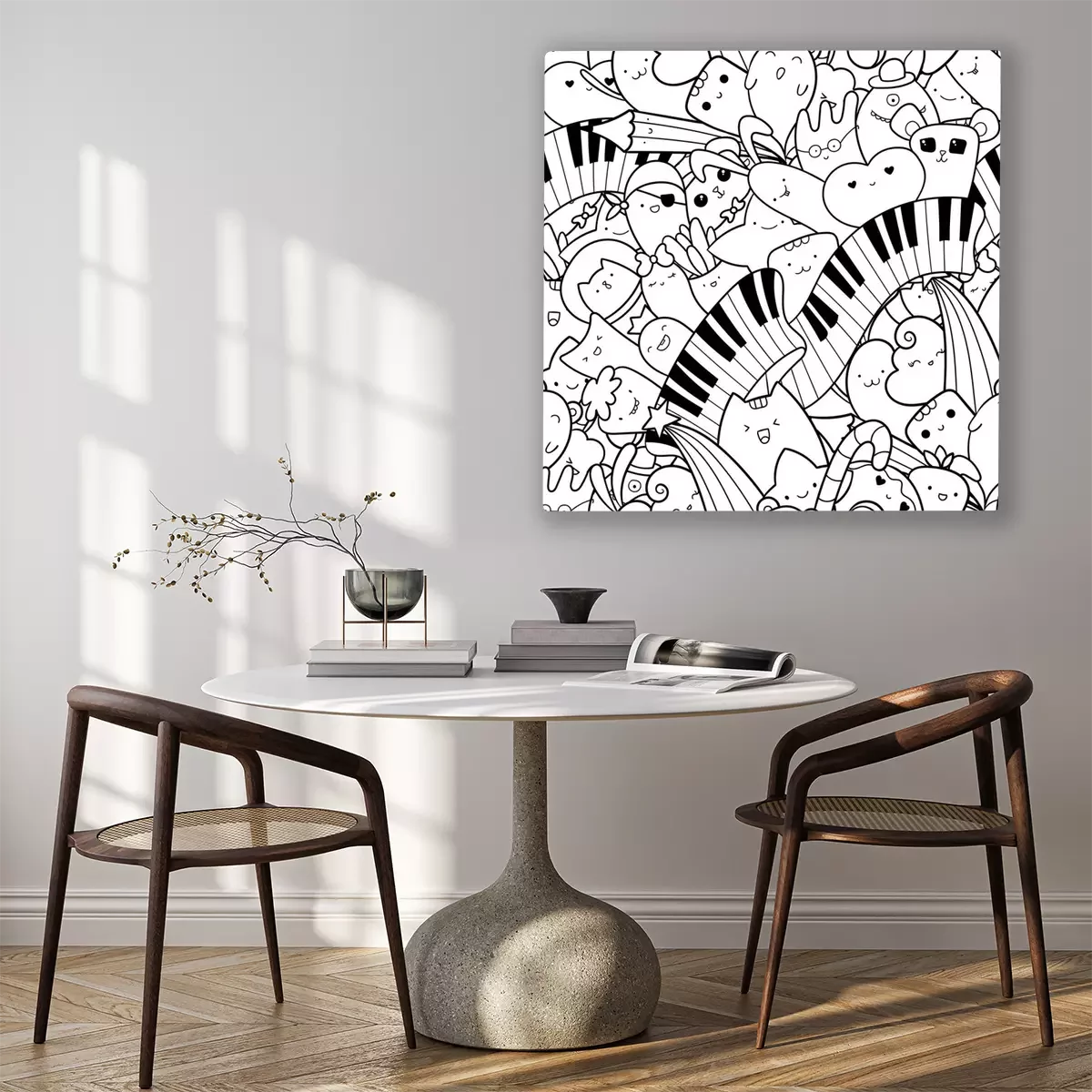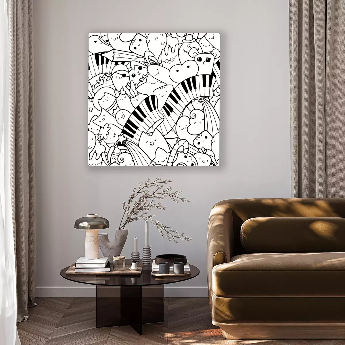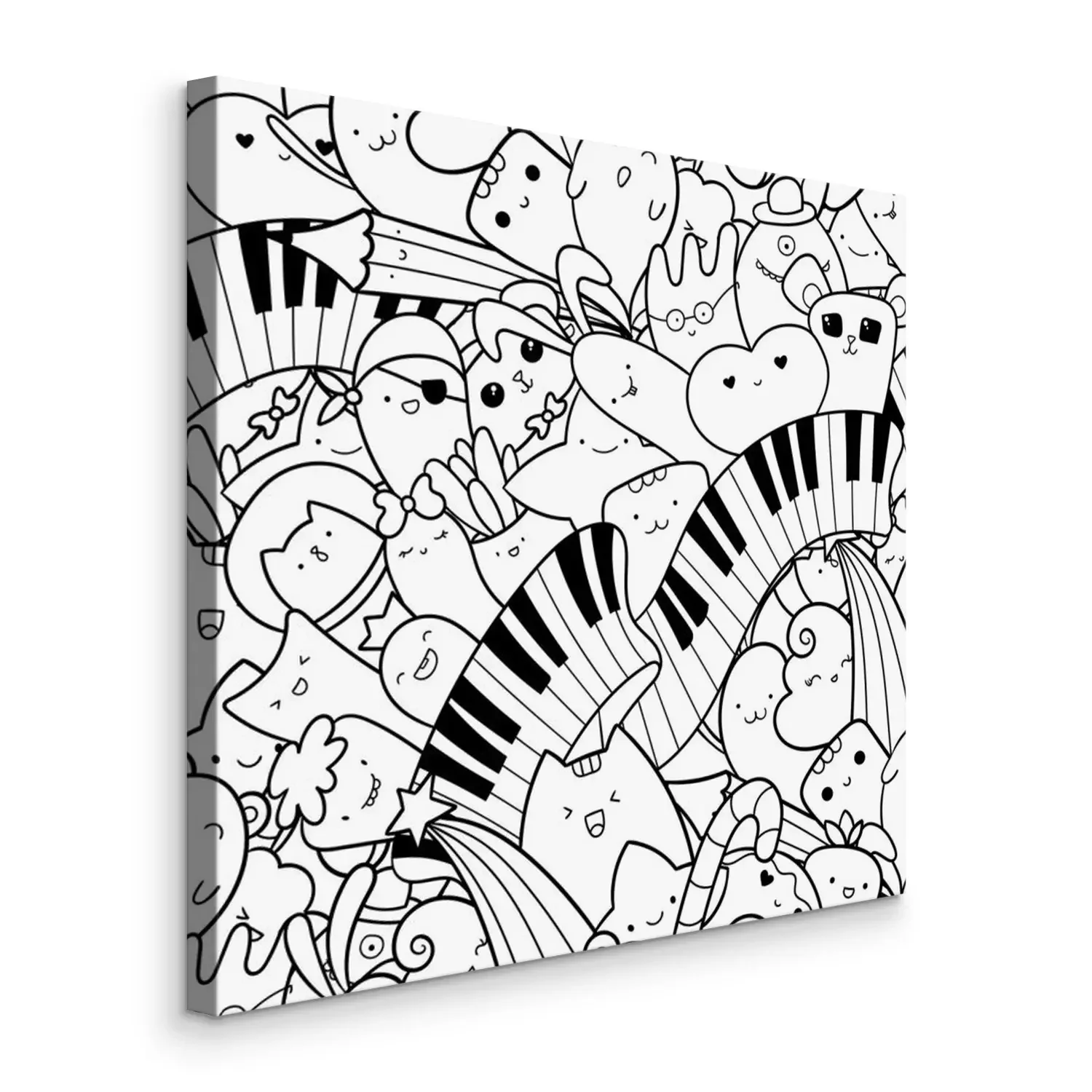 Canvas: Seamless doodles pattern with musical instrument. Piano keys with kawaii creatures, cute monsters and animals. Pattern for coloring page or design print. Easy to change color inside of objects.
