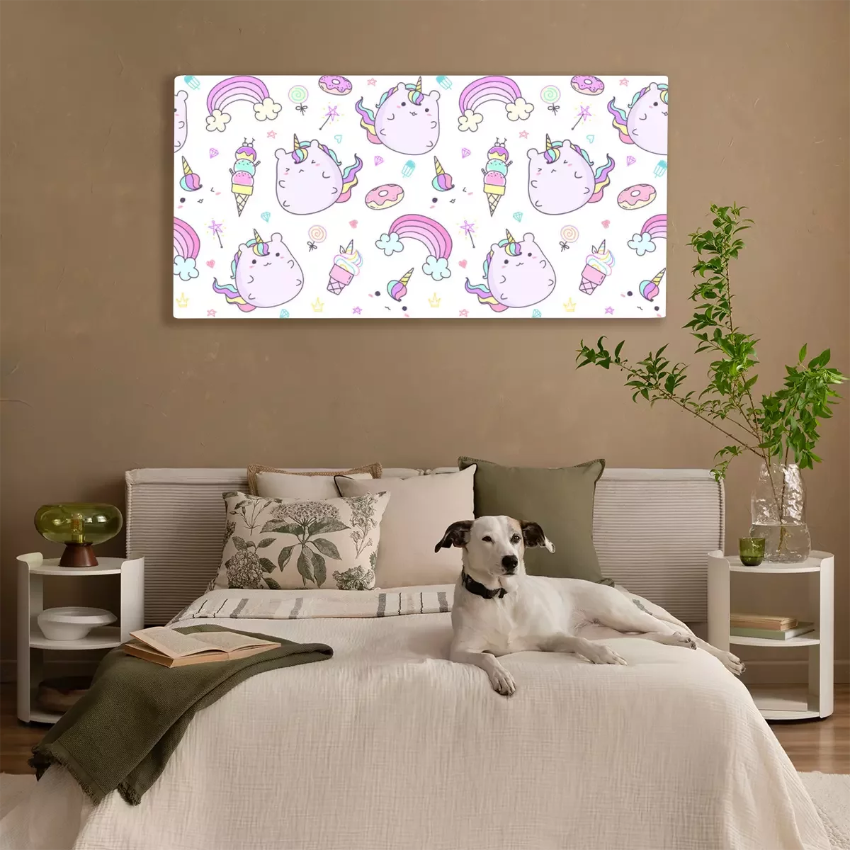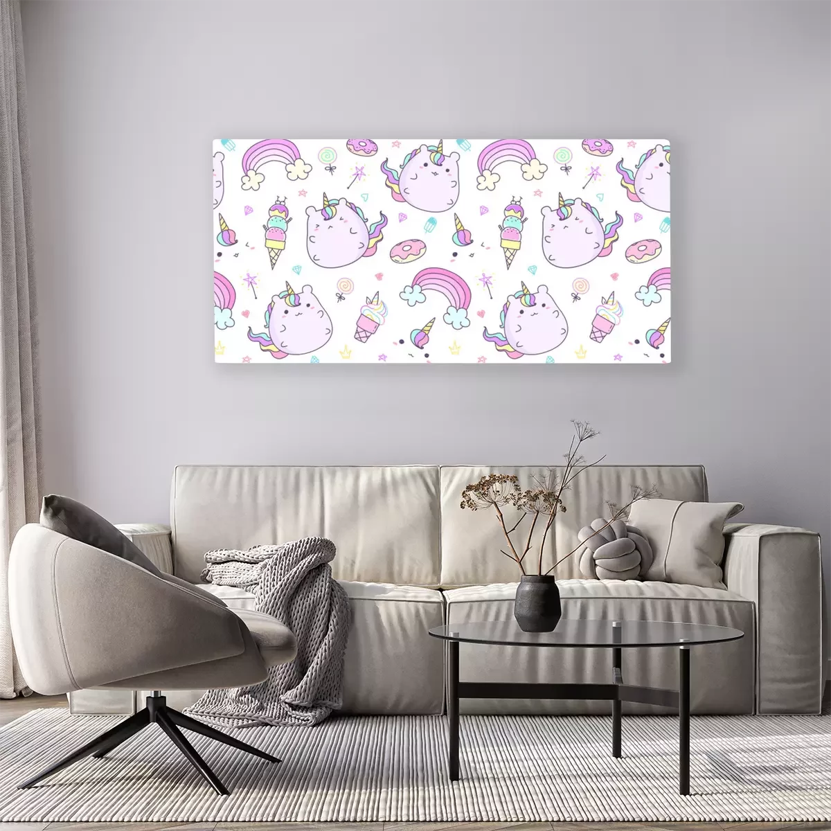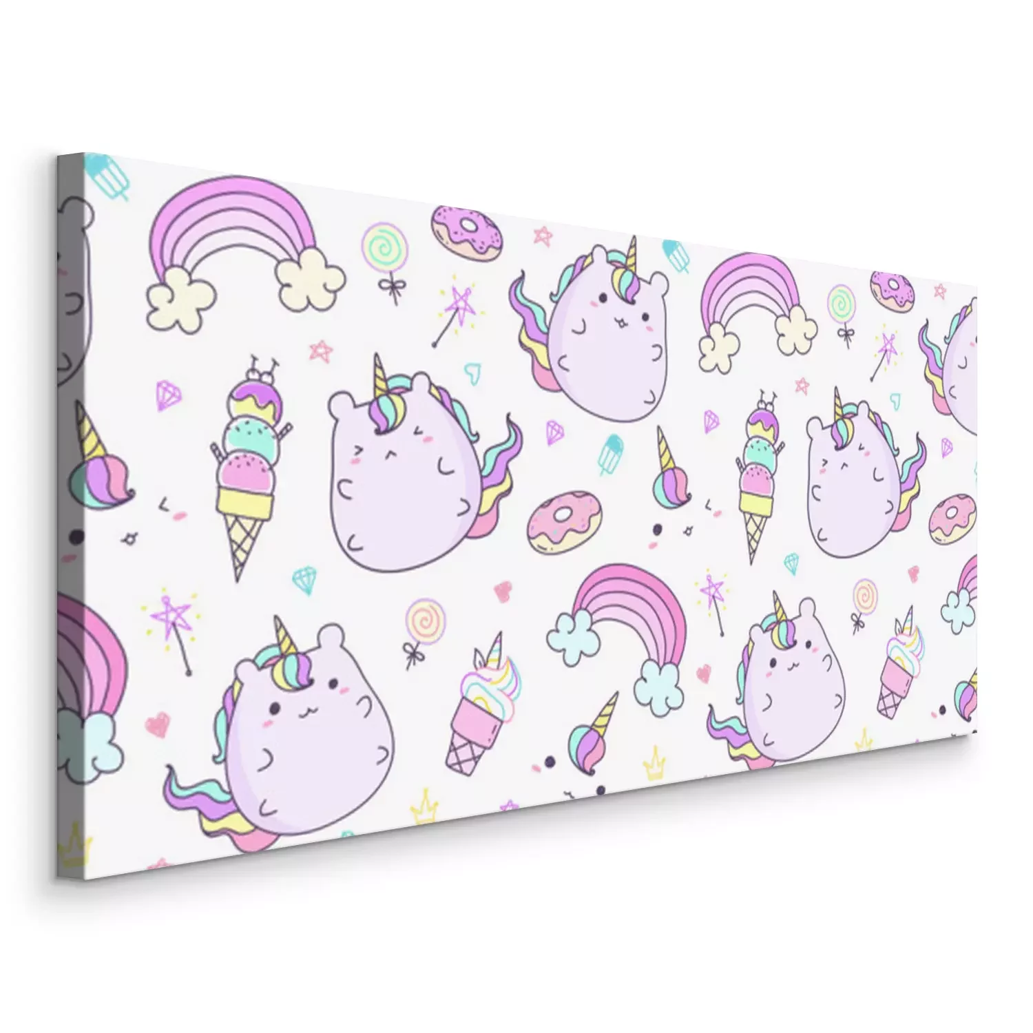 Canvas Seamless pattern with hand drawn unicorn in pastel color. Kawaii unicorn background for kid.