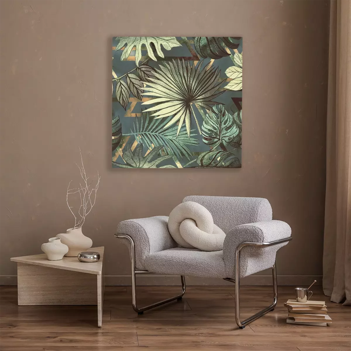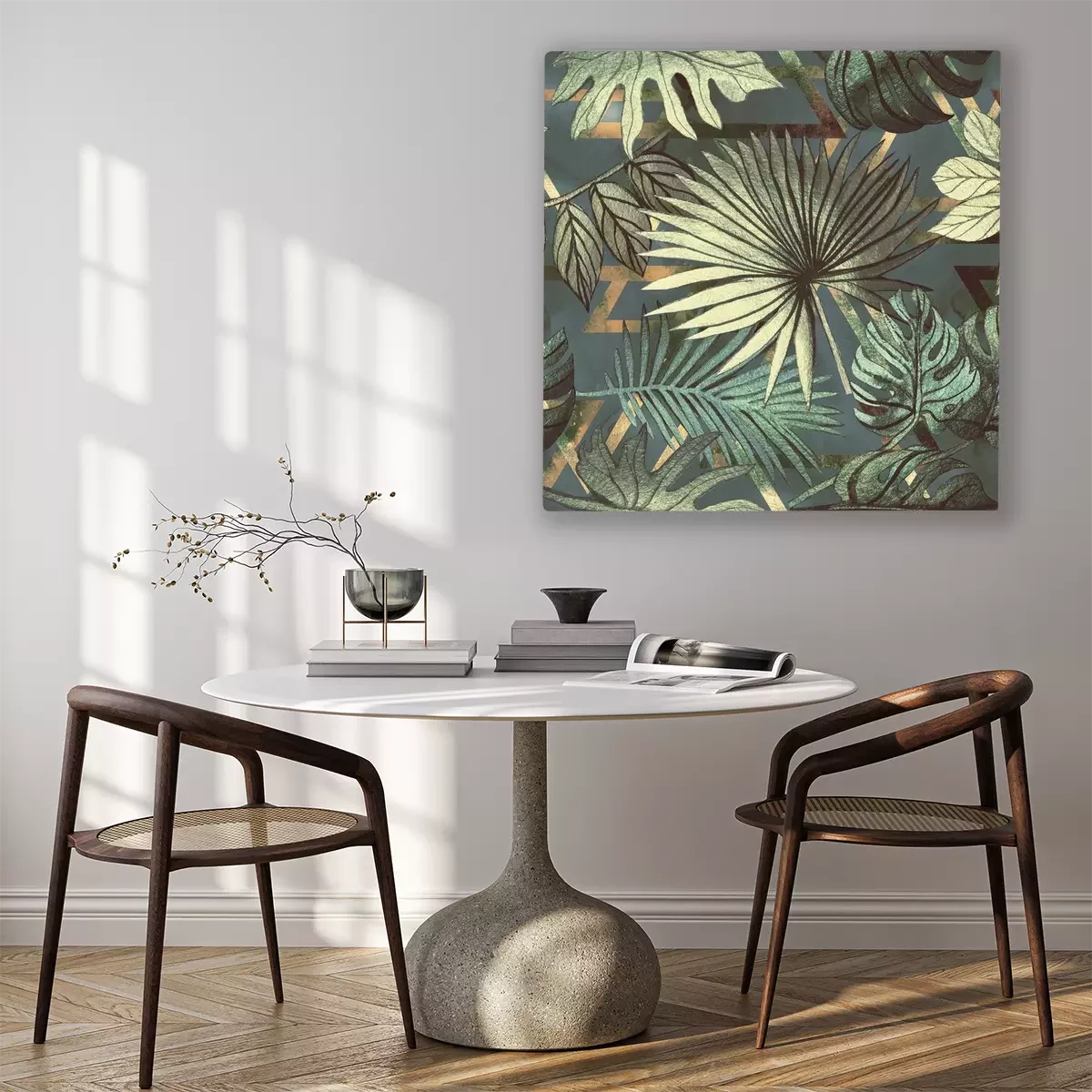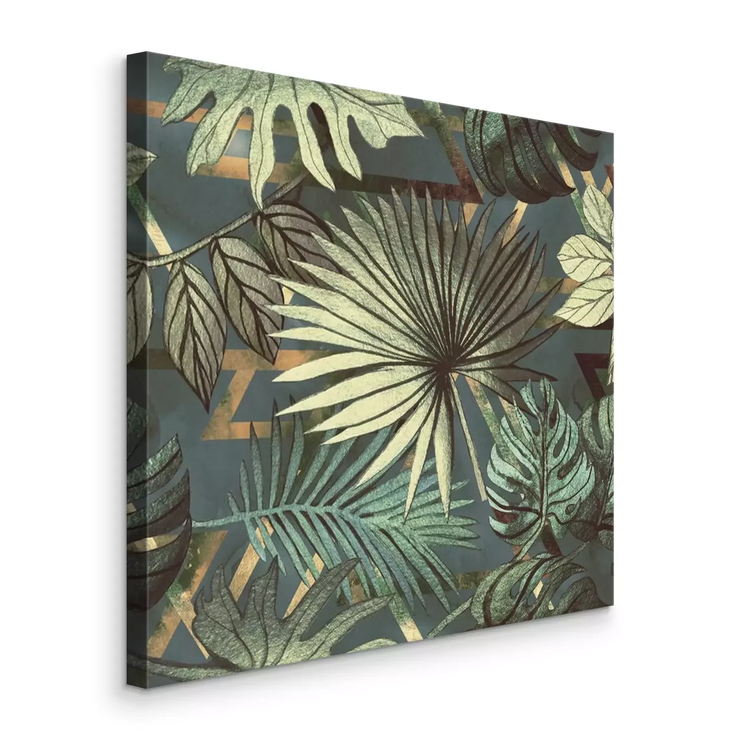 Canvas: Seamless pattern with tropical leaves and geometric shapes. Tropical background.
