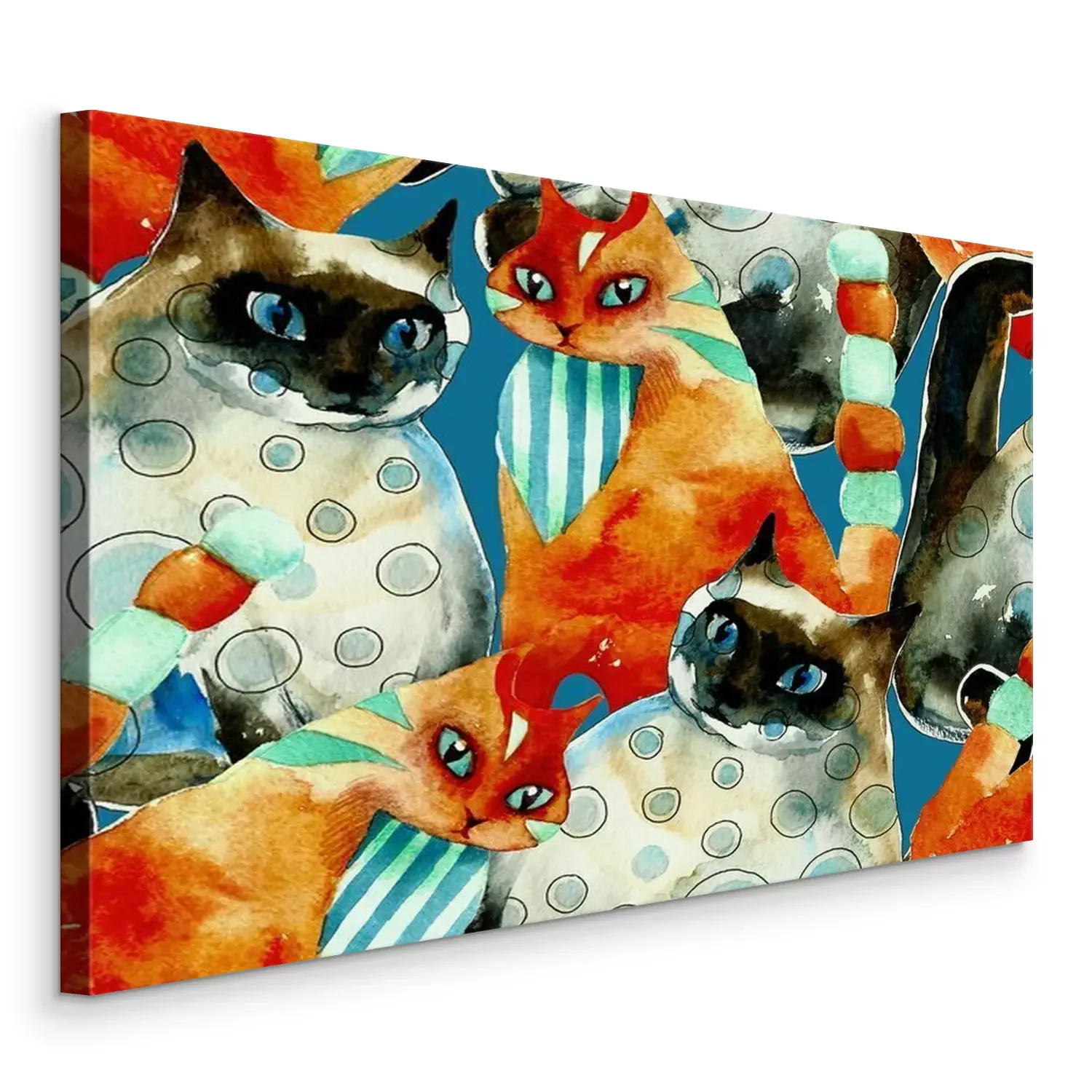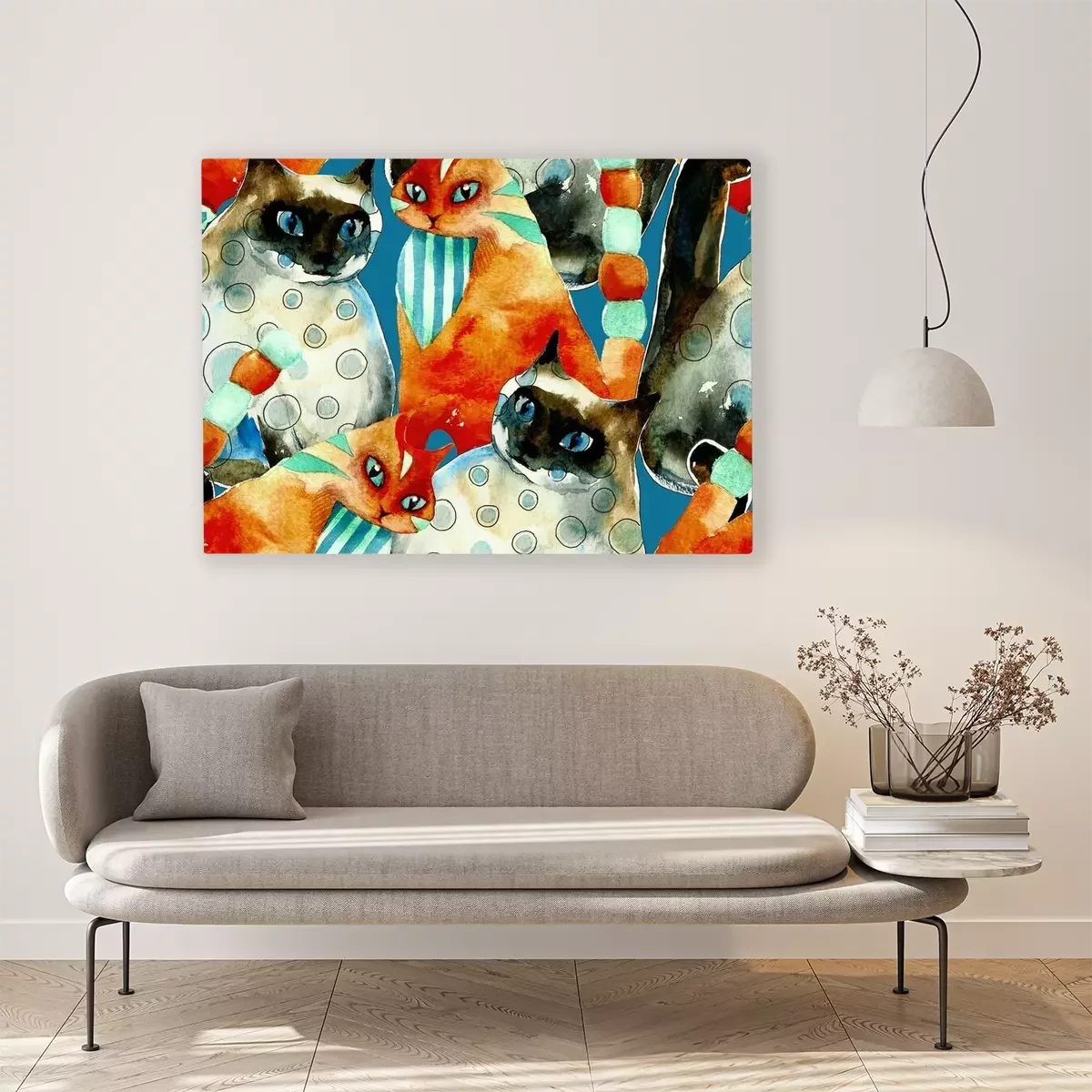 Canvas: Seamless red and blue cats pattern from original watercolor hand drawn illustration on blue background