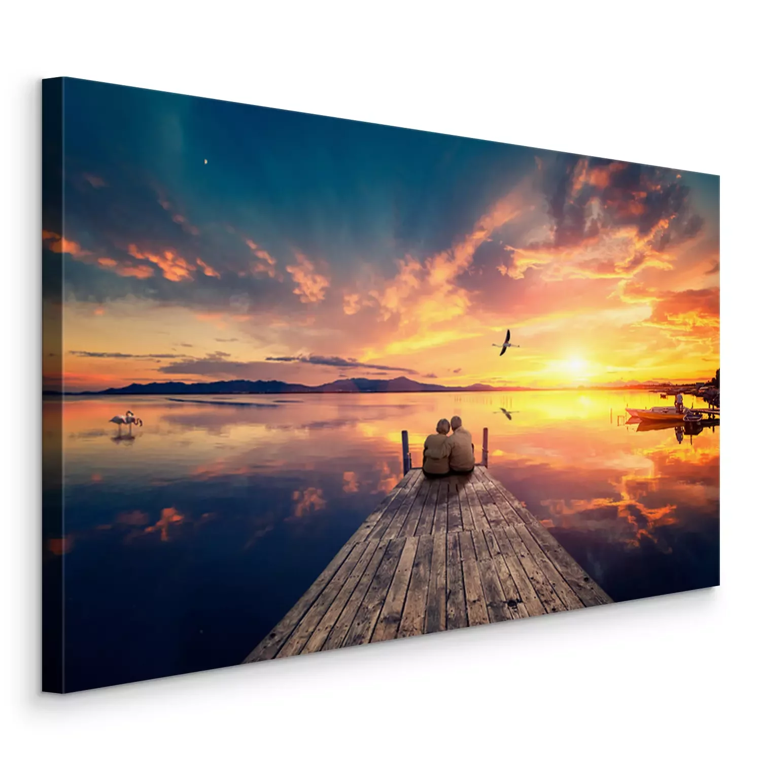 Canvas: Senior couple seated on a wooden jetty, looking a colorful sunset on the sea with a flying flamingo reflected on the calm water.