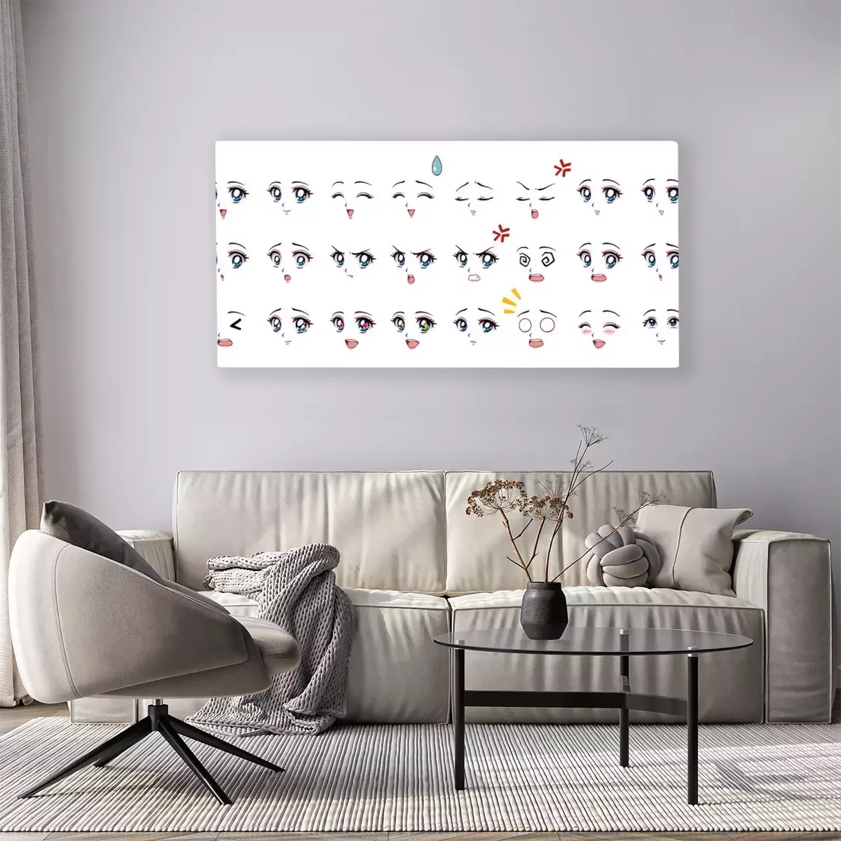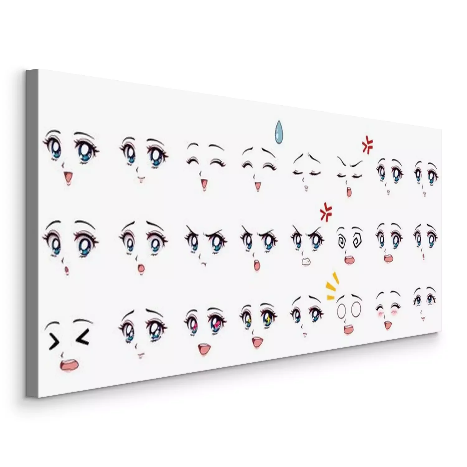 Canvas Set of cartoon anime style expressions. Different eyes, mouth, eyebrows. Blue eyes, pink lips. Hand drawn vector illustration isolated on white background.