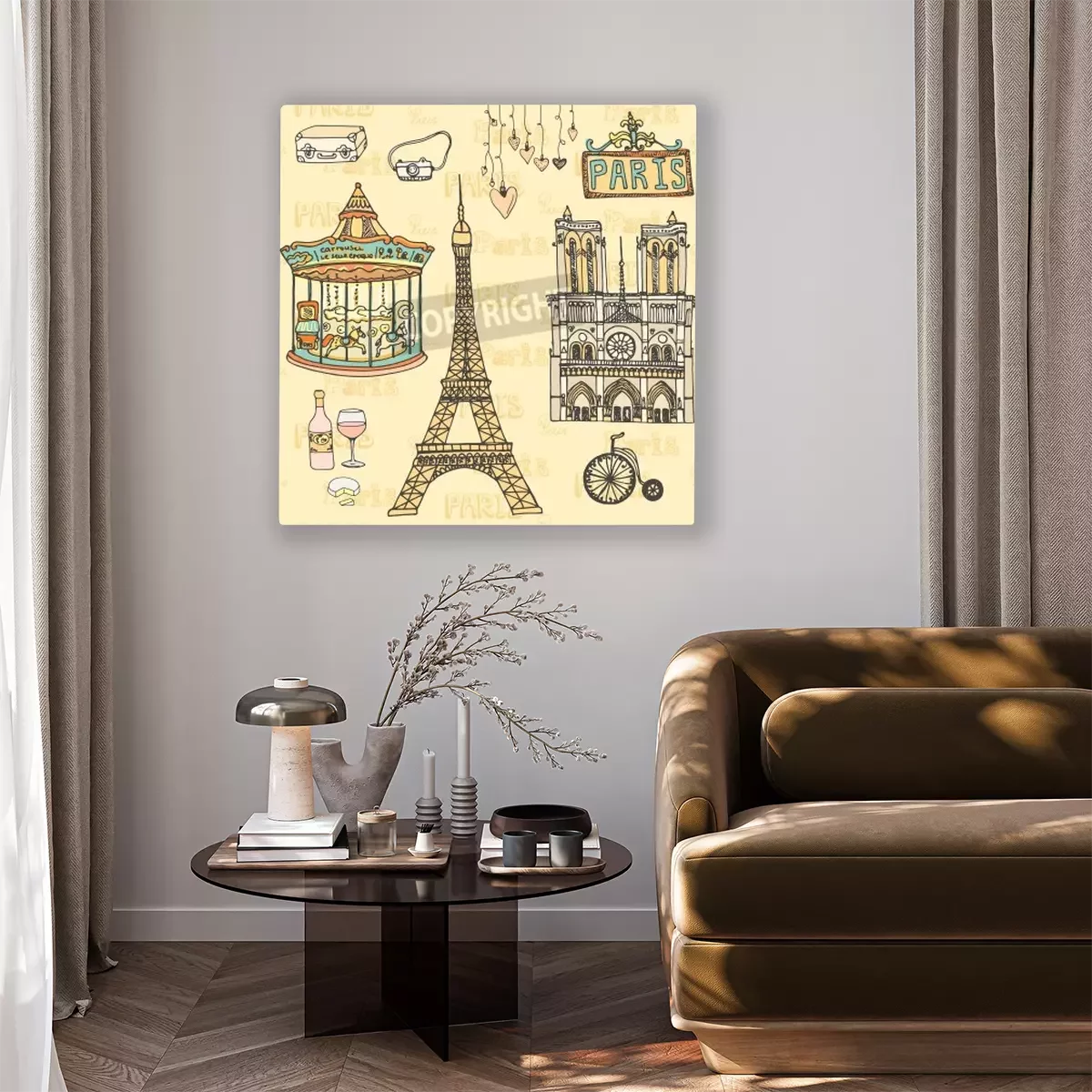 Canvas: Set of Paris symbols made in vector. Eiffel tower, moulin rouge, Notre Dame De Paris, wine, cheese.