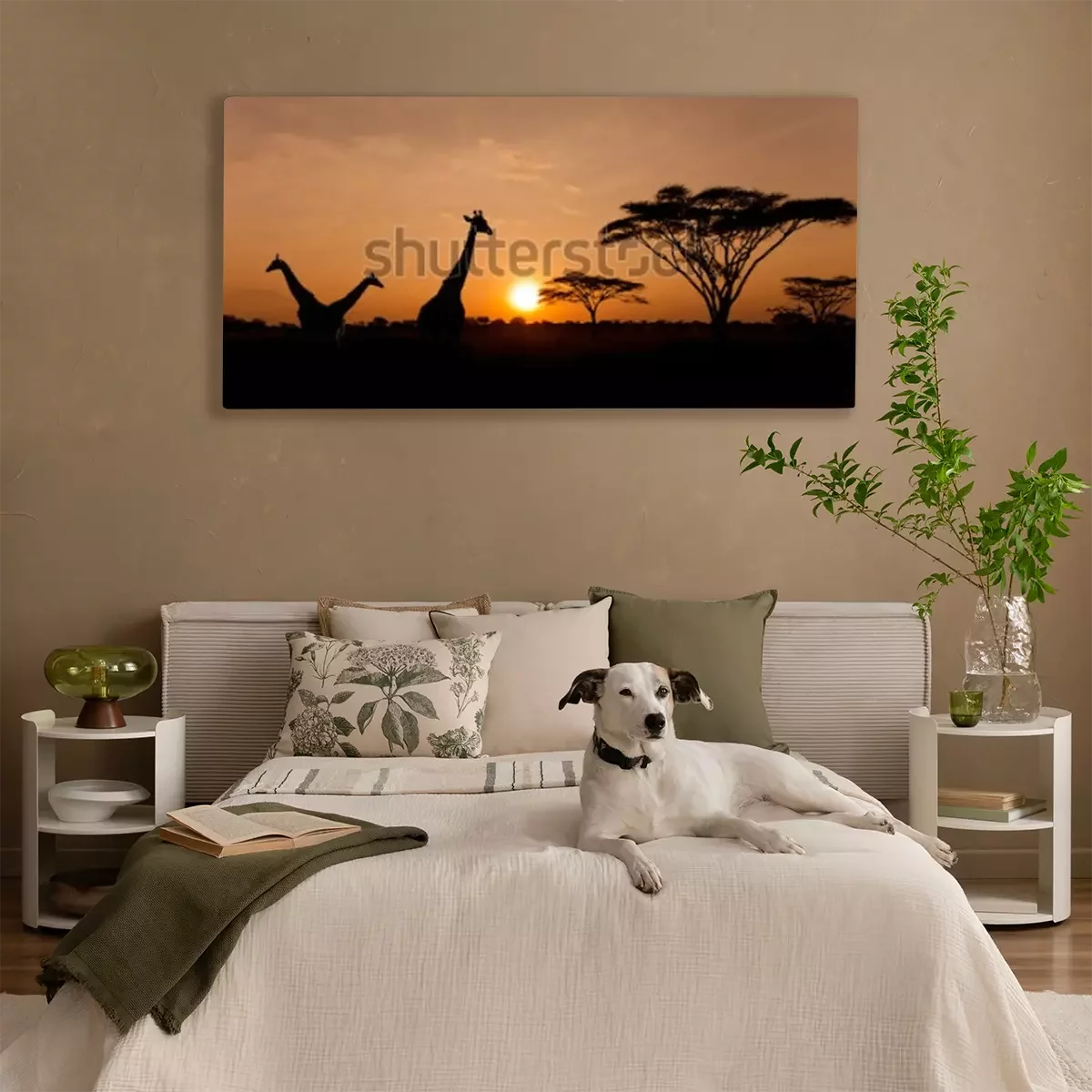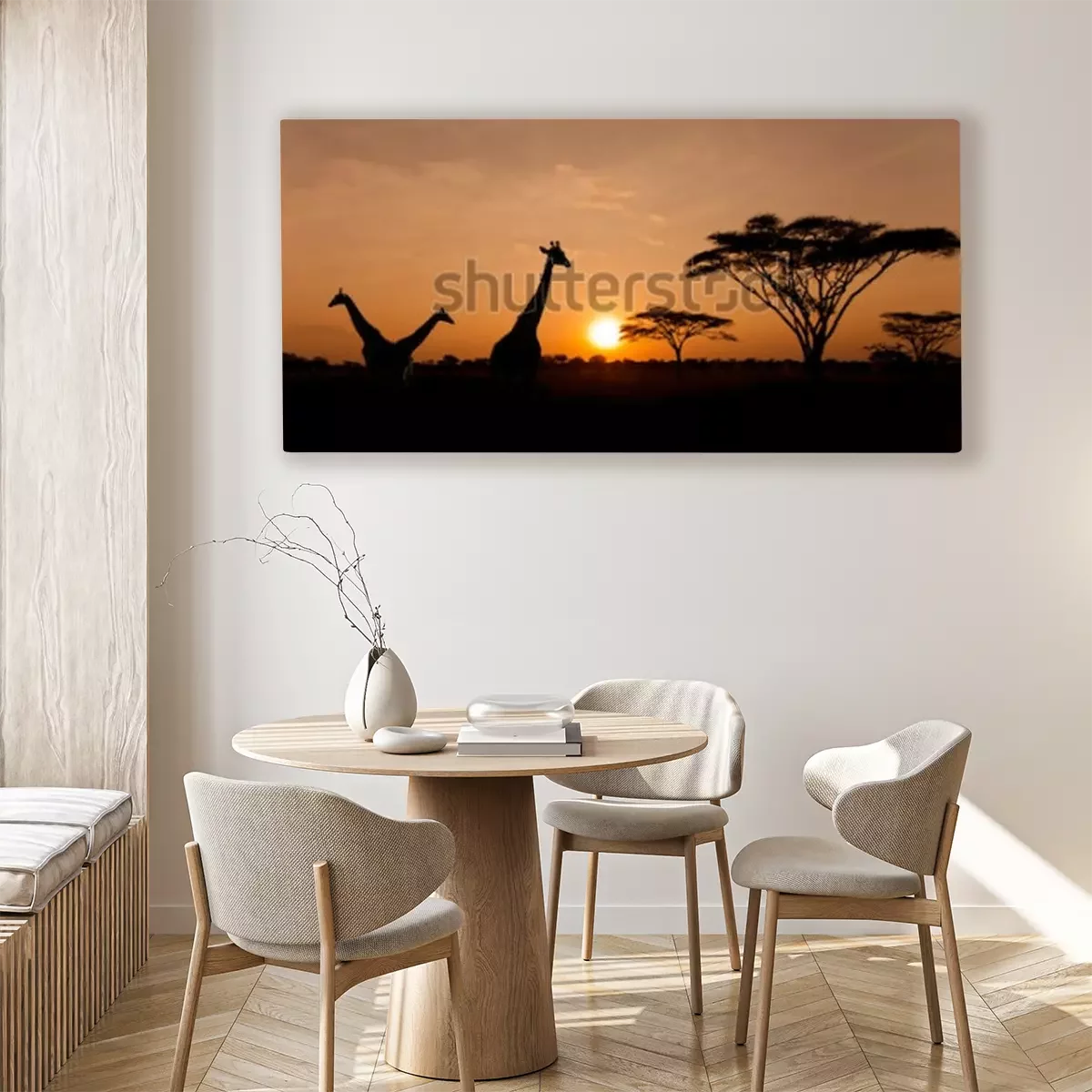 Canvas: Setting sun with silhouettes of Giraffes and Acacia trees on Safari in Serengeti National Park
