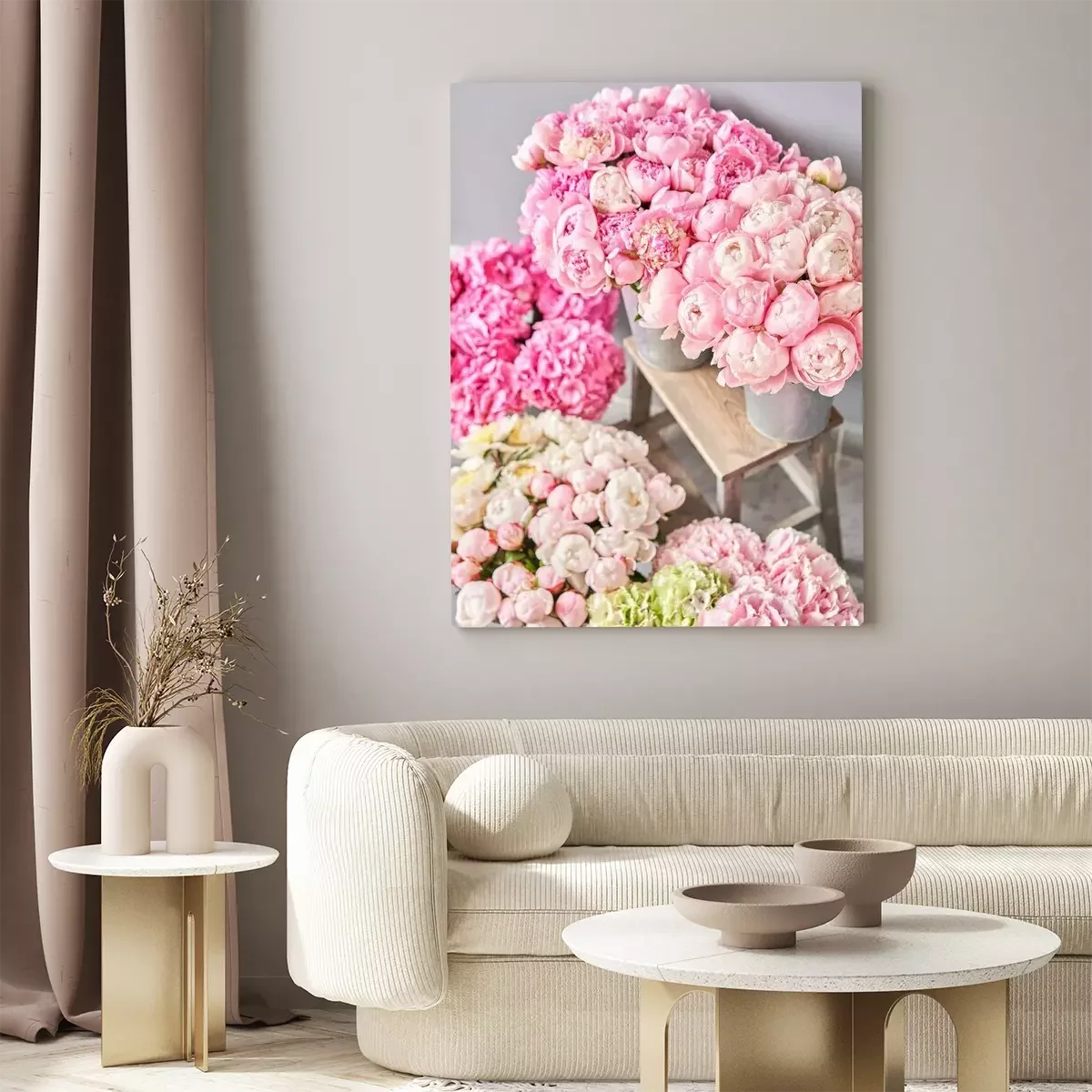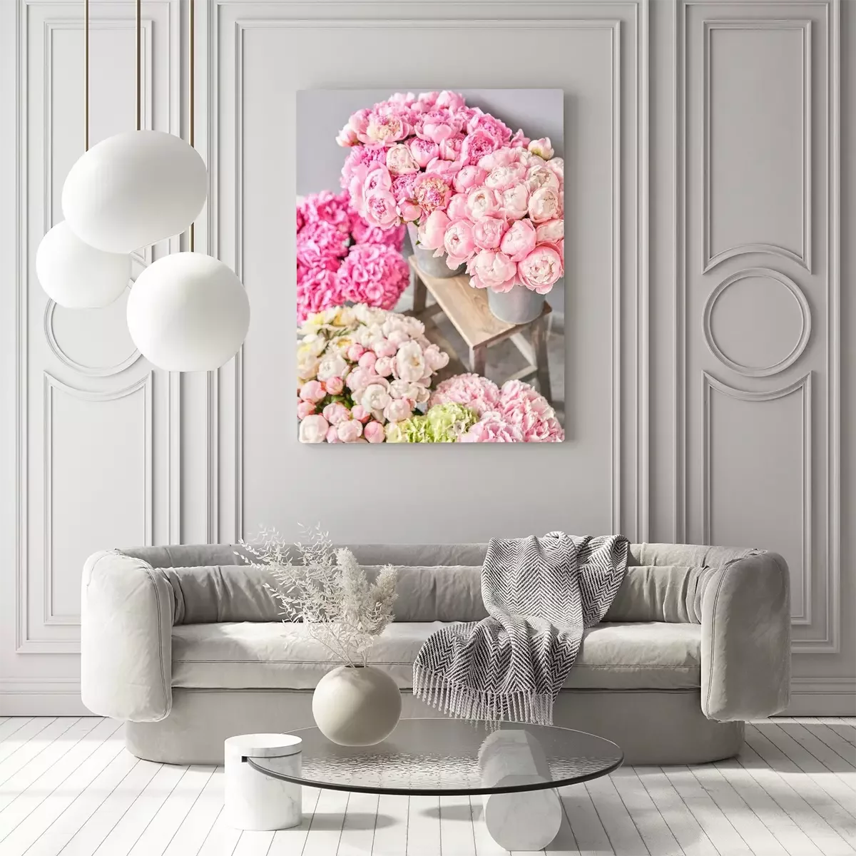 Floral carpet or Wallpaper. Background of pink peonies. Morning light in the room. Beautiful peony flower for catalog or online store. Floral shop and delivery concept .