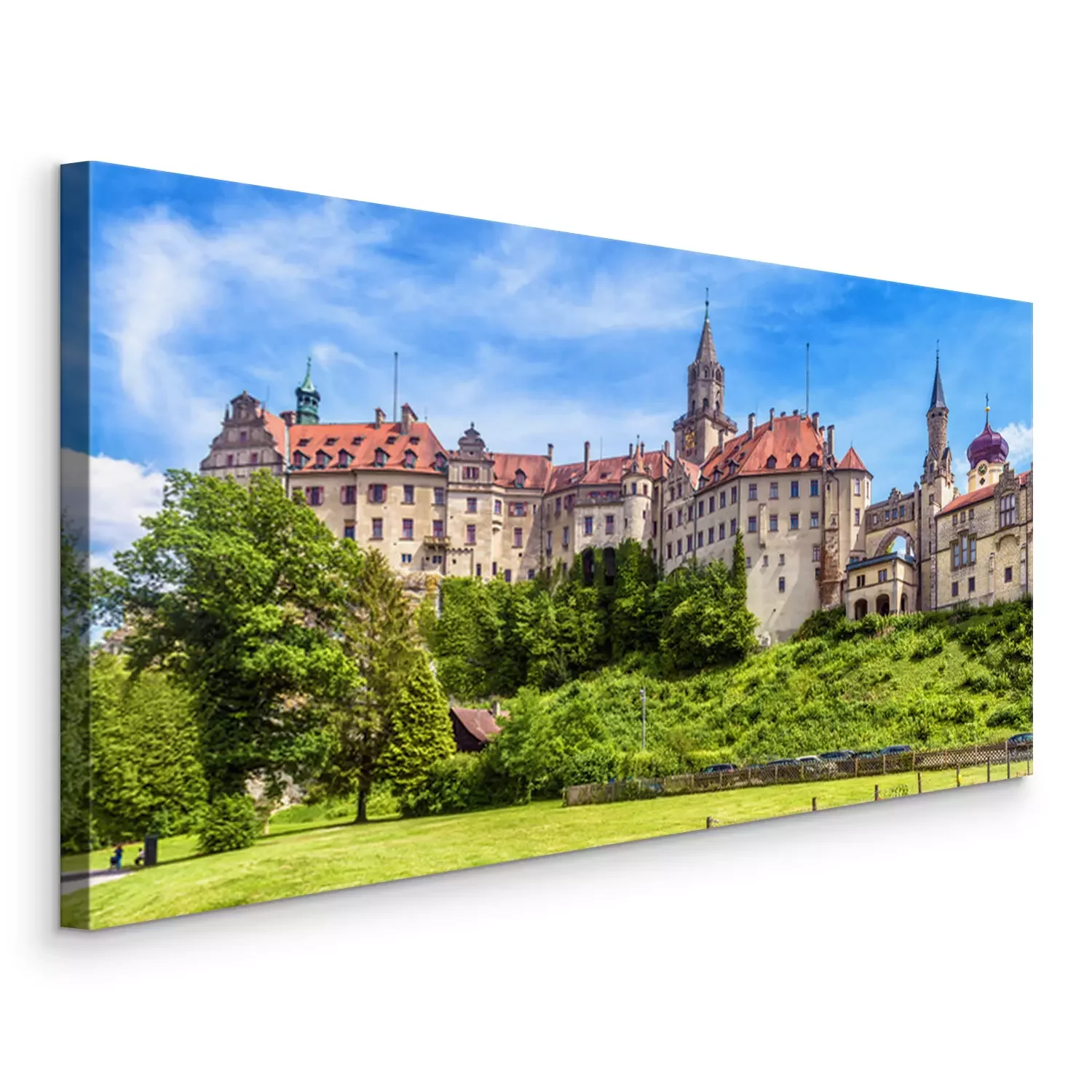 Canvas Sigmaringen Castle in summer, Germany. This famous Gothic castle is a landmark of Baden-Wurttemberg. Panorama of old German castle on a hill. Scenic view of beautiful medieval palace on sunny day.