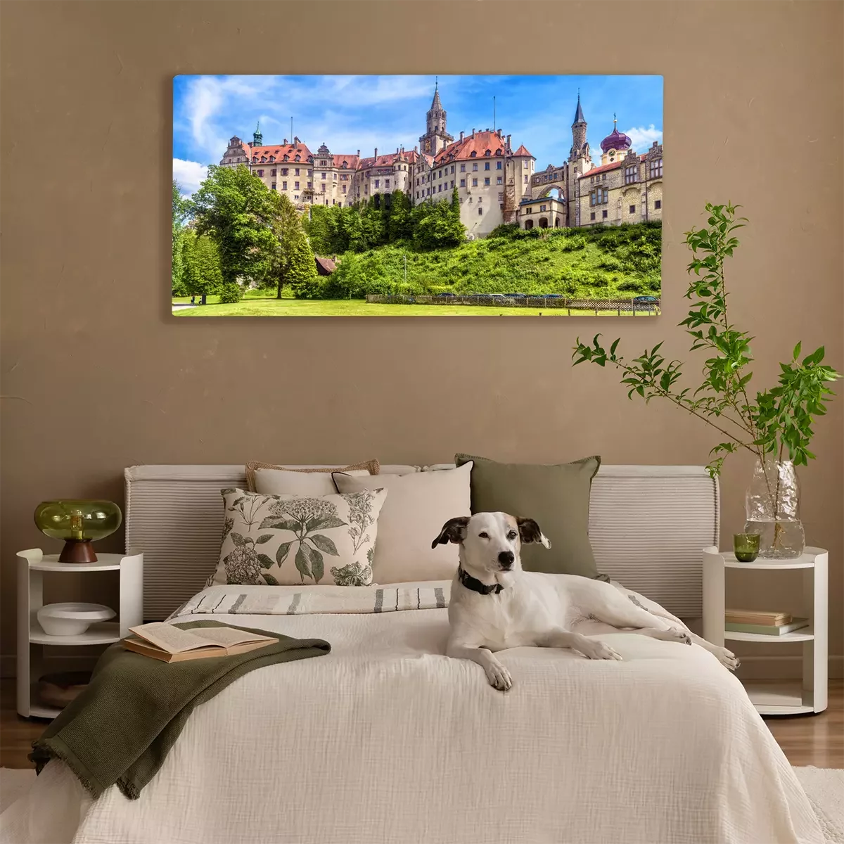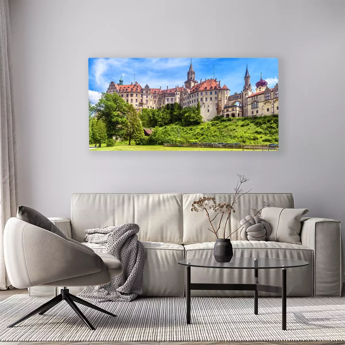 Canvas: Sigmaringen Castle in summer, Germany. This famous Gothic castle is a landmark of Baden-Wurttemberg. Panorama of old German castle on a hill. Scenic view of beautiful medieval palace on sunny day.