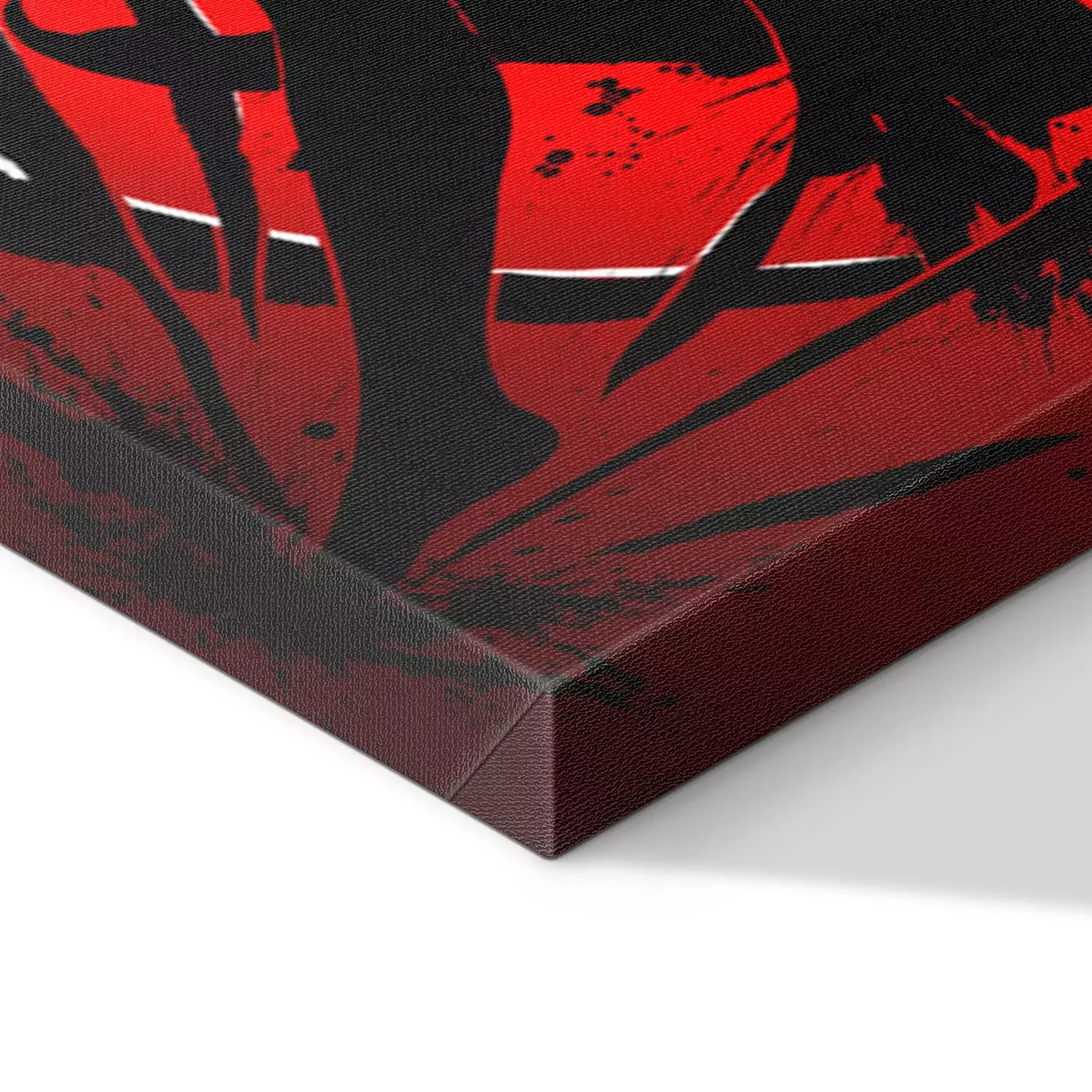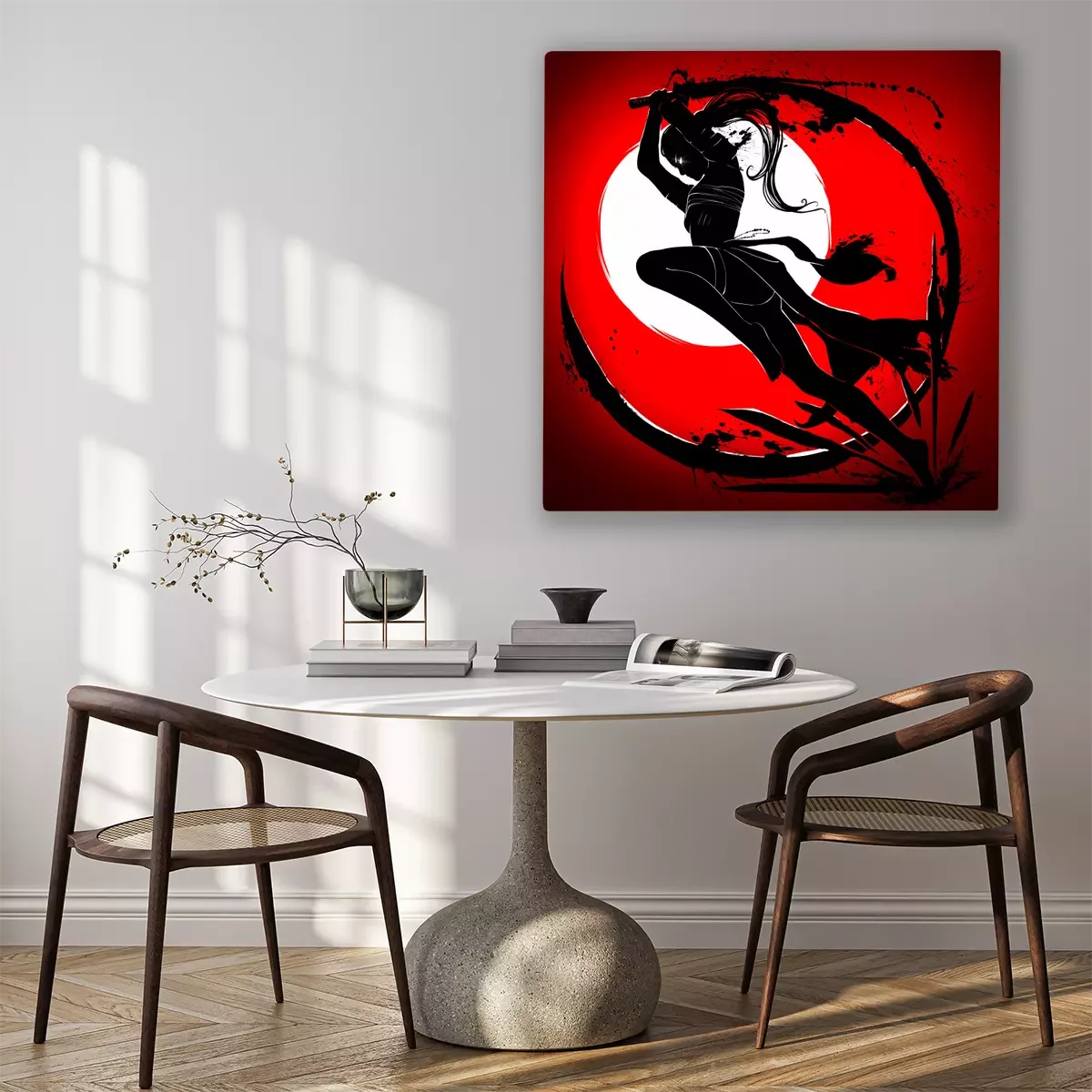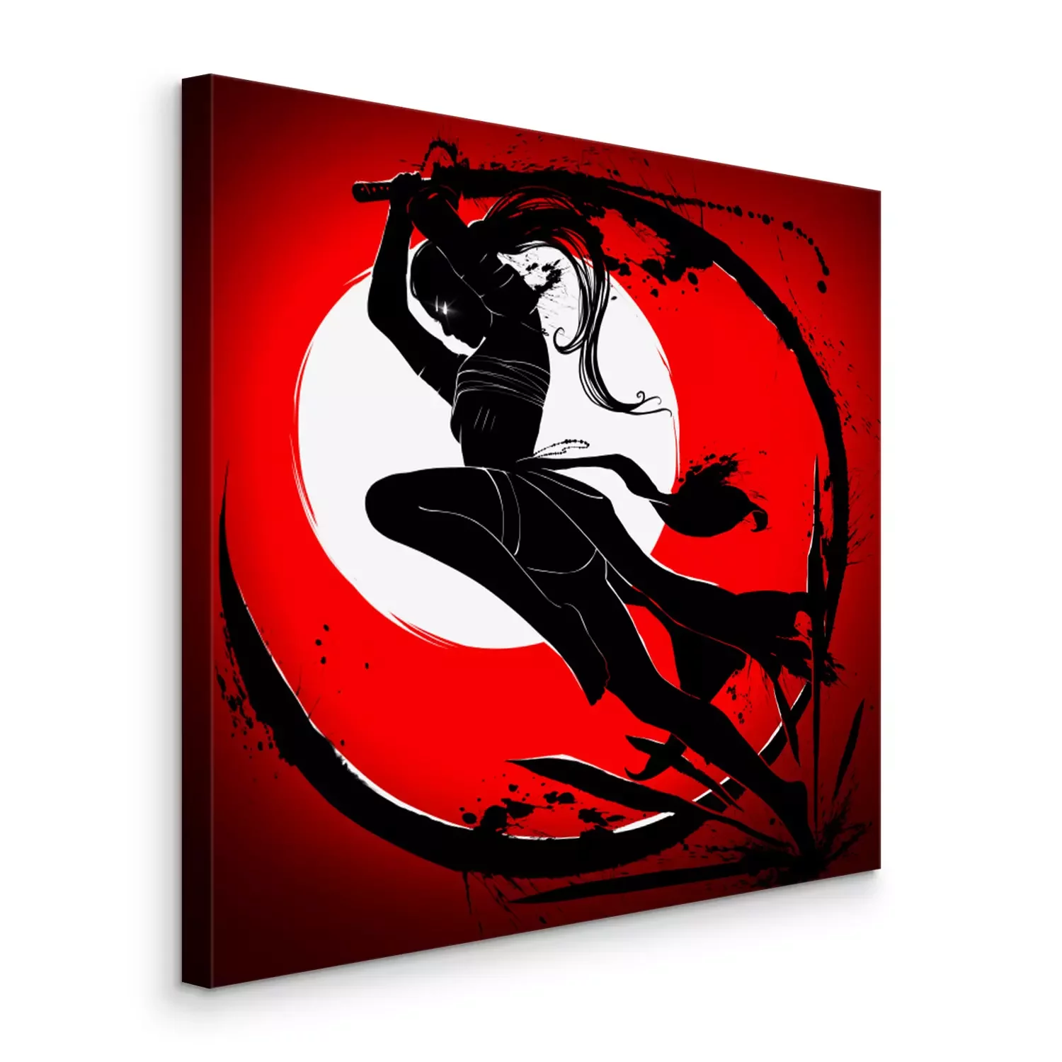 Canvas Silhouette of a samurai girl who attacks in a jump with a katana in her hands. 2D Illustration.