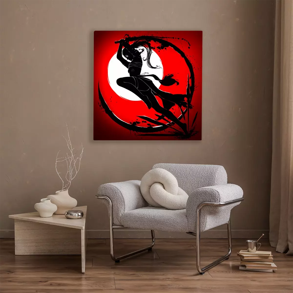 Canvas: Silhouette of a samurai girl who attacks in a jump with a katana in her hands. 2D Illustration.