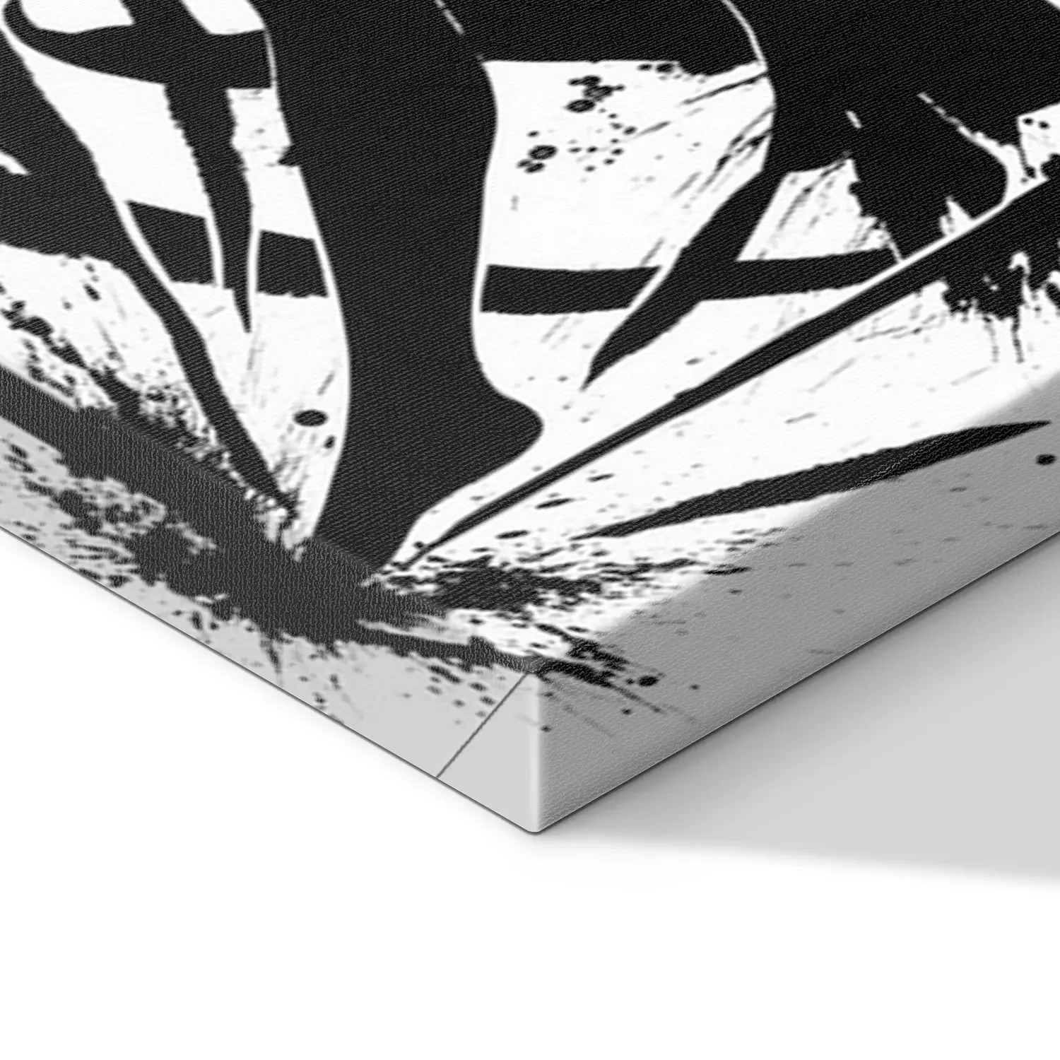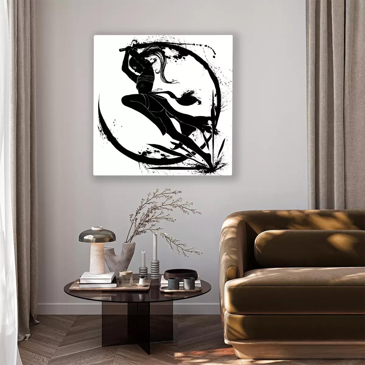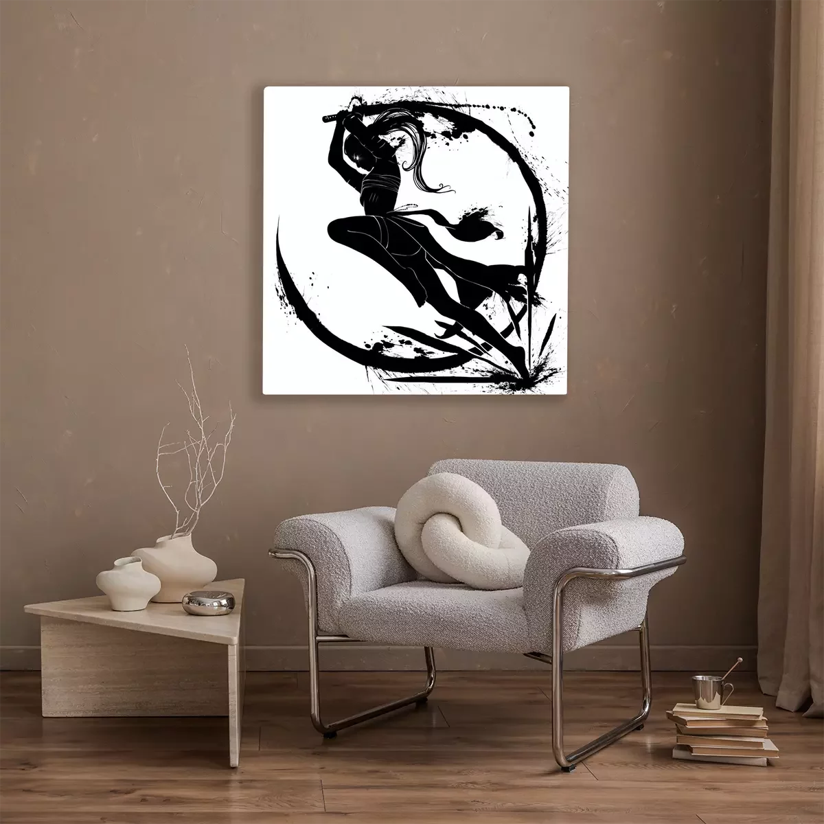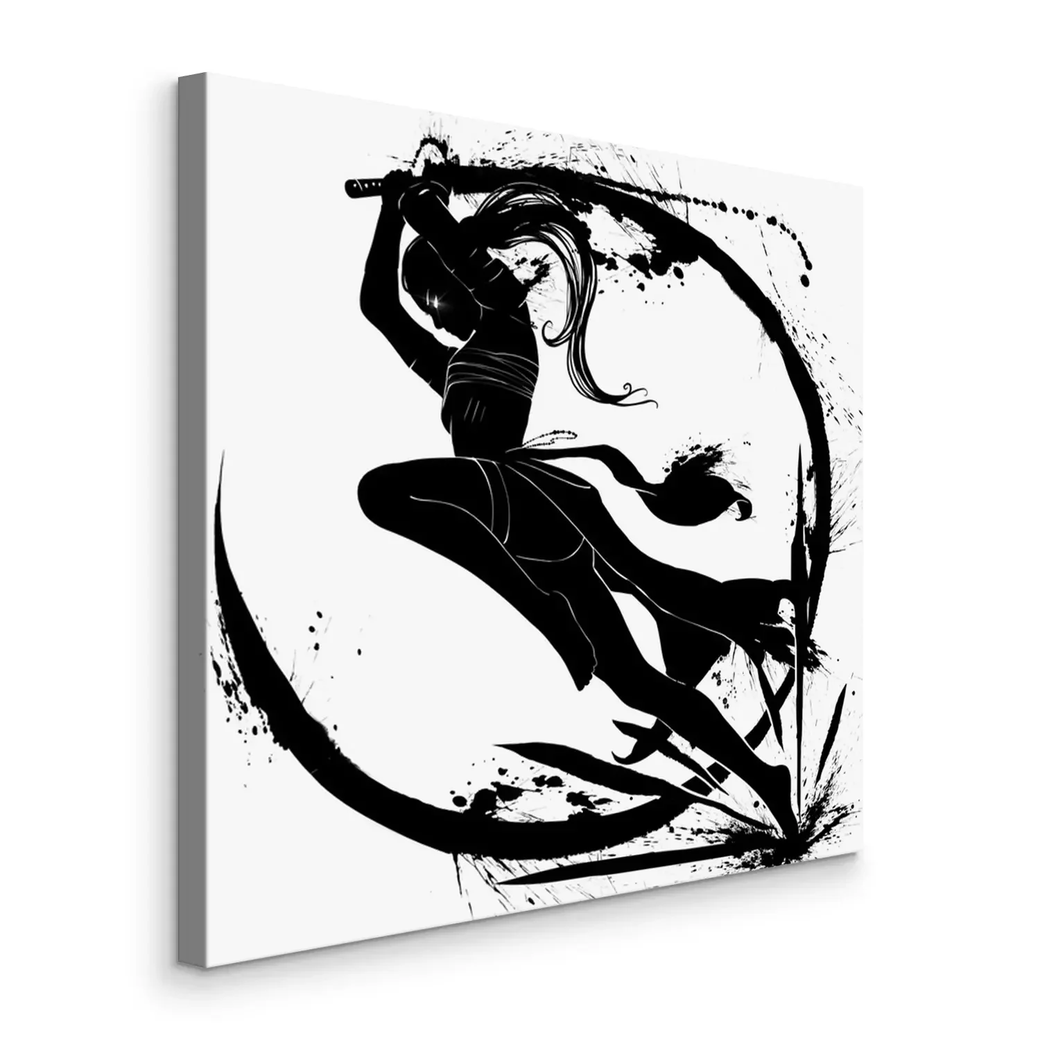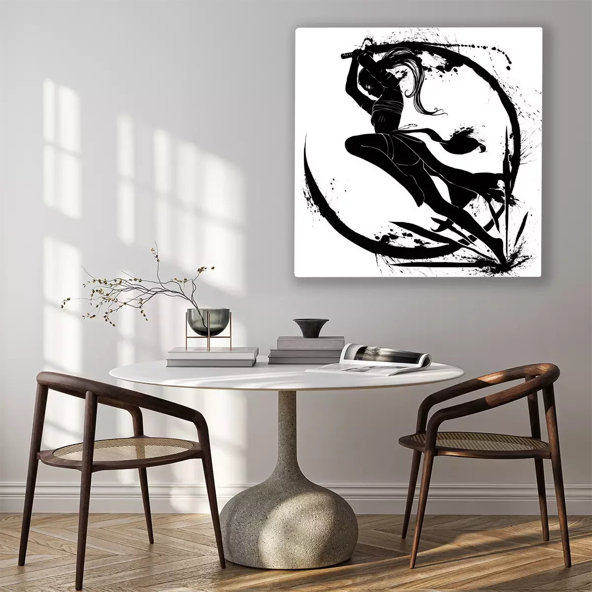Canvas Silhouette of a samurai girl who attacks in a jump with a katana in her hands. 2D Illustration.