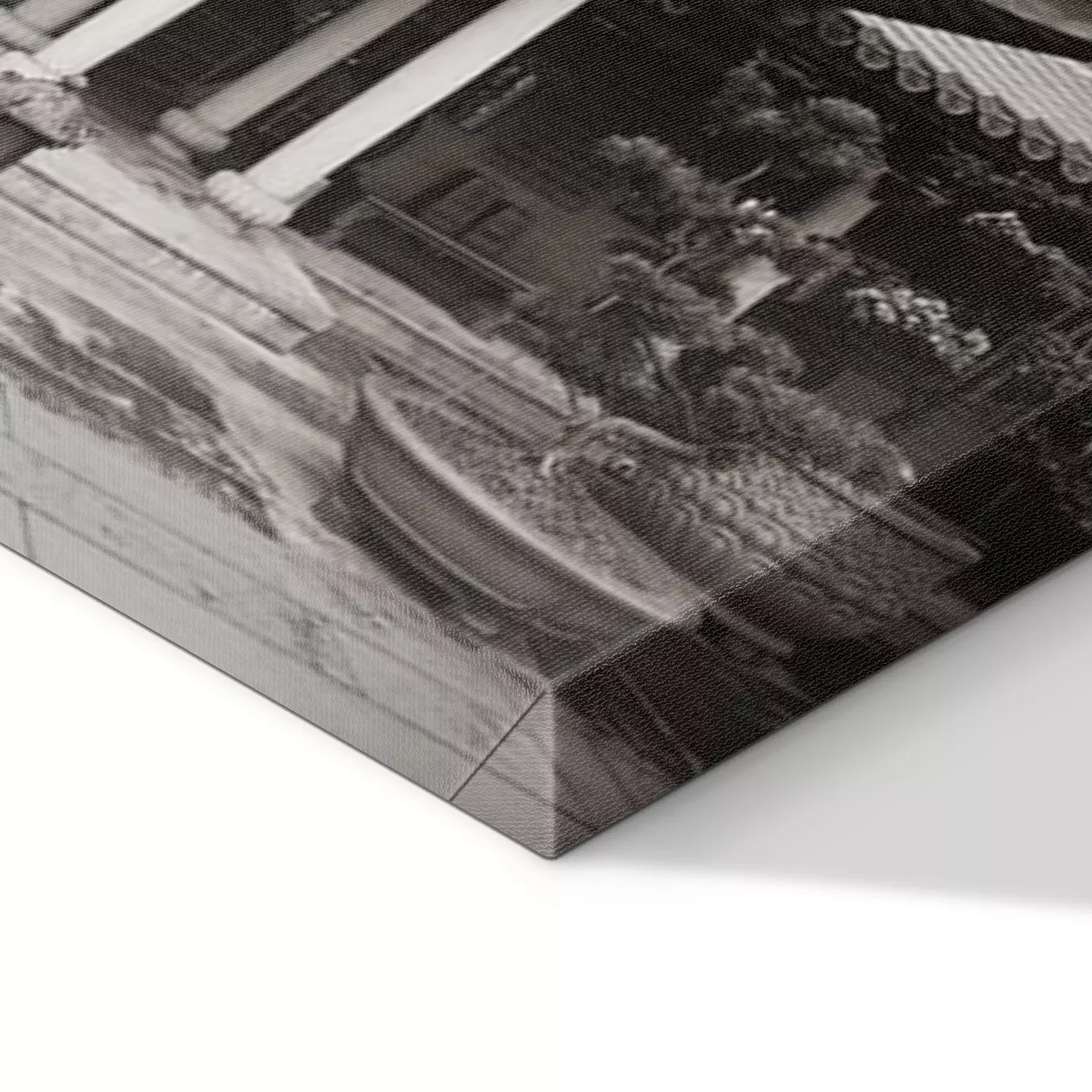De print wordt aangebracht op hoogwaardig canvas dat op een schildersweefgetouw (spieraam) wordt gespannen. Omdat de print de zijranden bedekt, hoeft het ontwerp niet met een extra kader te worden omlijst. Wij raden ook composities aan die uit meerdere foto's bestaan en zo een coherente compositie vormen.