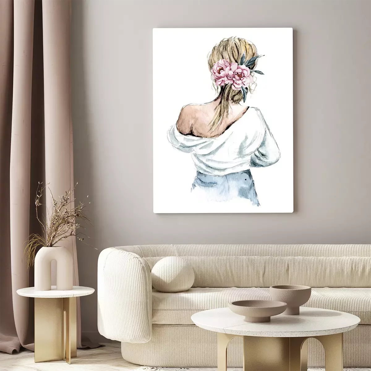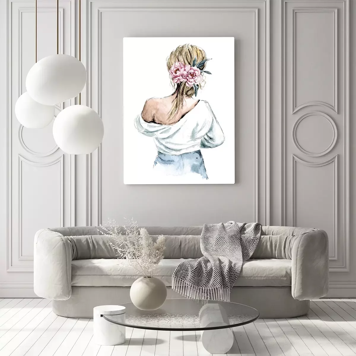 Canvas: Sketch cute girl with flowers. Watercolor hand painting, woman isolated on white background.