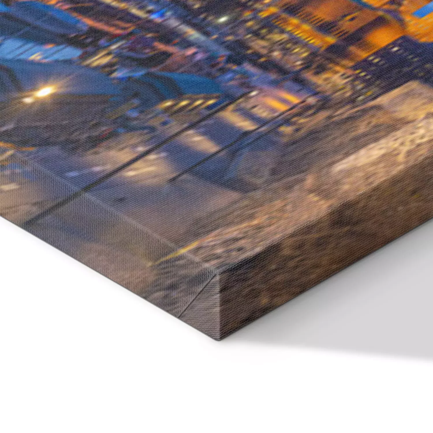 De print wordt aangebracht op hoogwaardig canvas dat op een schildersweefgetouw (spieraam) wordt gespannen. Omdat de print de zijranden bedekt, hoeft het ontwerp niet met een extra kader te worden omlijst. Wij raden ook composities aan die uit meerdere foto's bestaan en zo een coherente compositie vormen.
