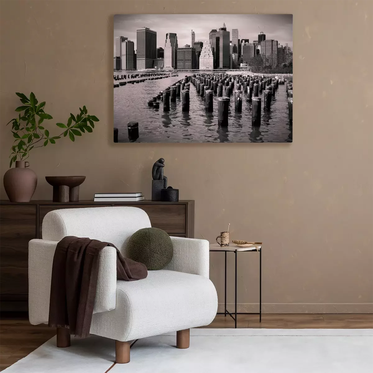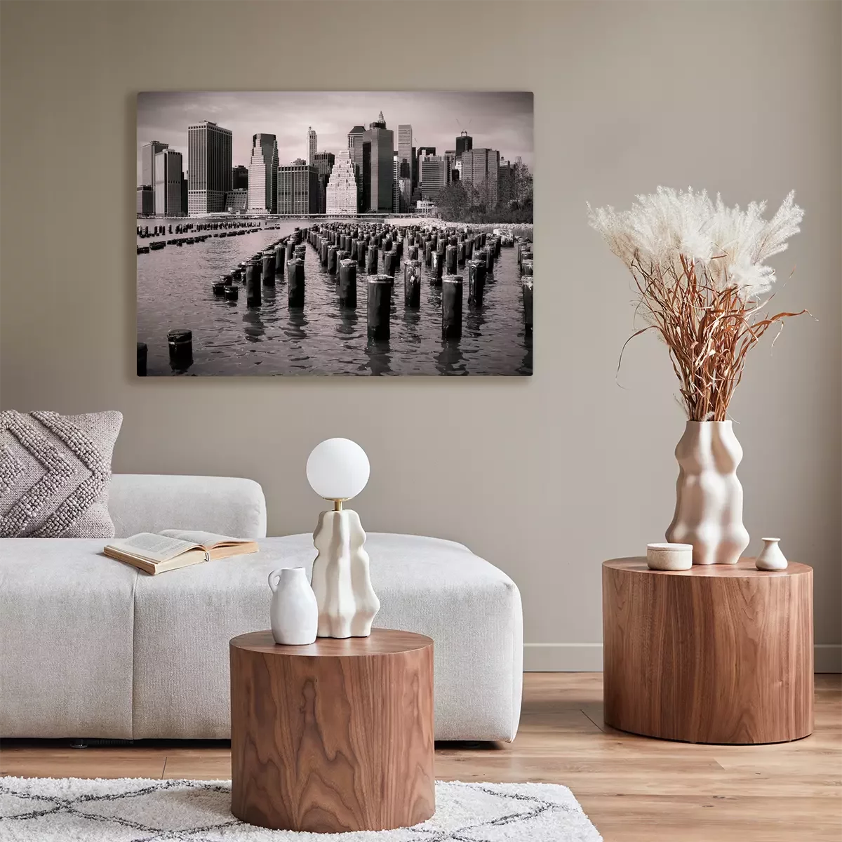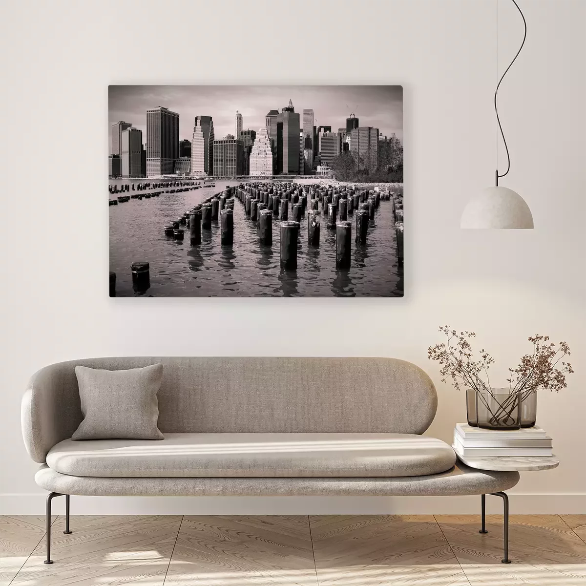 Canvas: Skyline von Manhattan mit Holzpfählen im Wasser, Schwarzweiß