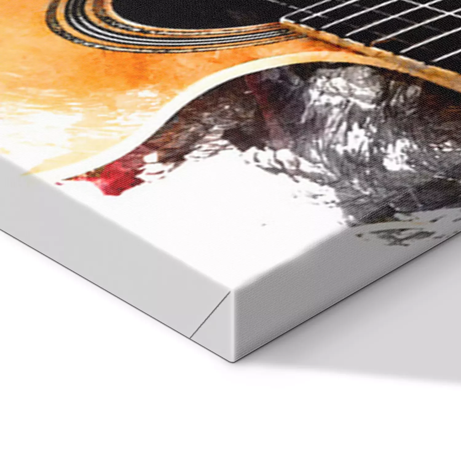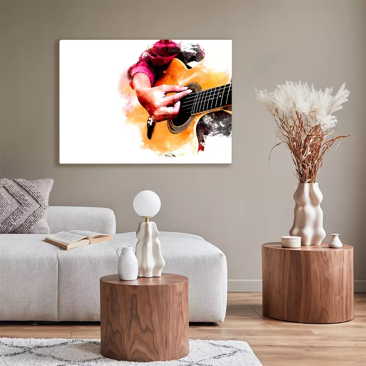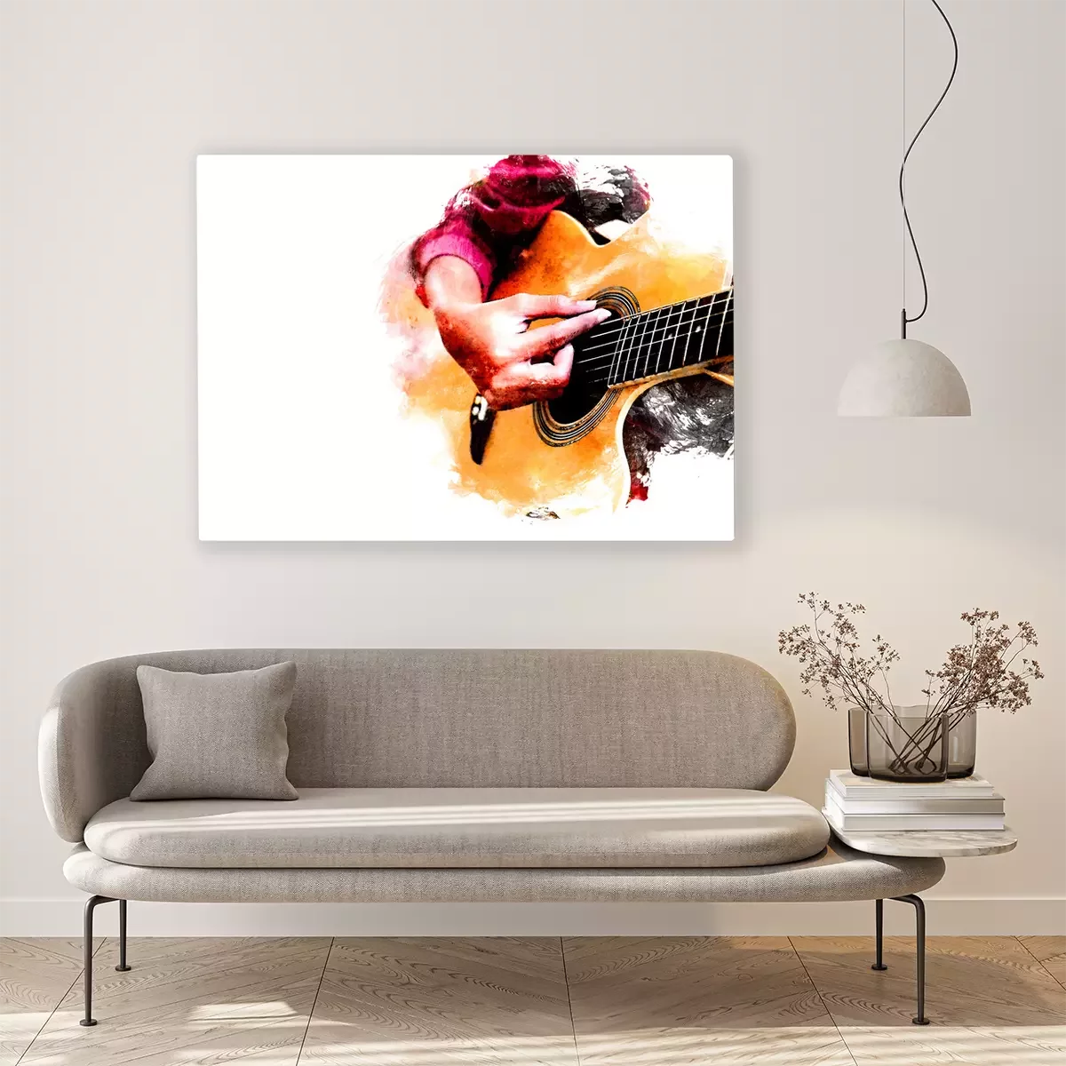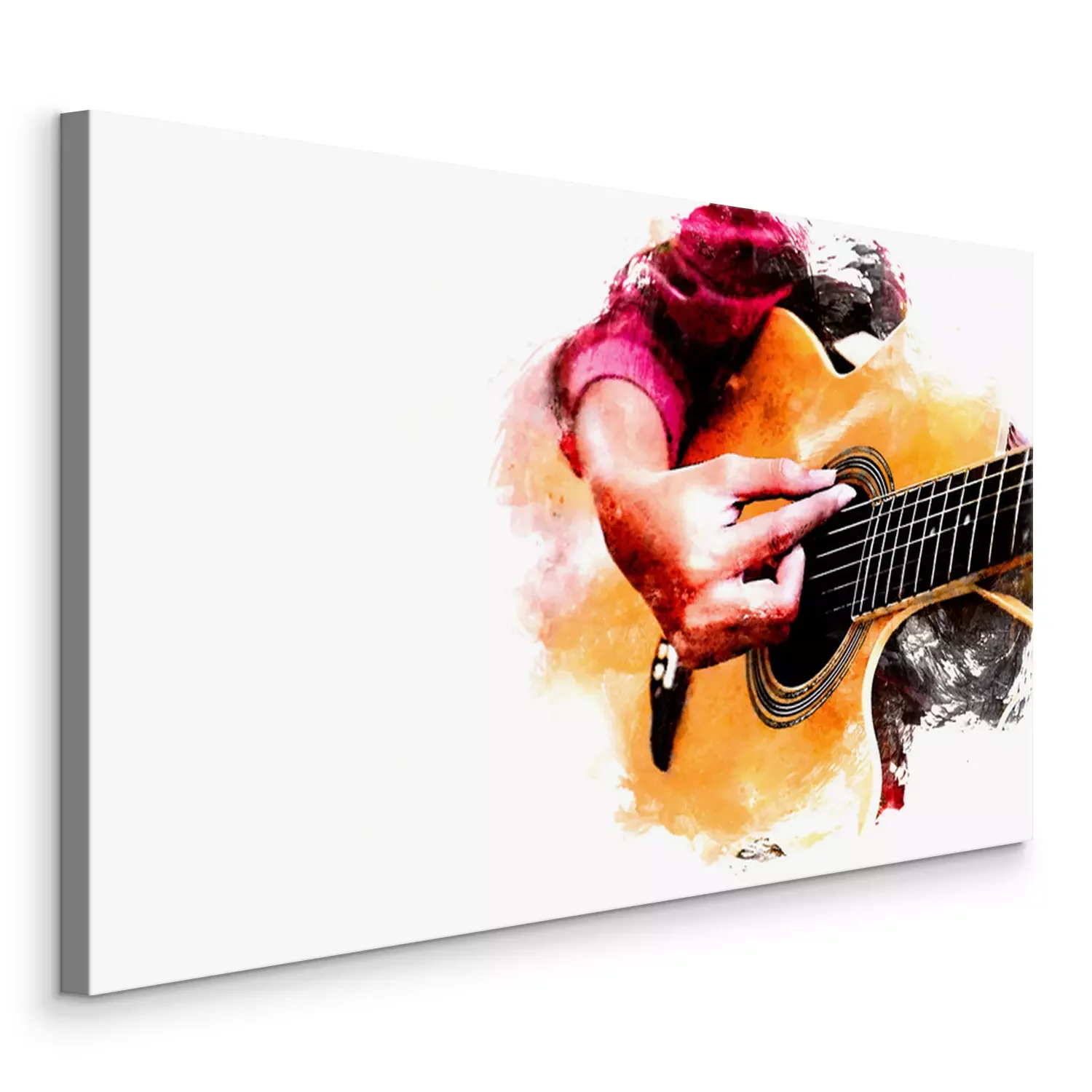 Canvas Sluit omhoog mooie vrouw die akoestische gitaar spelen bij het lopen van straat op waterverf het schilderen achtergrond.