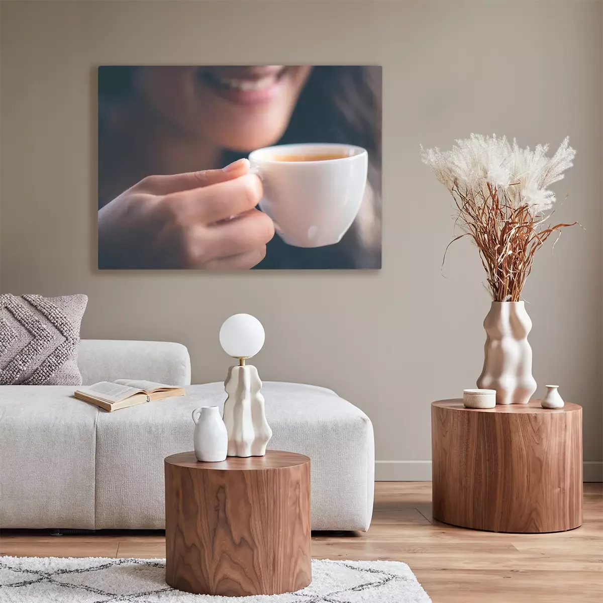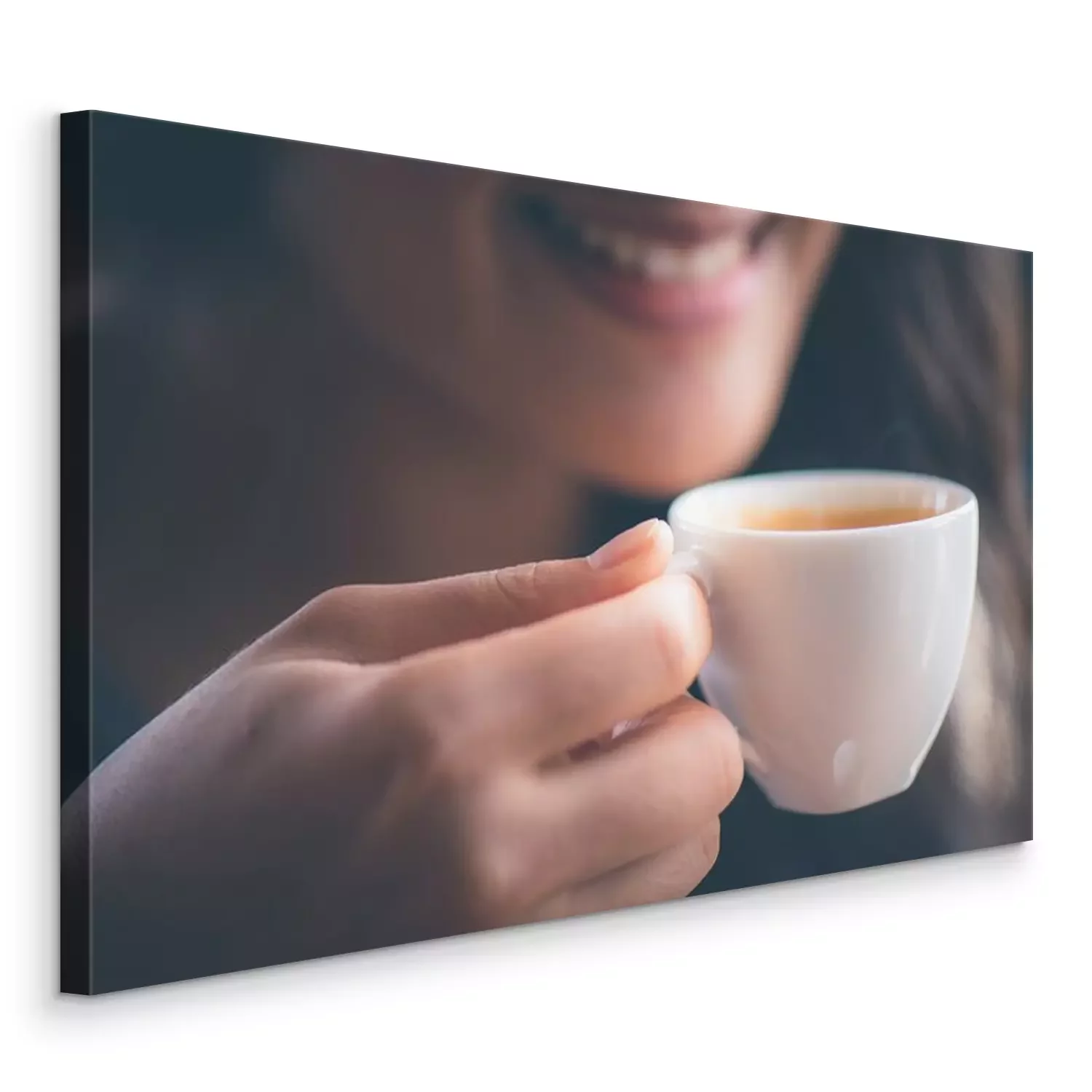 Canvas Smiling woman holing hot espresso coffee on hand at cafe in the morning