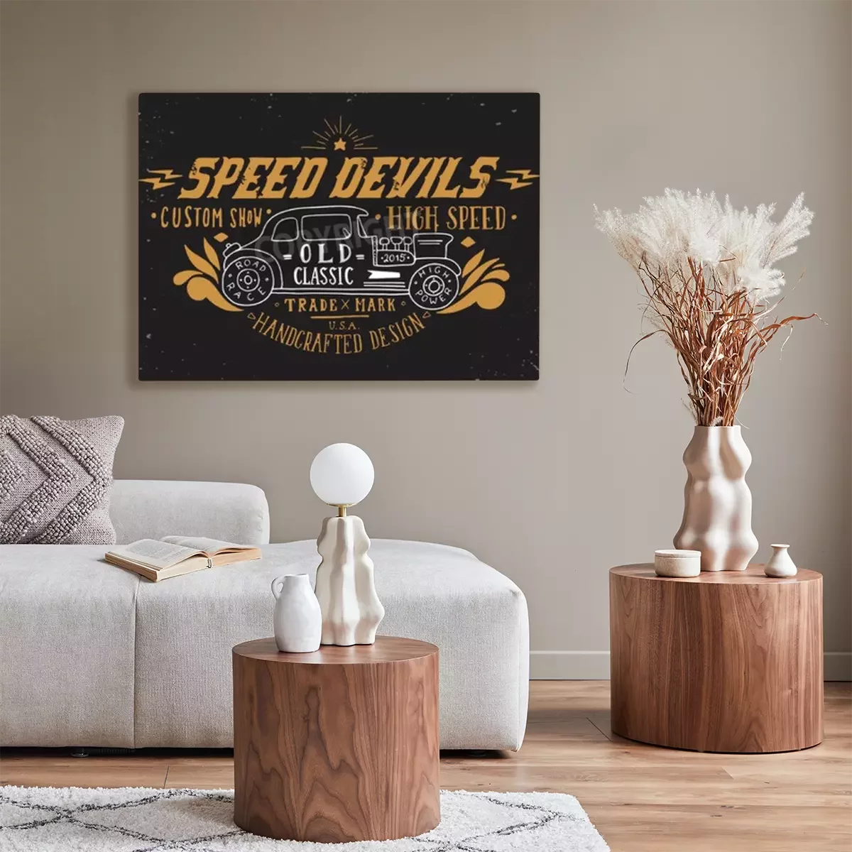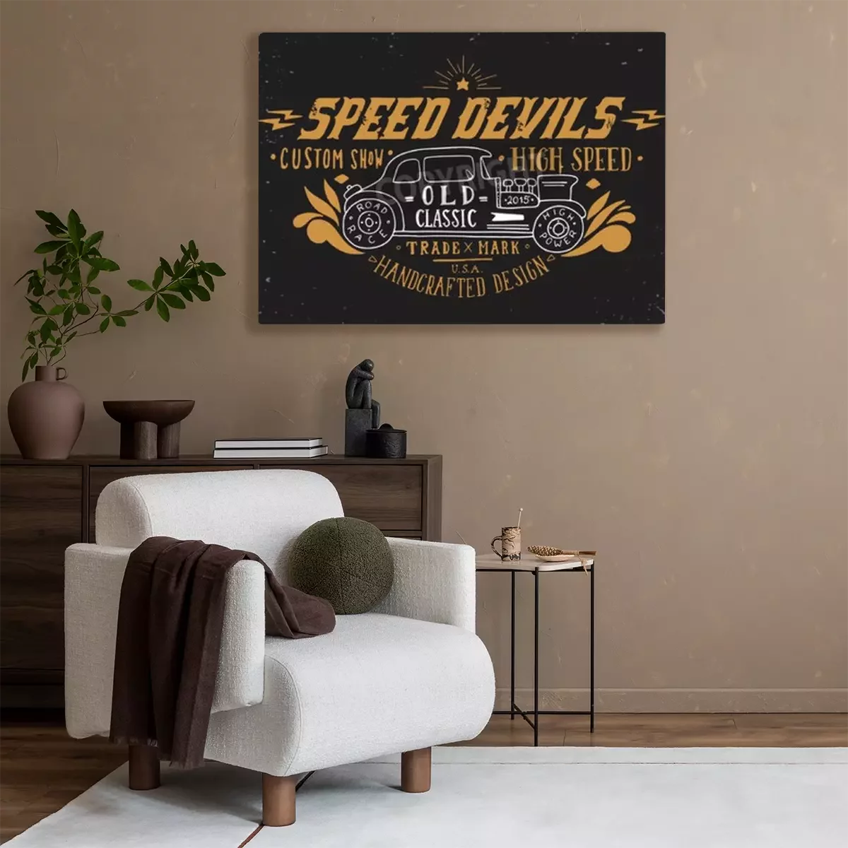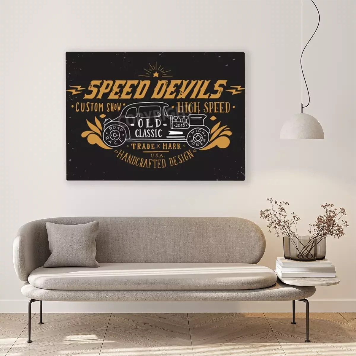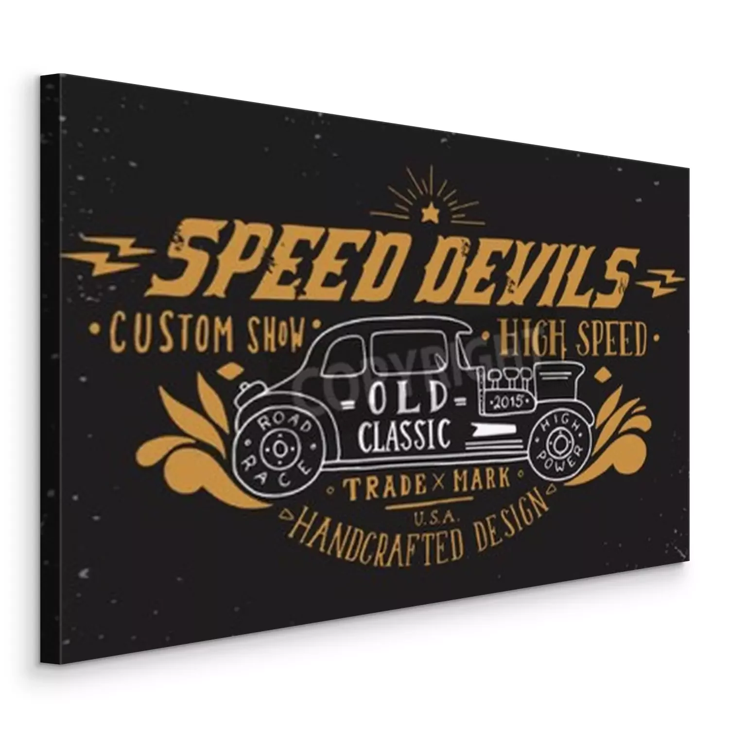 Canvas Snelheidsduivels. Hand getrokken grunge uitstekende illustratie met de hand belettering en een oldtimer auto. Deze illustratie kan worden gebruikt als een afdruk op t-shirts en tassen, stationaire of