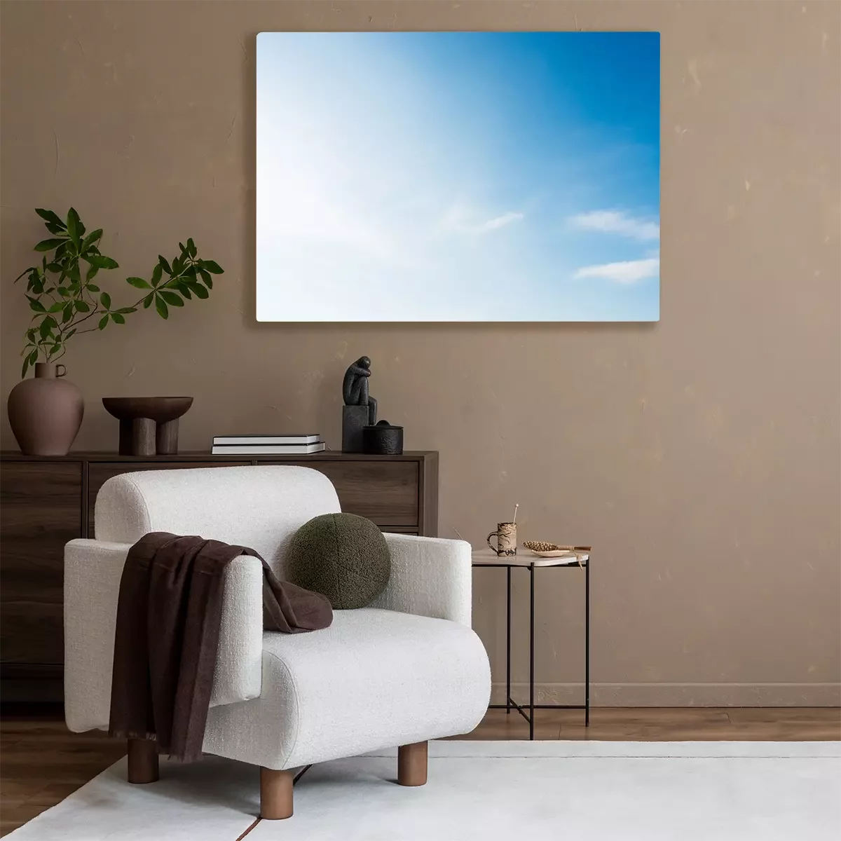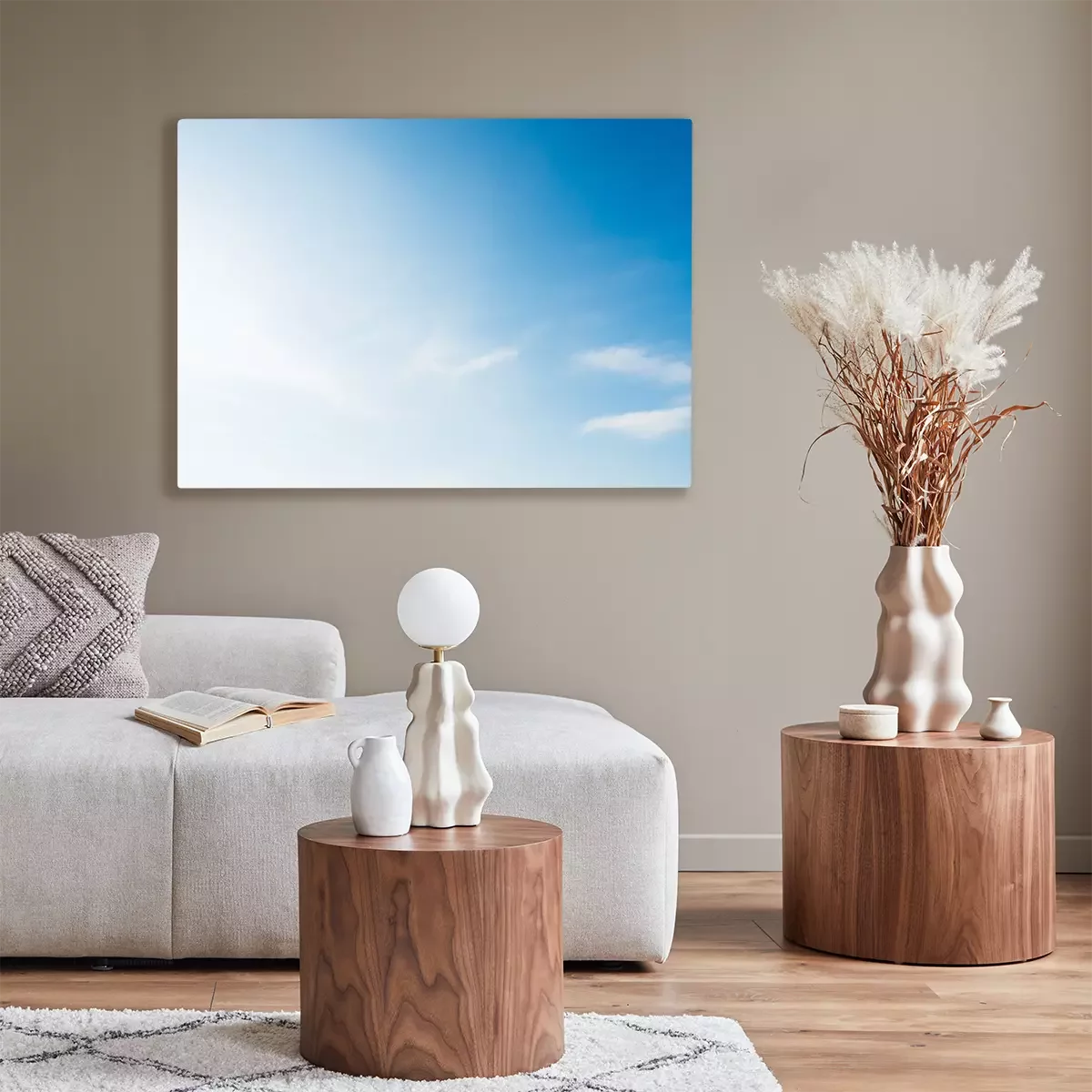 Canvas: Soft blue sky with small white clouds and bright sun light