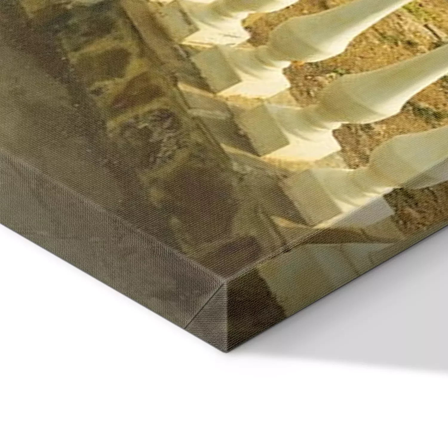 De print wordt aangebracht op hoogwaardig canvas dat op een schildersweefgetouw (spieraam) wordt gespannen. Omdat de print de zijranden bedekt, hoeft het ontwerp niet met een extra kader te worden omlijst. Wij raden ook composities aan die uit meerdere foto's bestaan en zo een coherente compositie vormen.