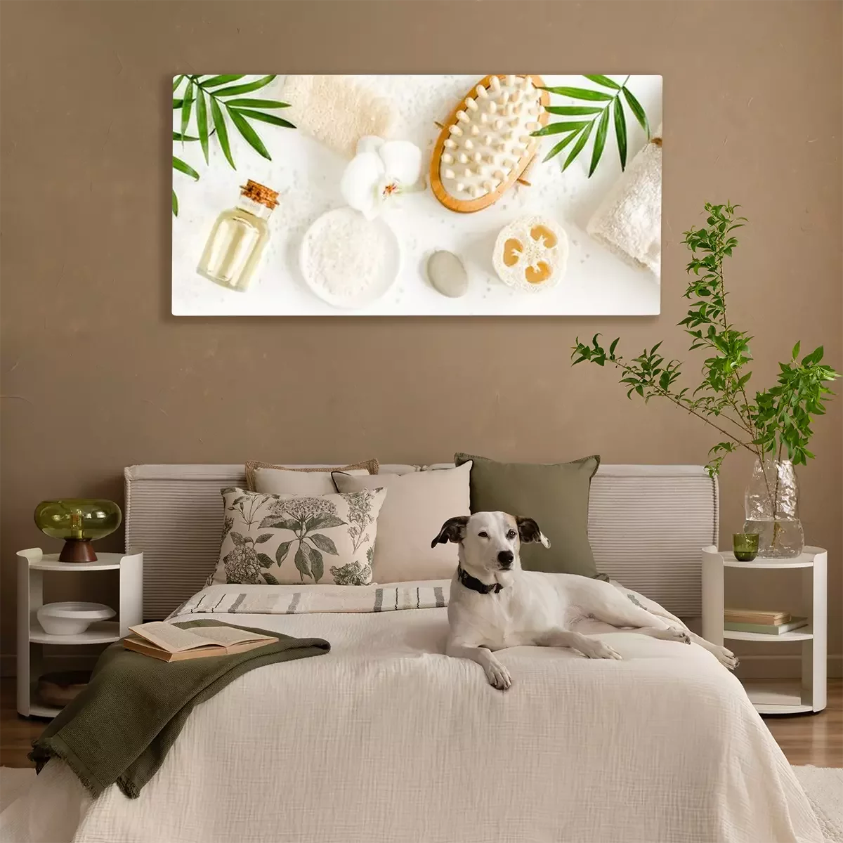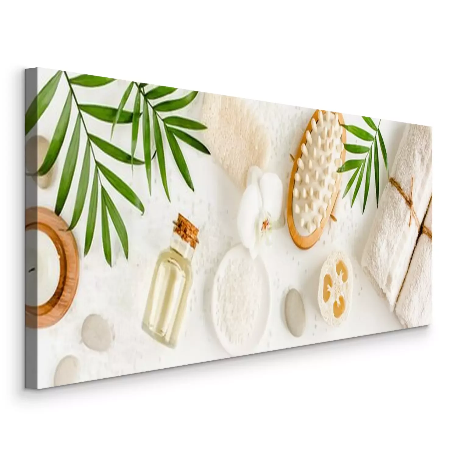 Canvas: Spa Background. Natural/Organic spa cosmetics products, eco friendly bathroom accessories, eucalyptus leaves. Skincare concept on white background. Flat lay, top view