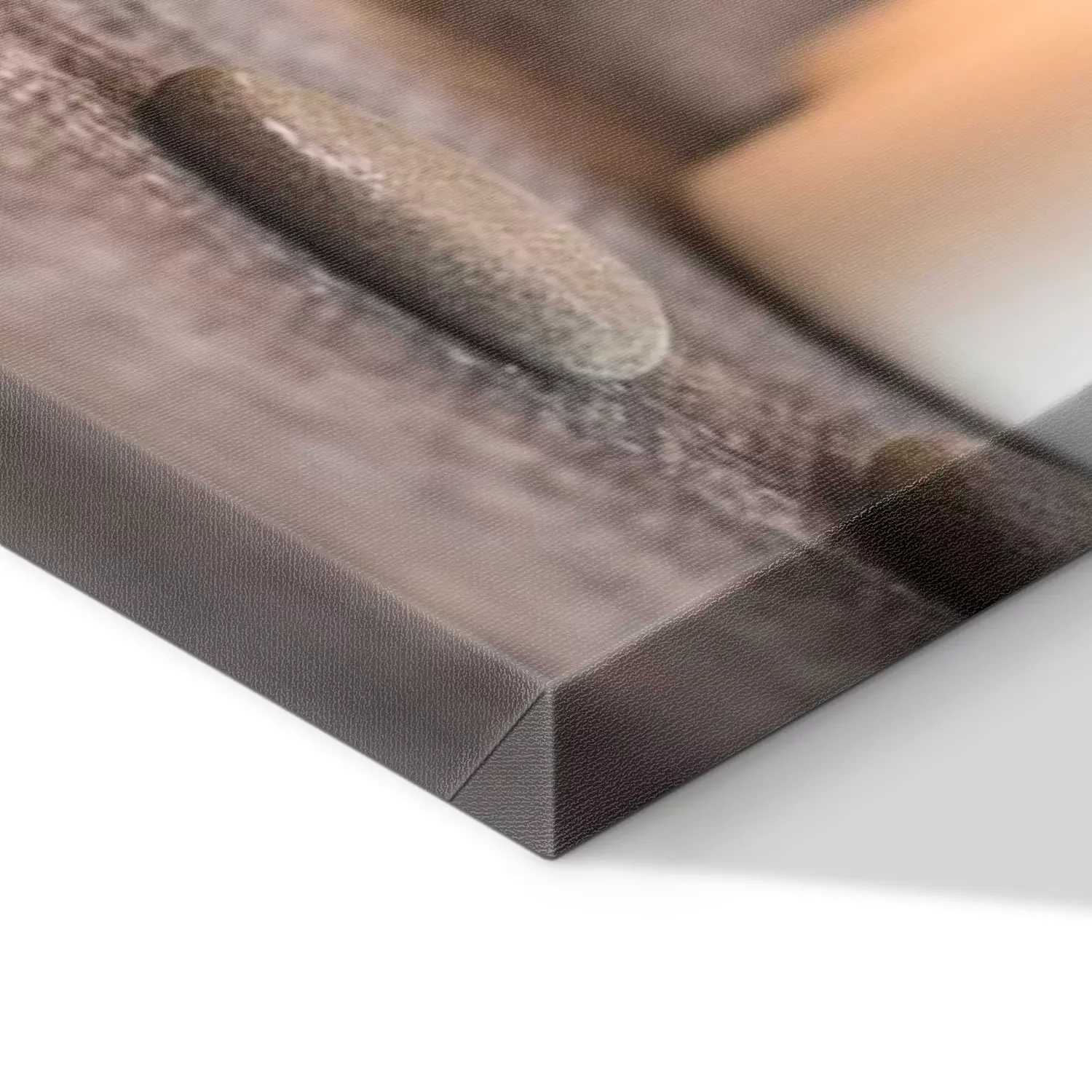 De print wordt aangebracht op hoogwaardig canvas dat op een schildersweefgetouw (spieraam) wordt gespannen. Omdat de print de zijranden bedekt, hoeft het ontwerp niet met een extra kader te worden omlijst. Wij raden ook composities aan die uit meerdere foto's bestaan en zo een coherente compositie vormen.