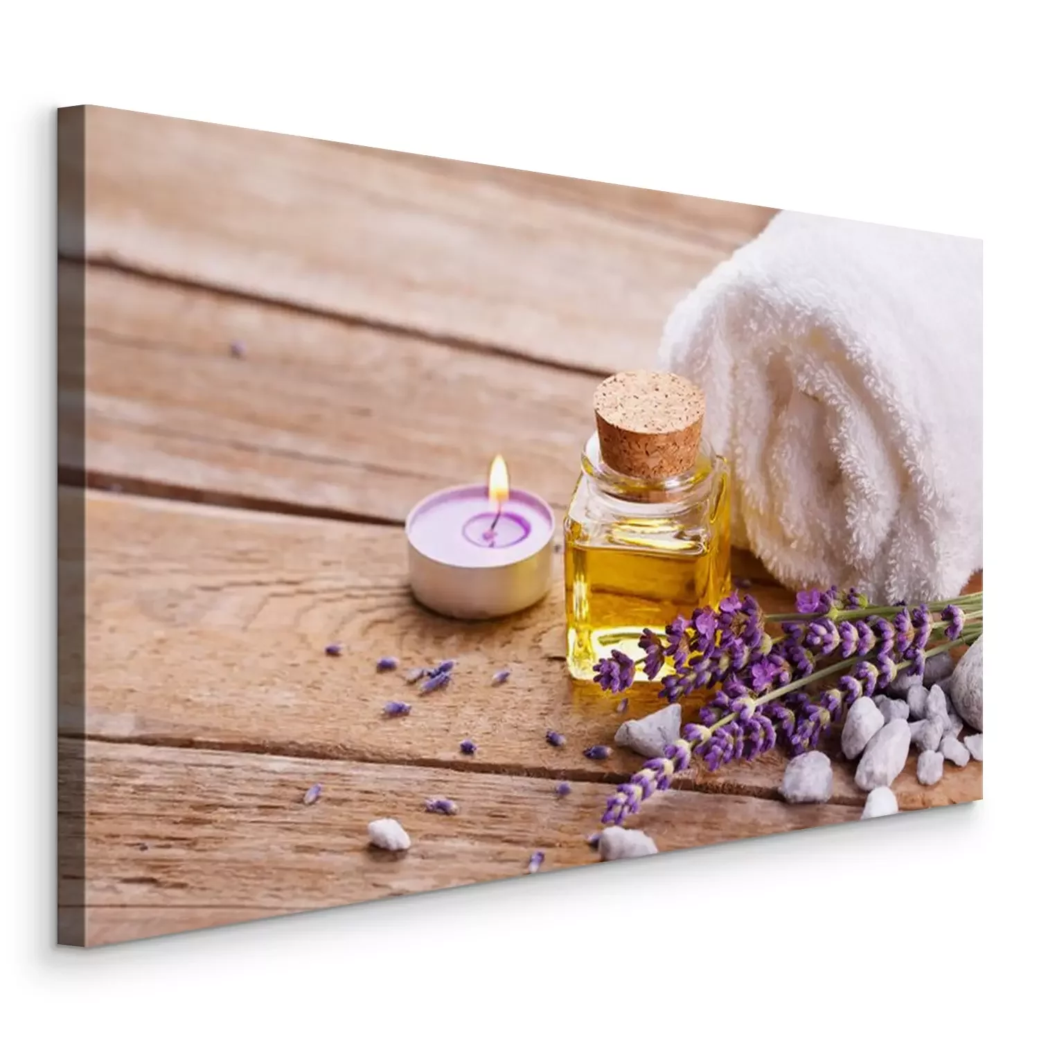Canvas: Spa stilleven met lavendelolie, witte handdoek en geparfumeerde kaars op hout