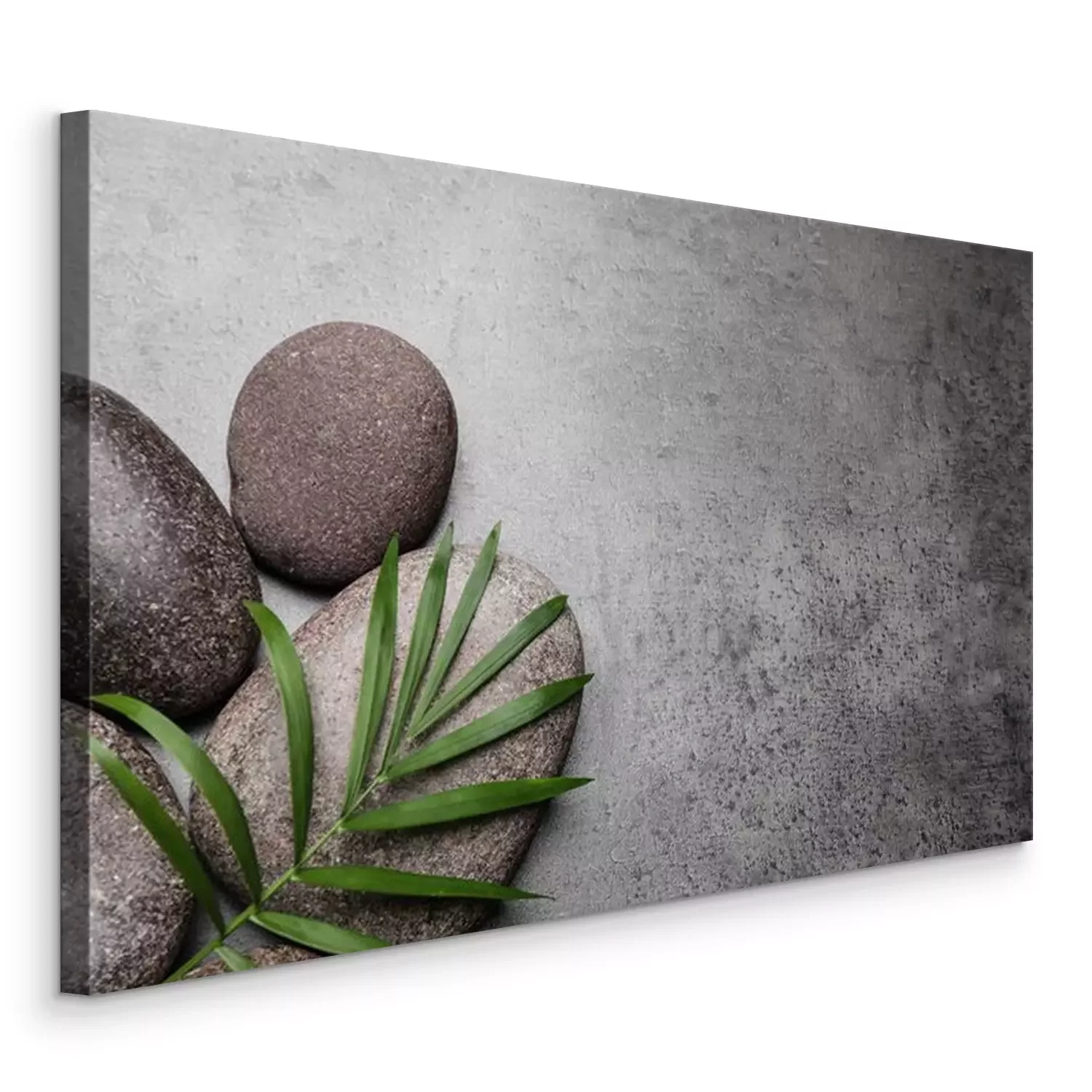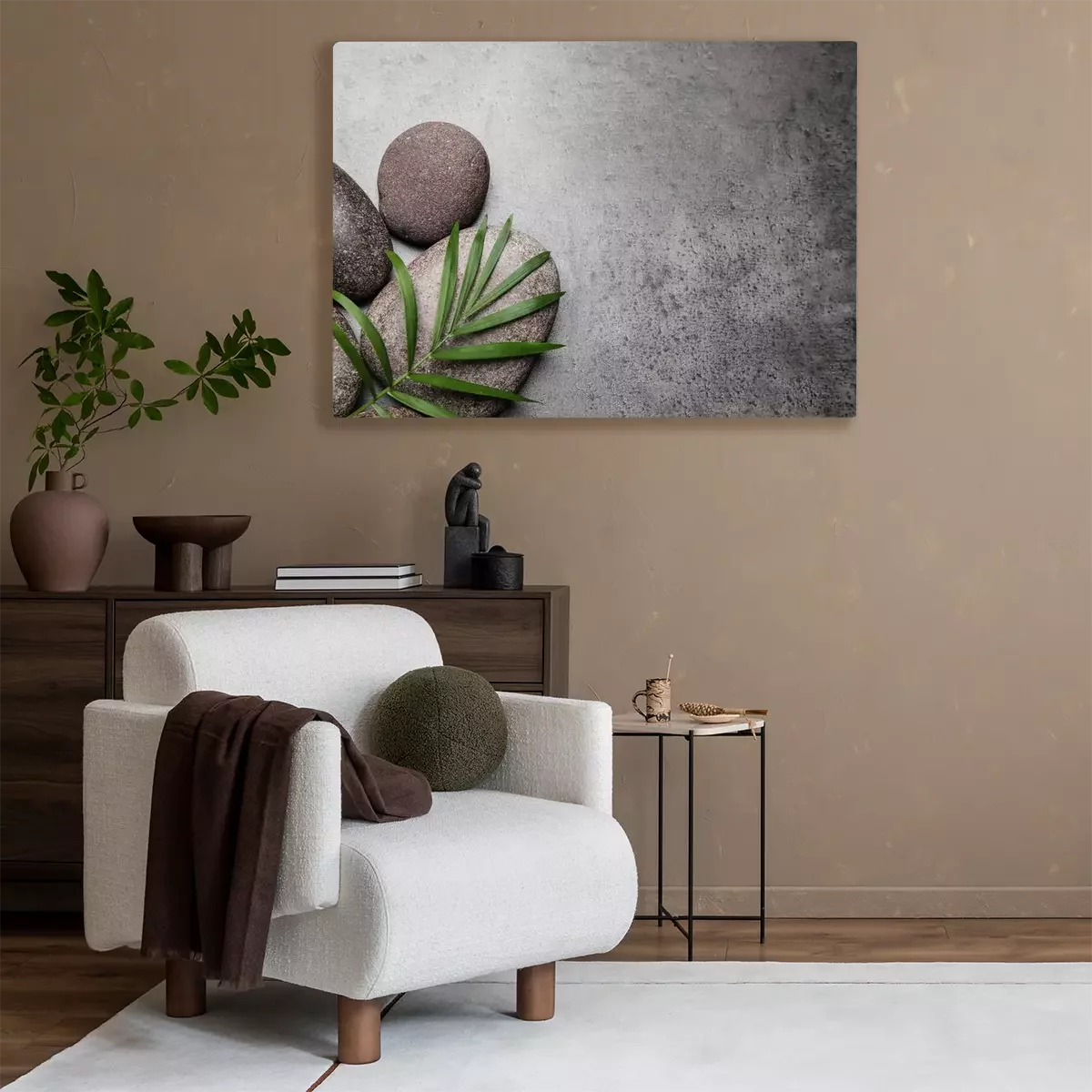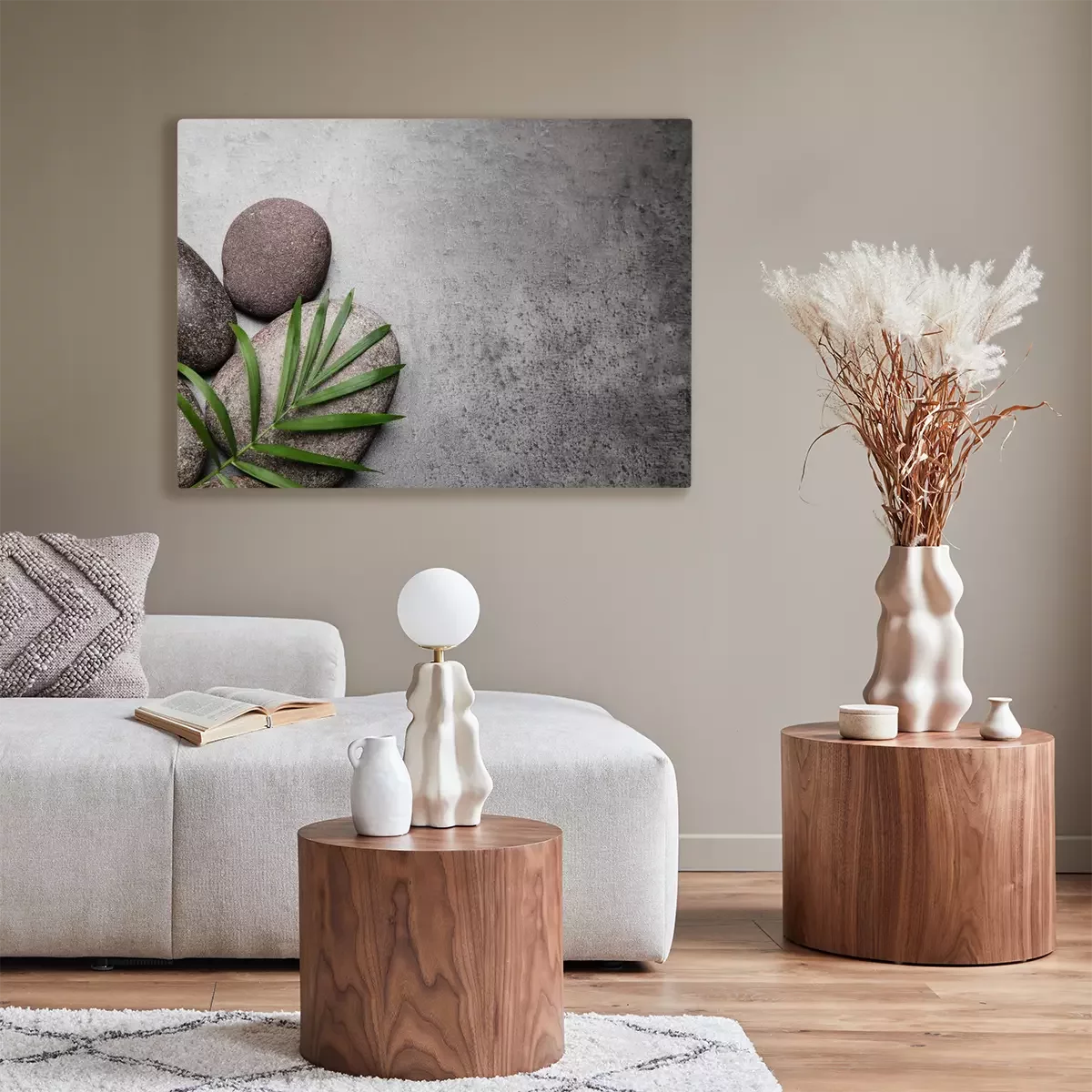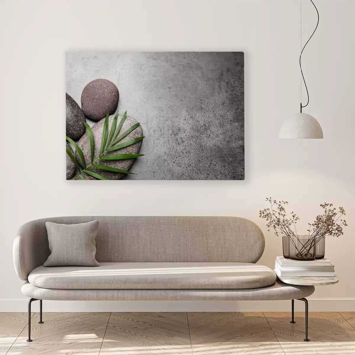 Canvas: Spa stones and palm leaf on grey table, flat lay. Space for text