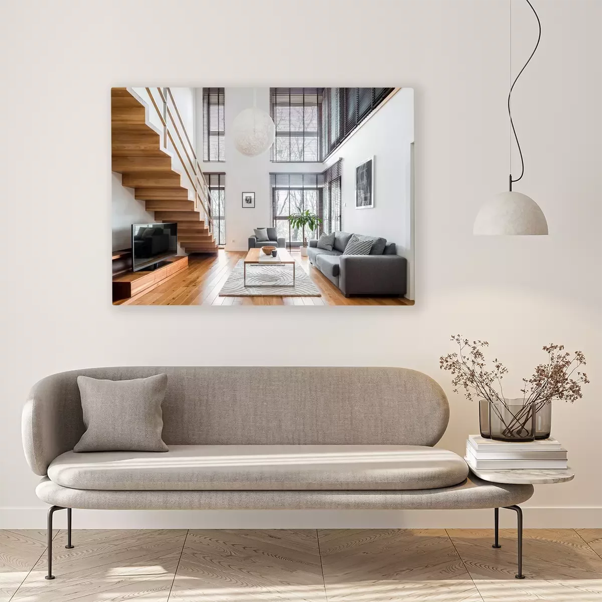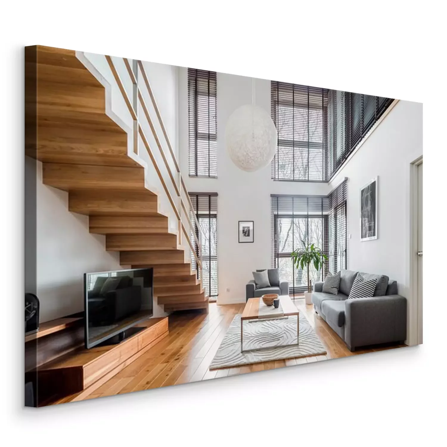 Canvas Spacious living room with wooden stairs