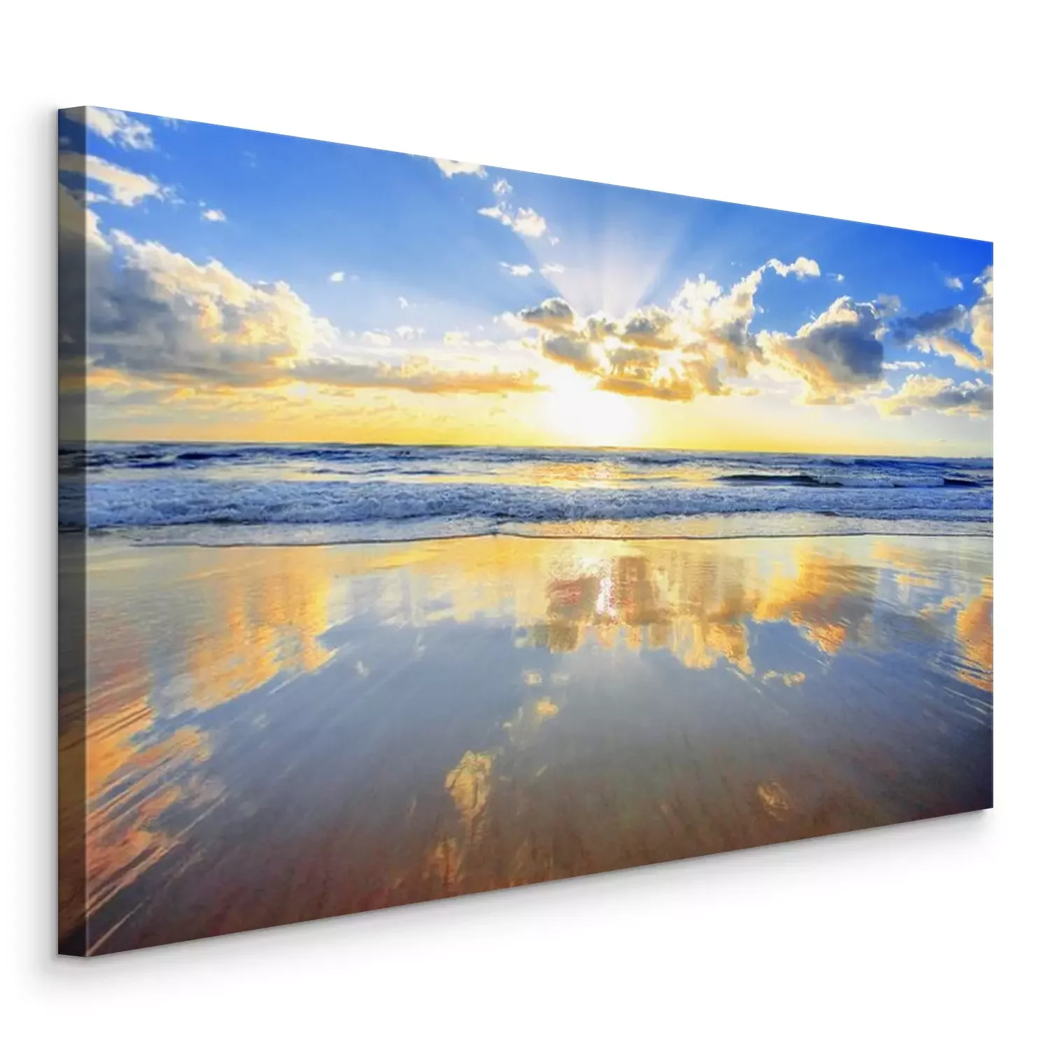 Canvas Spectaculaire gouden zonsopgang boven zee met een strand in voorgrond