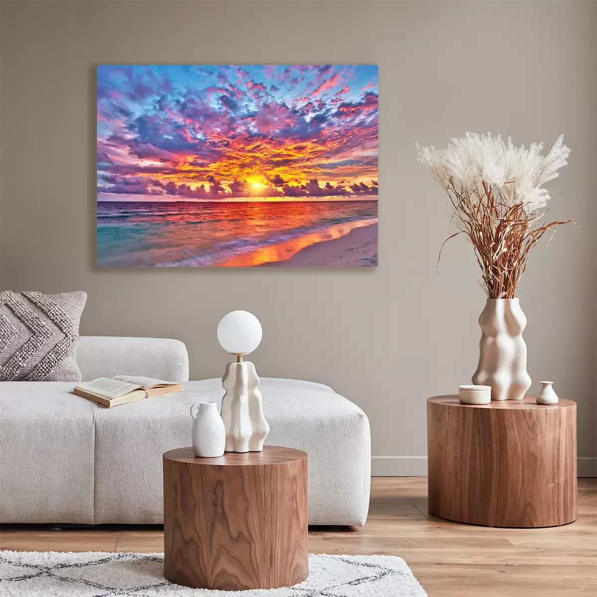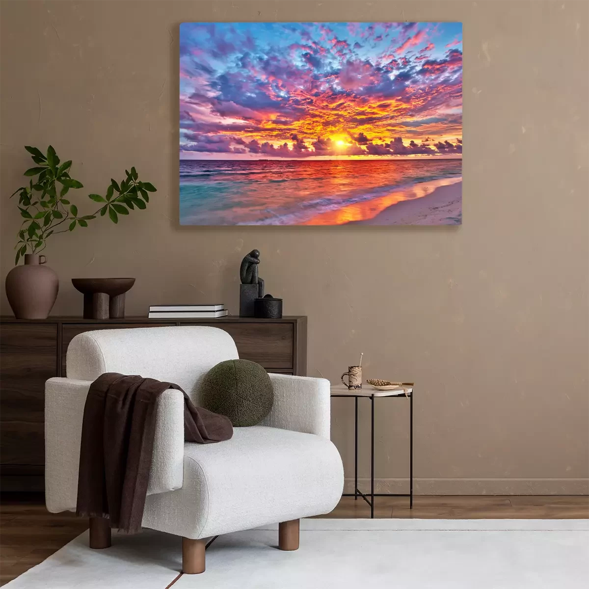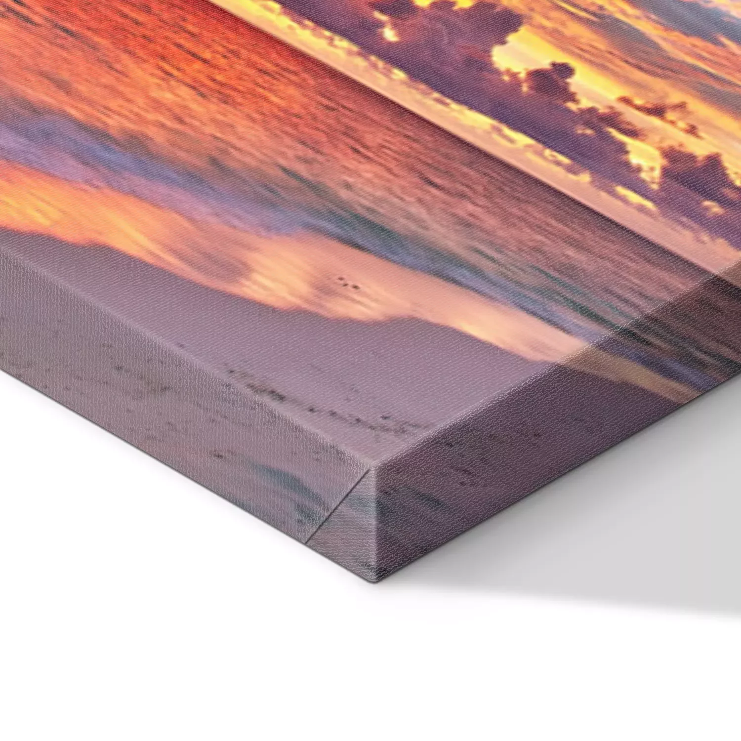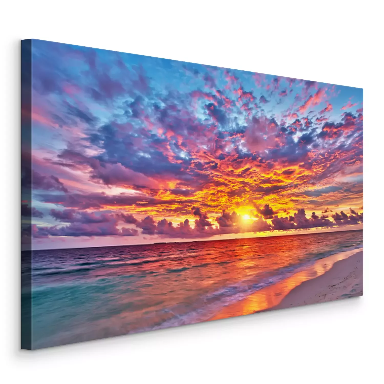 Breng een betoverende kleurenpracht in je kamer door een schilderachtig canvas aan de muur te hangen. Zonsondergang boven de zee stelt je in staat om te genieten van een spectaculair uitzicht, ongeacht waar je woont. Honderden kilometers kunnen je van de kust scheiden, maar toch zal het betoverende landschap deel uitmaken van je dagelijks leven. Wat meteen de aandacht trekt, is het prachtige kleurenpalet. De hemel schittert in alle kleuren en de door de zon verlichte wolken hebben een gouden gloed. Als je op zoek bent naar een decoratief accent dat zijn gelijke niet kent, is het hier gepresenteerde canvas een uitstekende keuze. Zee past niet alleen in een nautische setting. Landschappen zijn universeel en tijdloos. Dus als je van de kust houdt, kun je gerust zo'n patroon kiezen. Onze tip is om te kiezen voor een grootformaat canvas. Strand dat zich uitstrekt tot aan de horizon met een sprookjesachtige hemel zal er geweldig uitzien op een grote foto. De juiste schaal van de voorstelling zal de ware majesteit van de zee weergeven. Een uitstekende plek om het canvas tentoon te stellen zou een romantische slaapkamer zijn met pastelkleurige textiel en rieten accenten. Op deze manier kun je een zorgeloze en vakantieachtige sfeer creëren die zeker zal bijdragen aan ontspanning en rust. Ook in de woonkamer zal dit pittoreske canvas er fantastisch uitzien. Zonsondergang zal door de intense kleurenpracht een sterk dominant element van de inrichting worden, waardoor een kamer die voorheen uitdrukkingsloos was, karakter krijgt. Omdat onze muurdecoraties van hoogwaardige materialen zijn gemaakt, staat niets in de weg om zo'n canvas ook in de badkamer op te hangen. Zee zal op deze manier een prachtige achtergrond worden voor ontspannende baden, waardoor een gewone inrichting verandert in een thuis-spa. De natuur kalmeert niet alleen de zintuigen, maar is ook adembenemend mooi, dus als je op zoek bent naar een prachtige en tijdloze interieurdecoratie, is het de moeite waard om voor zo'n canvas te kiezen. Strand met een spectaculaire zonsondergang laat je genieten van de majesteit van de zee, waar je ook woont!